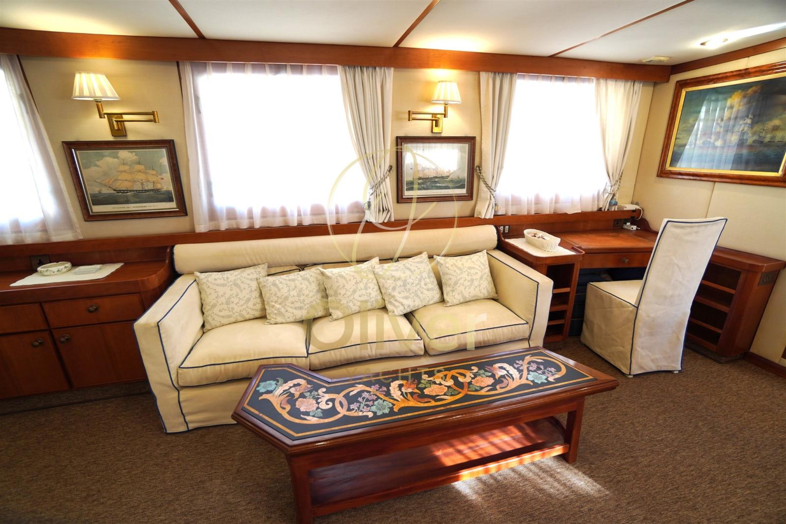 Une harmonie de style : chaque pièce est soignée dans les moindres détails, avec une harmonie de couleurs et de formes qui crée une atmosphère élégante et sophistiquée. Le salon principal est le cœur battant du yacht, avec de grandes fenêtres offrant une vue imprenable sur la mer et un décor qui invite à la détente et à la conversation.