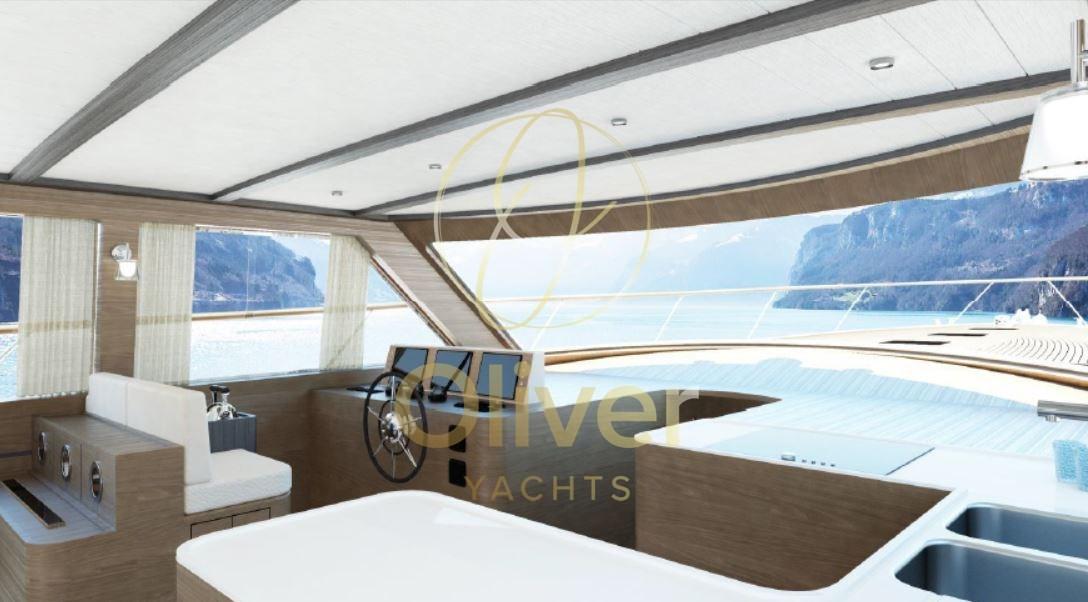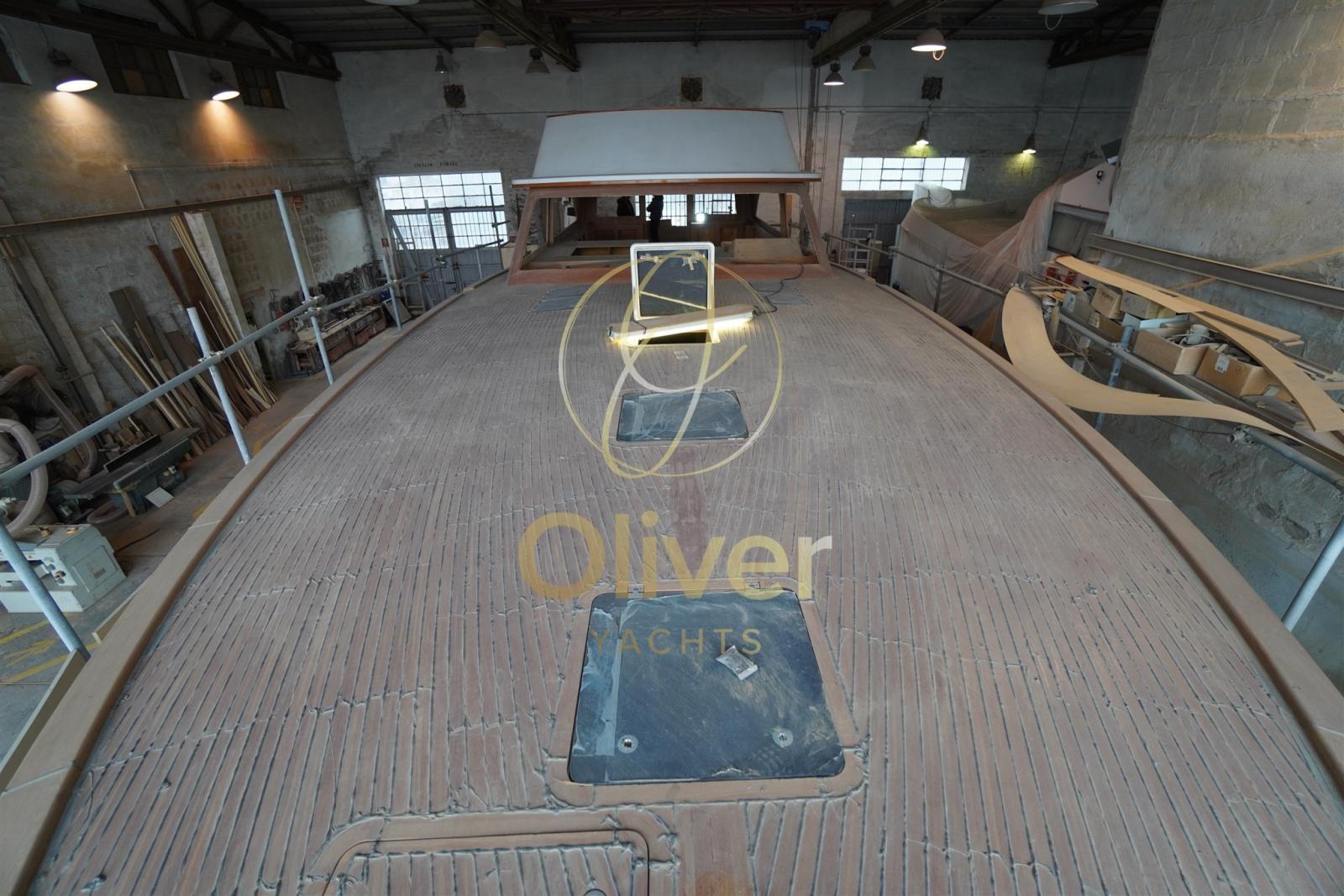 Coque composée de 5 couches de cadres en acajou lamellé-collé croisé, Ingénierie conforme aux normes ISO et à l’expérience des charpentiers du chantier, Pont avec rouf, flybridge et pont plat, Bain de soleil avant qui devient un grand salon, Trappes affleurantes pour une excellente ventilation des pièces en dessous