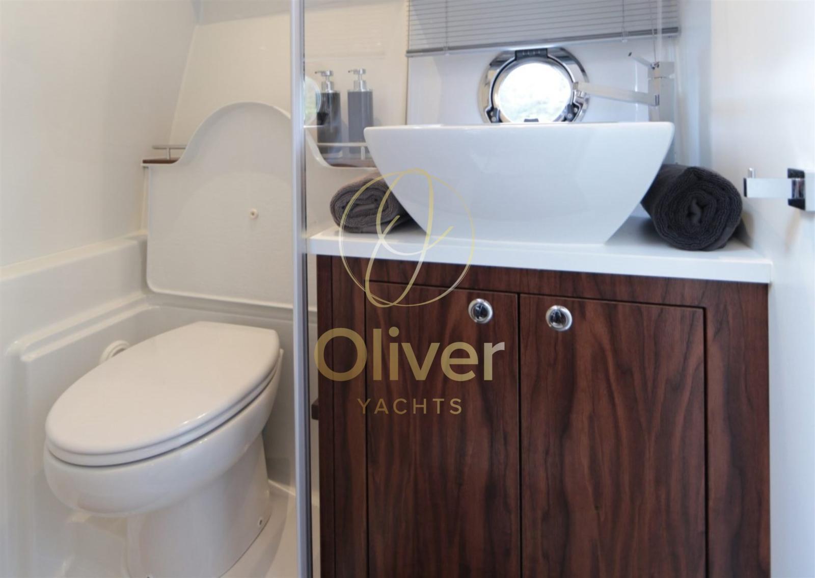 En montant à bord, vous êtes accueillis dans une dînette avec un canapé en forme de U sur le côté tribord tandis que sur le côté bâbord se trouve la grande cuisine avec évier, cuisinière à induction, réfrigérateur et un plan de travail généreux. Vers la proue, sur le côté tribord, se trouve le poste de pilotage avec deux positions pour le pilote et le copilote, tandis que sur le côté bâbord, il y a une troisième position. En passant sous le pont, vers la proue, se trouve la cabine du propriétaire avec une boîte qui peut être convertie de la taille normale à la taille king. Sur la gauche se trouve la salle de bain avec lavabo, WC et douche. Au milieu du navire, en entrant par la porte tribord, vous entrez dans la deuxième cabine avec un lit double généreux.