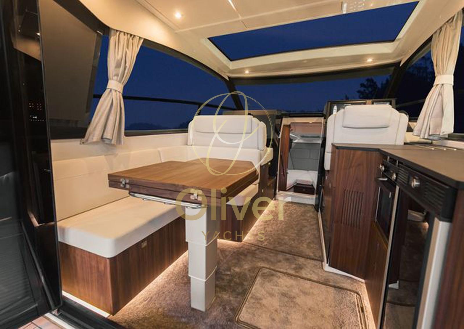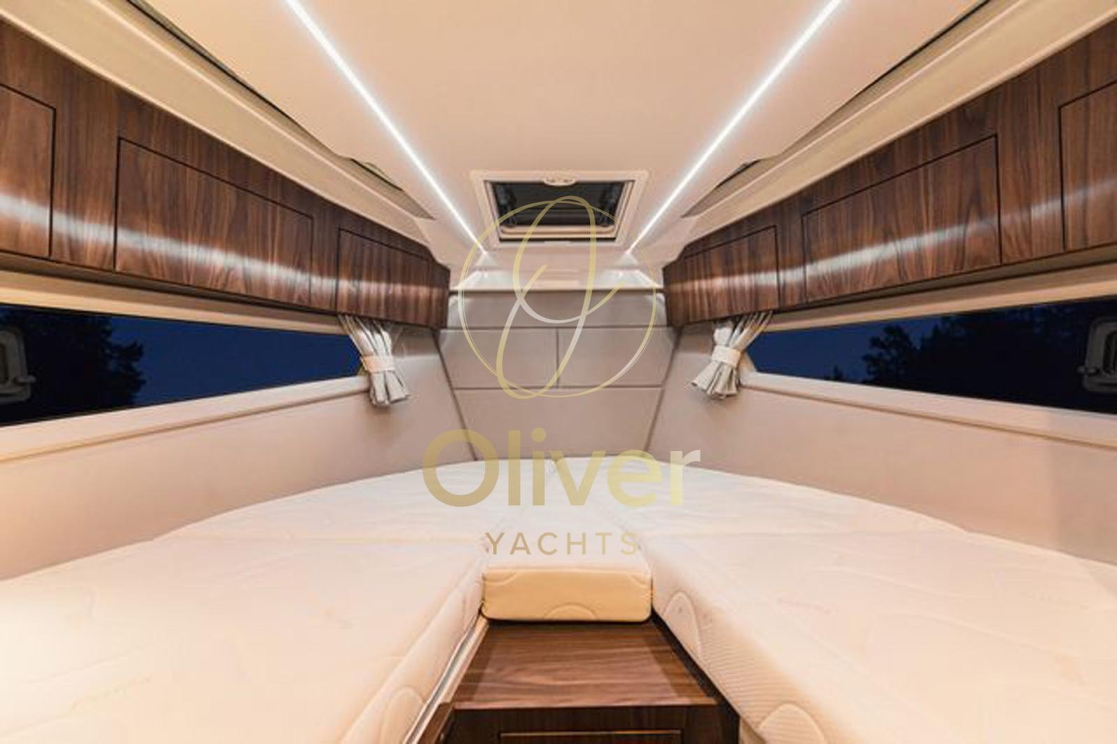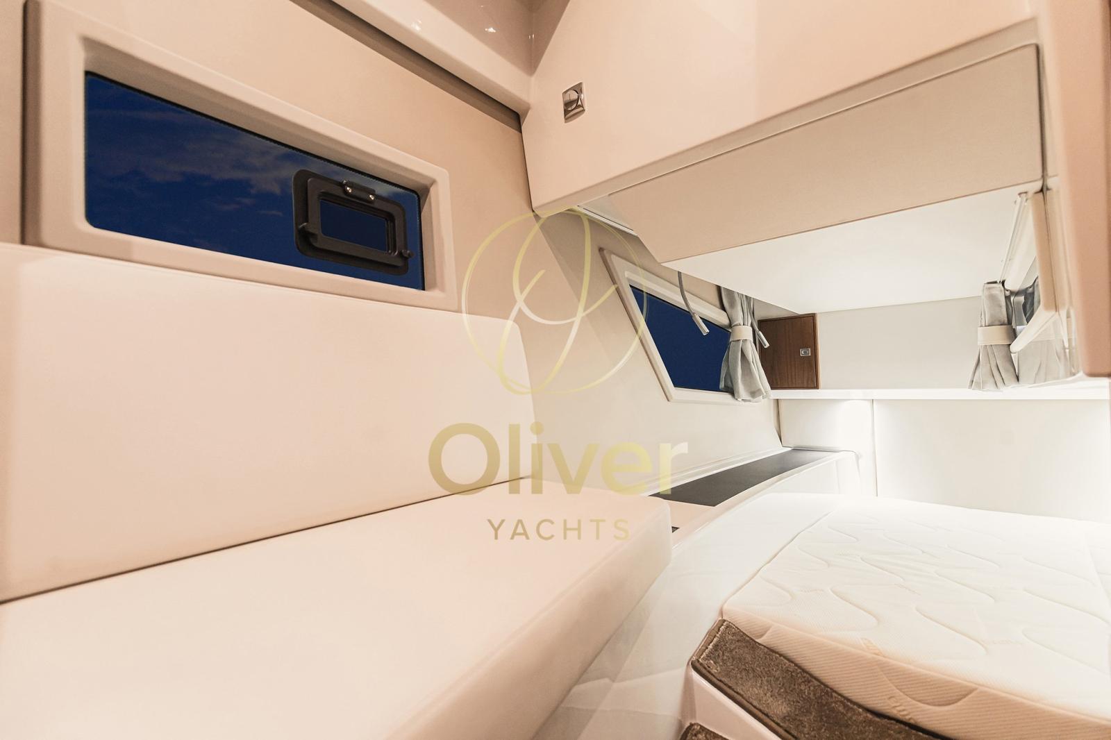 L’intérieur de la 30 CA se caractérise par un design moderne et raffiné, avec des finitions en bois précieux et des tissus de haute qualité. L’aménagement comprend une cuisine complète, un coin repas avec un canapé en forme de L, un poste de pilotage ergonomique et deux cabines séparées. La cabine principale est équipée d’un lit double, d’une salle de bain attenante et d’une armoire. La deuxième cabine peut accueillir deux personnes et est desservie par une deuxième salle de bain.