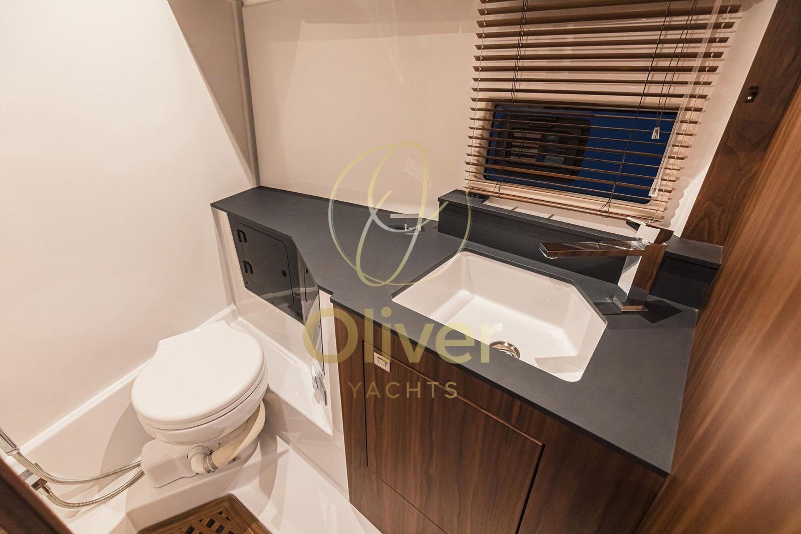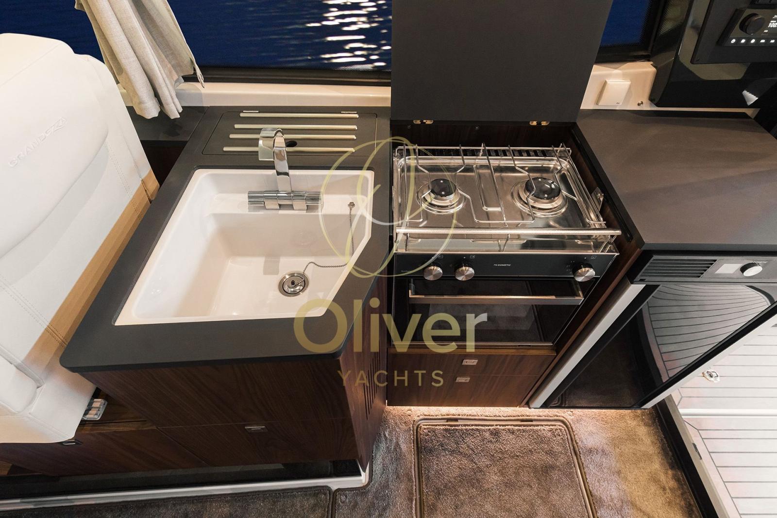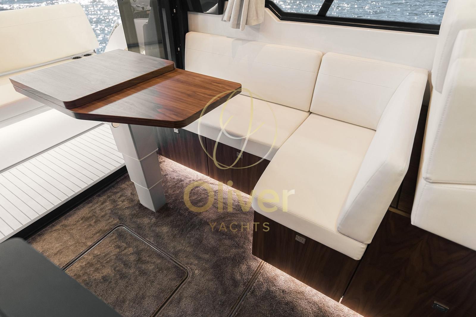 L’intérieur de la 30 CA se caractérise par un design moderne et raffiné, avec des finitions en bois précieux et des tissus de haute qualité. L’aménagement comprend une cuisine complète, un coin repas avec un canapé en forme de L, un poste de pilotage ergonomique et deux cabines séparées. La cabine principale est équipée d’un lit double, d’une salle de bain attenante et d’une armoire. La deuxième cabine peut accueillir deux personnes et est desservie par une deuxième salle de bain.