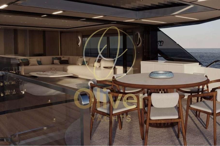 En plus des espaces intérieurs standard, le Majesty 111 offre une gamme d’espaces extérieurs qui vous permettent de profiter pleinement de la vie en mer. Le pont supérieur est équipé d’un grand bain de soleil avec jacuzzi, bar et espace barbecue, tandis que le club de plage offre un accès direct à la mer via une plate-forme rétractable.