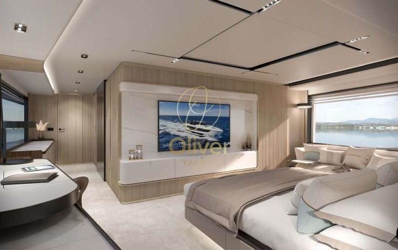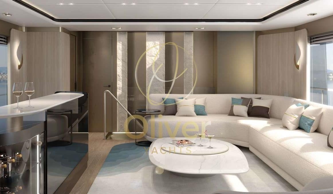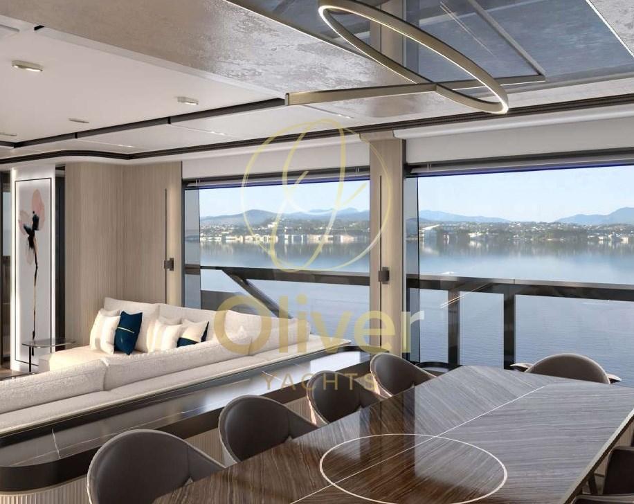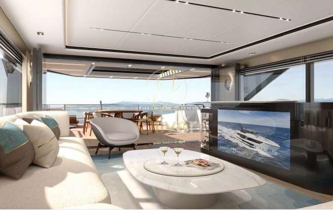 En entrant dans le yacht, vous êtes accueilli par un grand espace de vie sur le pont principal, doté d’un design moderne et minimaliste. Un canapé en forme de L et des fauteuils disposés autour de tables basses créent une atmosphère chaleureuse et accueillante, parfaite pour se détendre ou socialiser avec des invités. L’espace de vie est agrémenté d’éléments décoratifs précieux, tels que des sculptures, des tapis et des œuvres d’art, qui donnent à l’environnement une touche de classe et de raffinement.