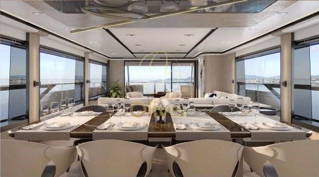 En continuant vers la proue, il y a la salle à manger, composée d’une grande table à manger et de chaises ergonomiques recouvertes de cuir fin. La salle à manger est éclairée par un lustre en cristal en cascade qui crée une atmosphère élégante et raffinée.