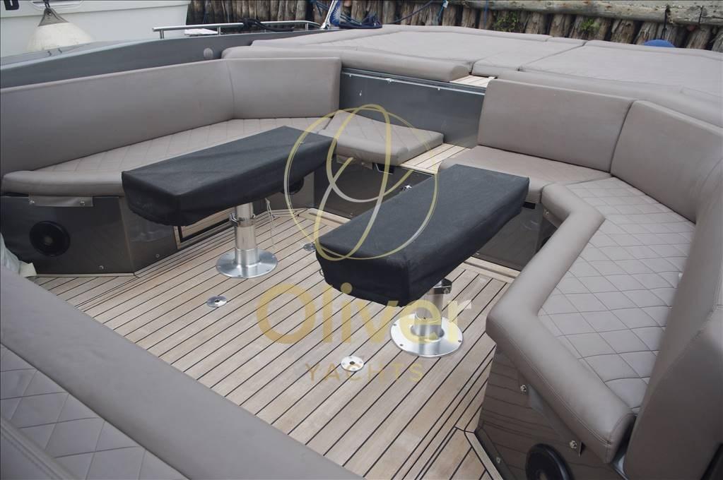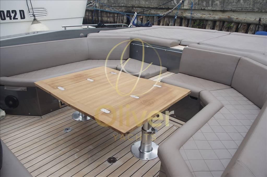 La taille du cockpit est surprenante, meublé de canapés, de fauteuils et d’un meuble de cuisine. Même à l’avant, il a été préféré d’organiser un salon avec de nombreux canapés qui offrent, dans tous les cas, la possibilité de s’allonger au soleil.