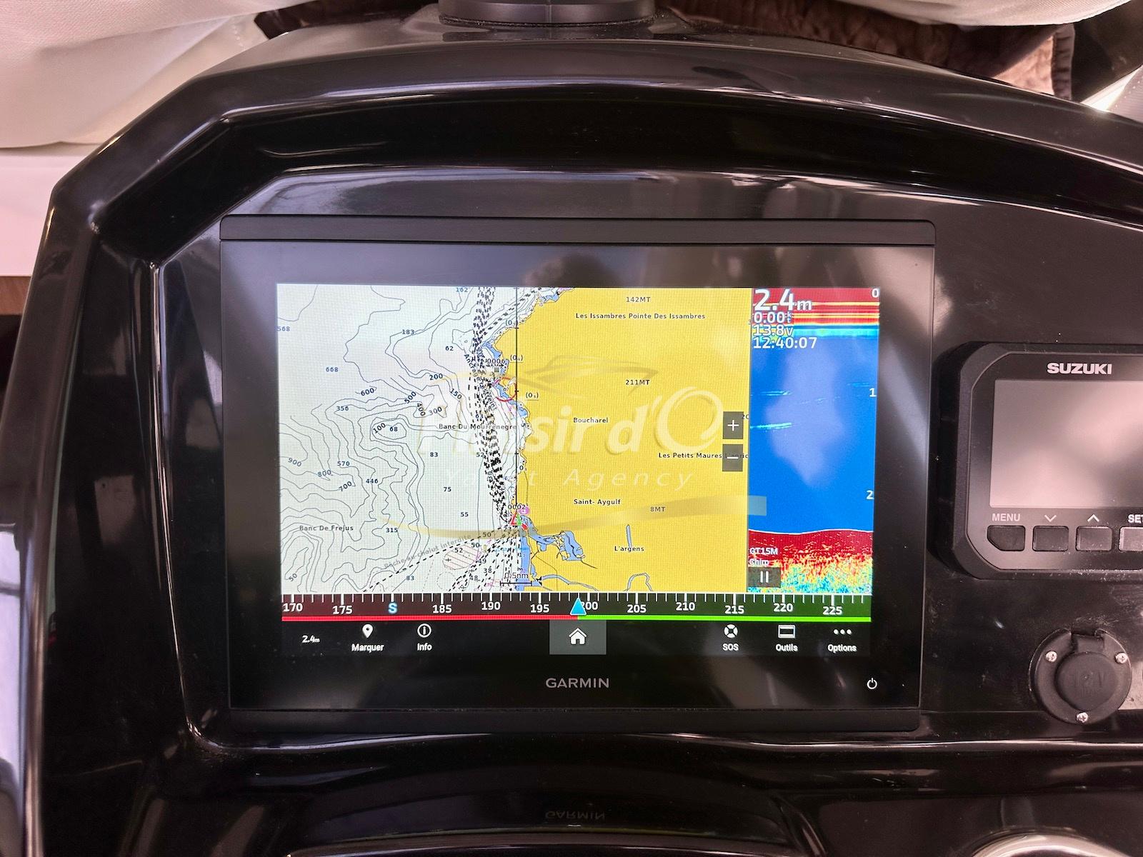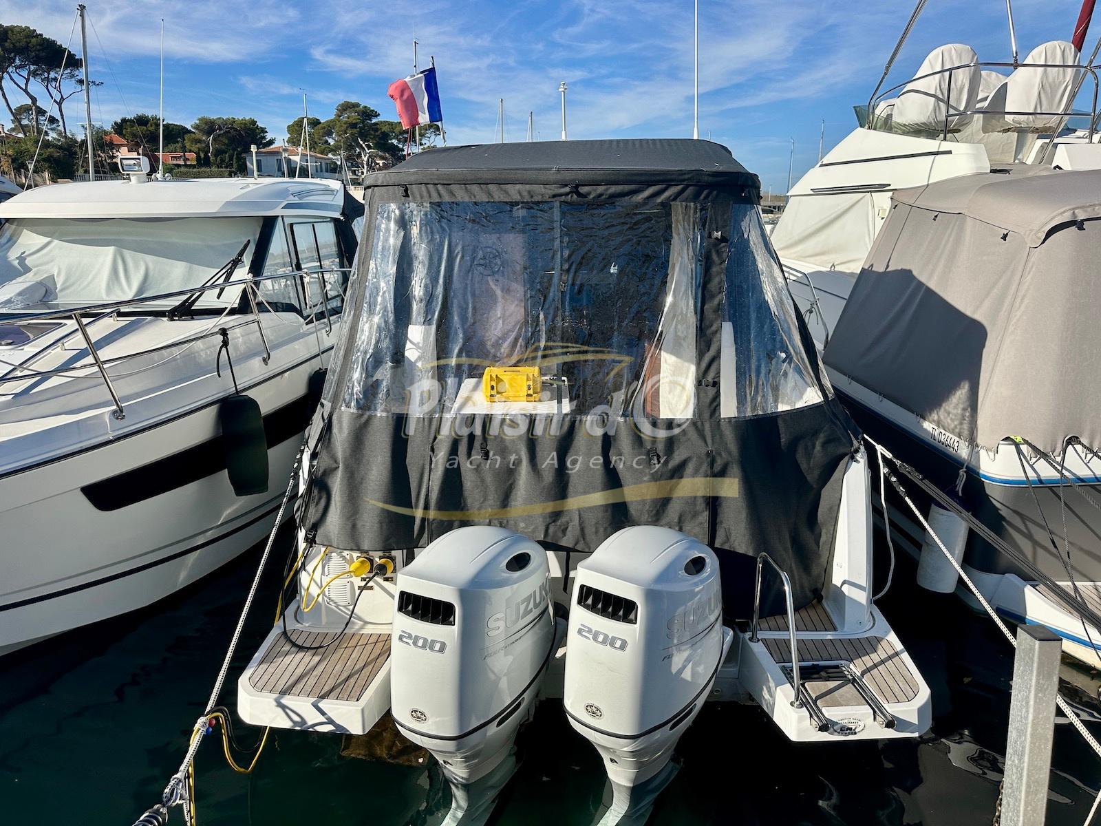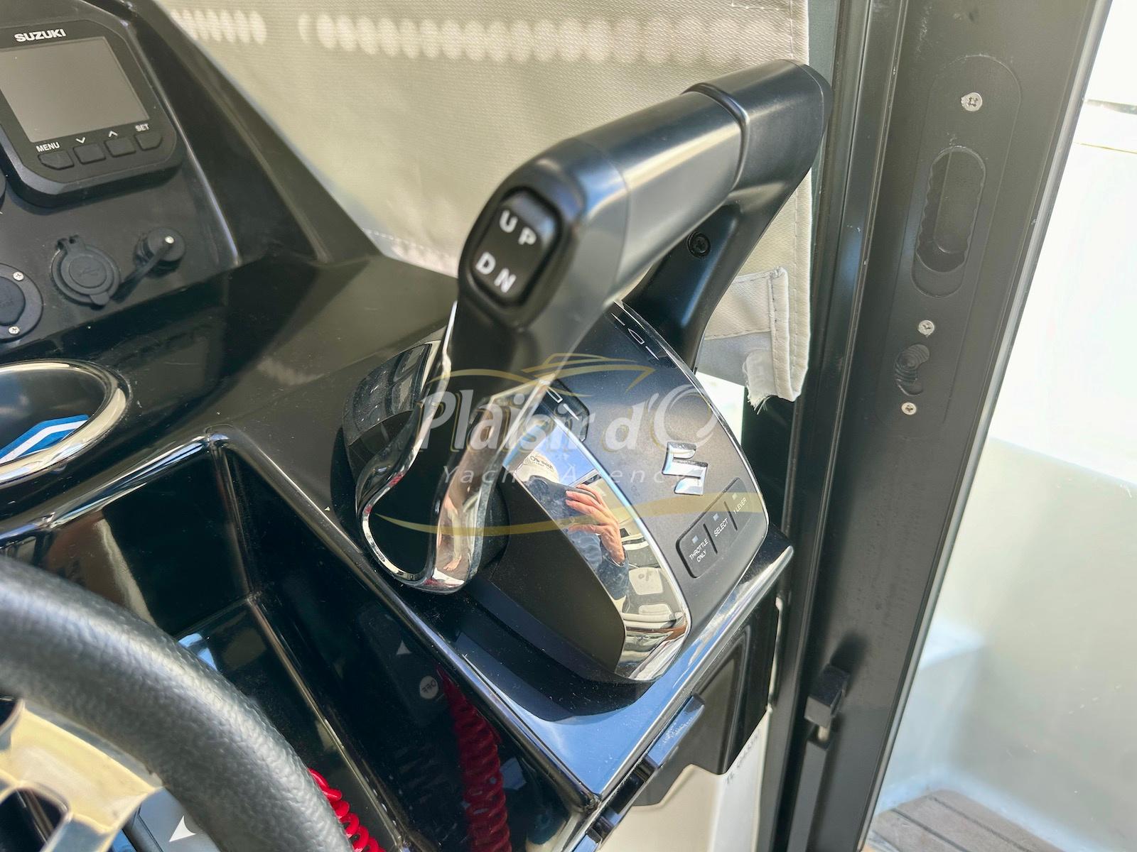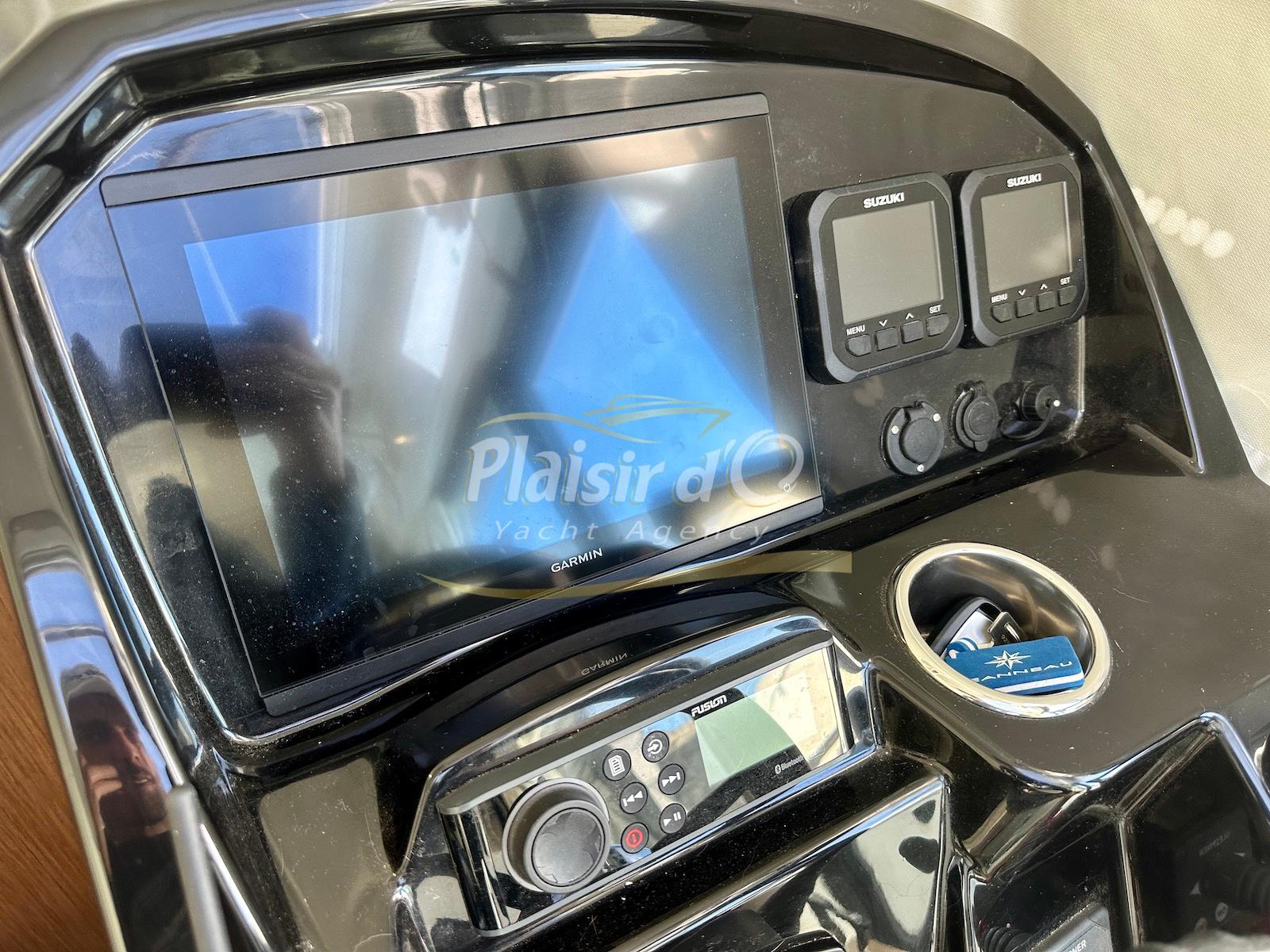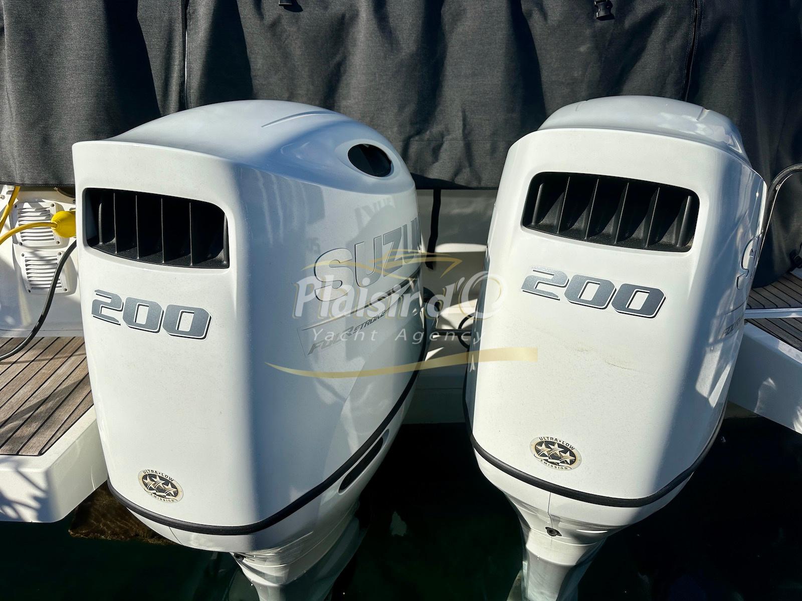 Full options : version offshore avec gros réservoir et grosse motorisation 2 x 200cv Suzuki en commandes électriques, climatisation revserible, cockpit teck, taud de camping, taud de soleil microperforé, compresseur d’air pour annexe intégré, micro ondes, frigo, WC marin, chauffe eau, chargeur, circuit 220v, guindeau électrique, GPS, VHF, carré convertible, bain de soleil avant et arrière, table de cockpit…