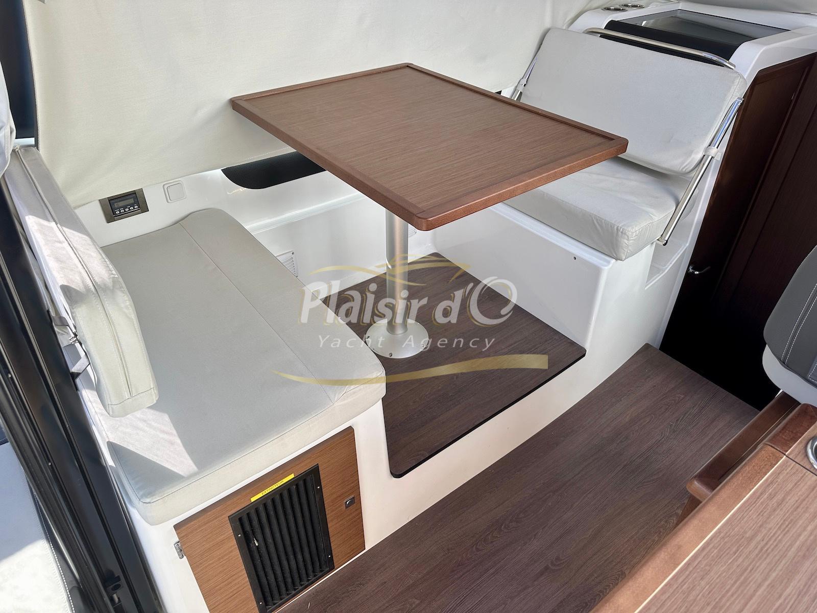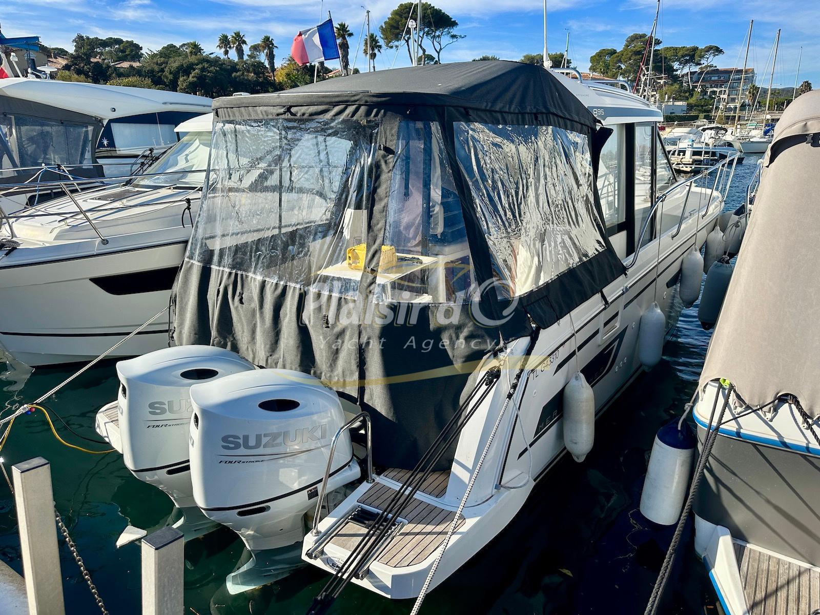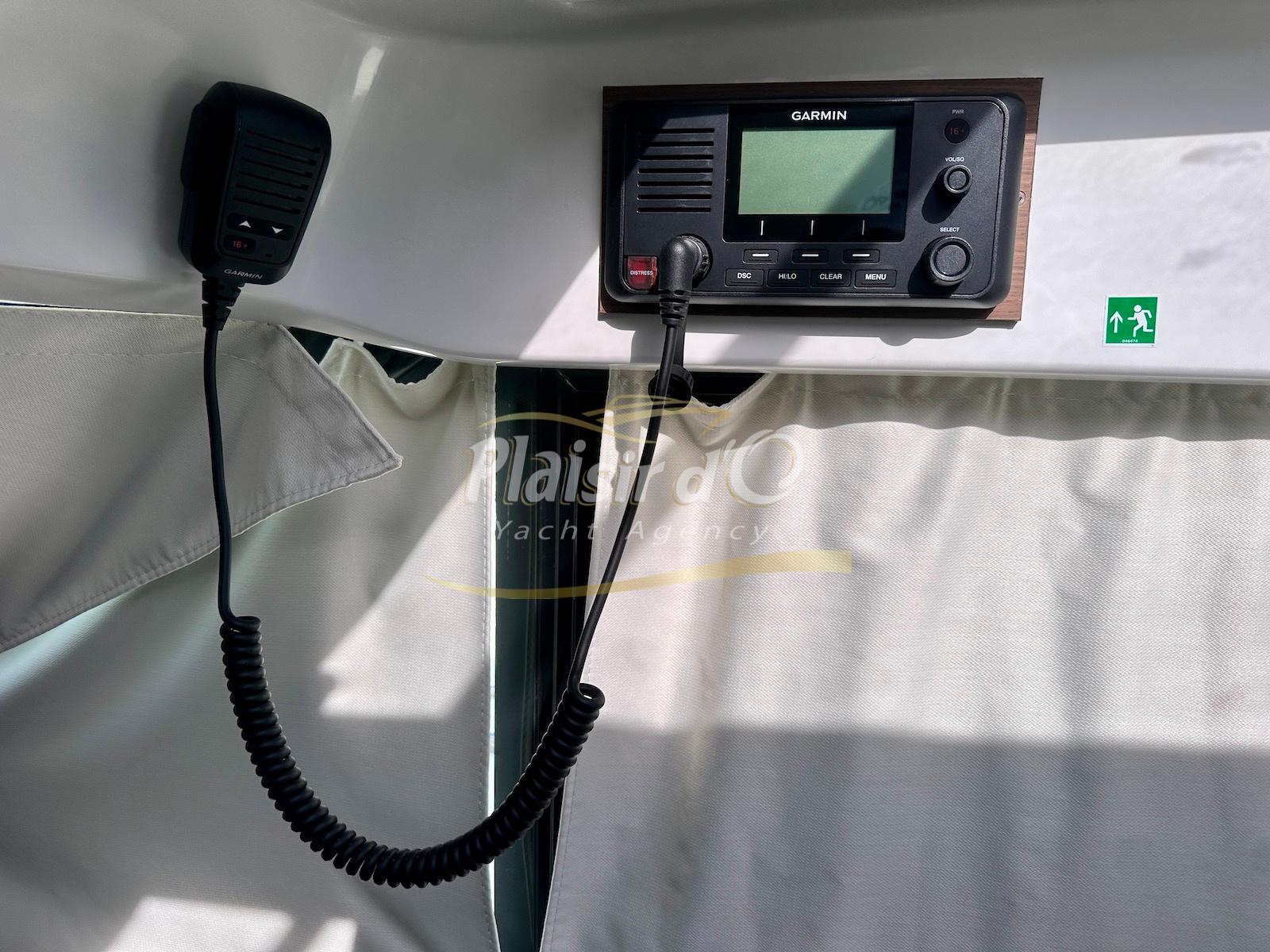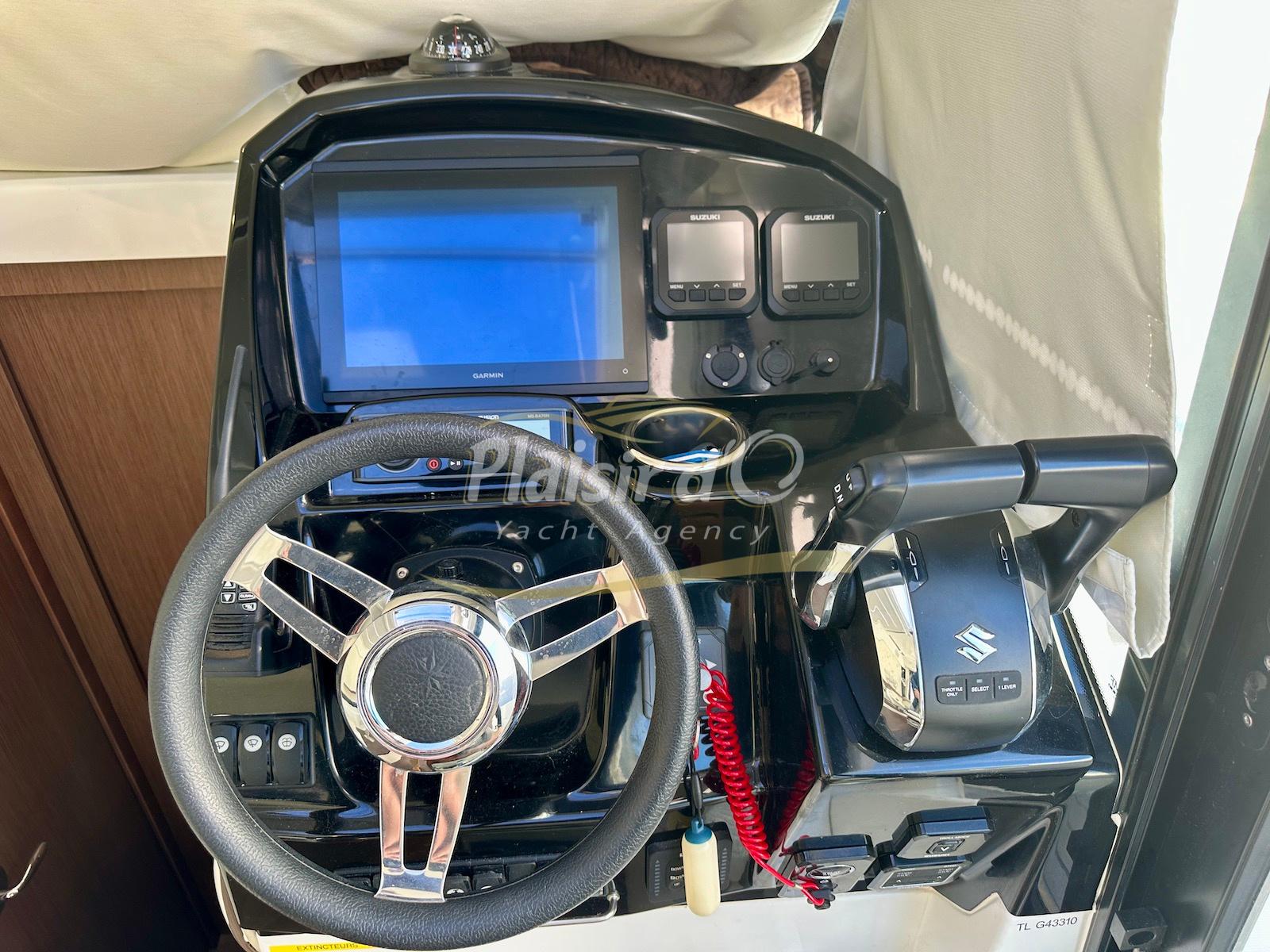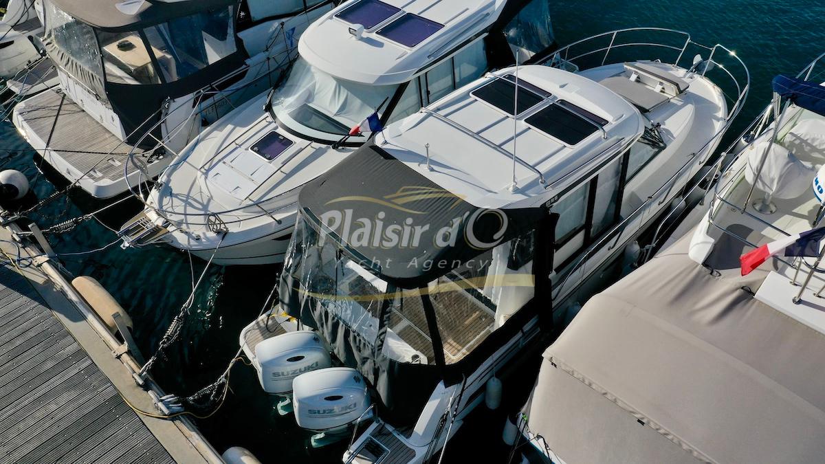 Full options : version offshore avec gros réservoir et grosse motorisation 2 x 200cv Suzuki en commandes électriques, climatisation revserible, cockpit teck, taud de camping, taud de soleil microperforé, compresseur d’air pour annexe intégré, micro ondes, frigo, WC marin, chauffe eau, chargeur, circuit 220v, guindeau électrique, GPS, VHF, carré convertible, bain de soleil avant et arrière, table de cockpit…