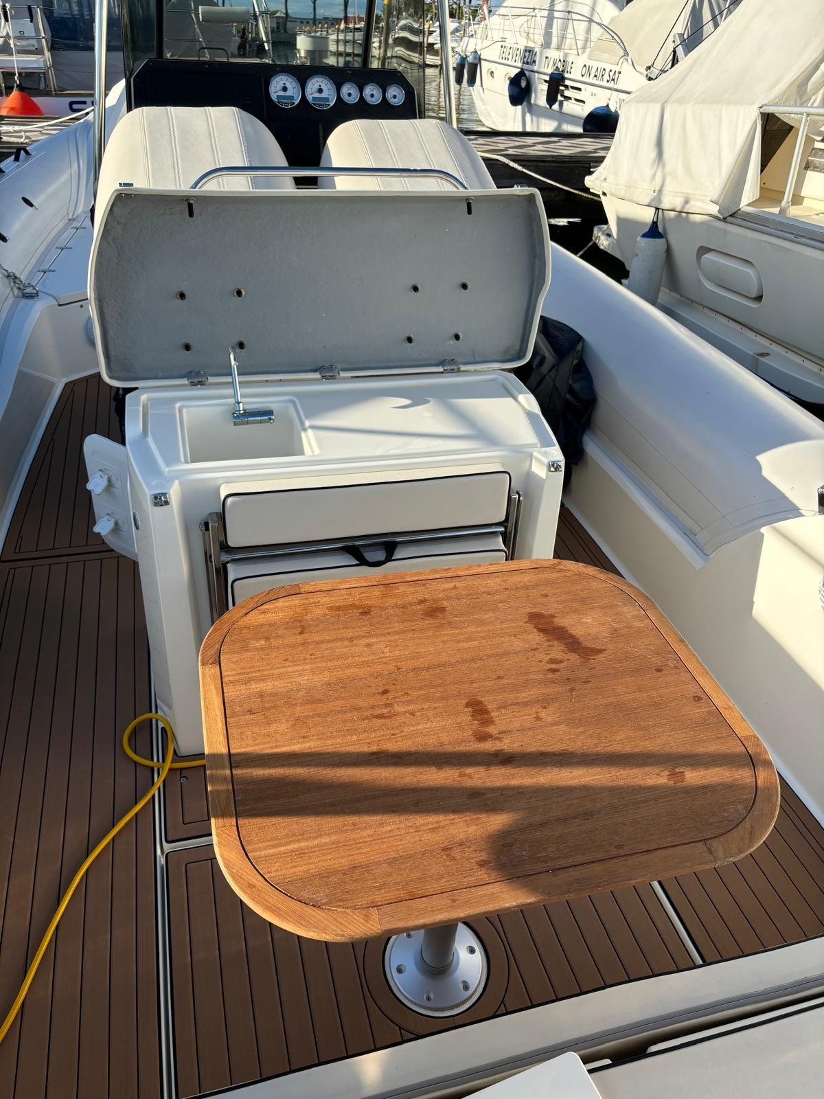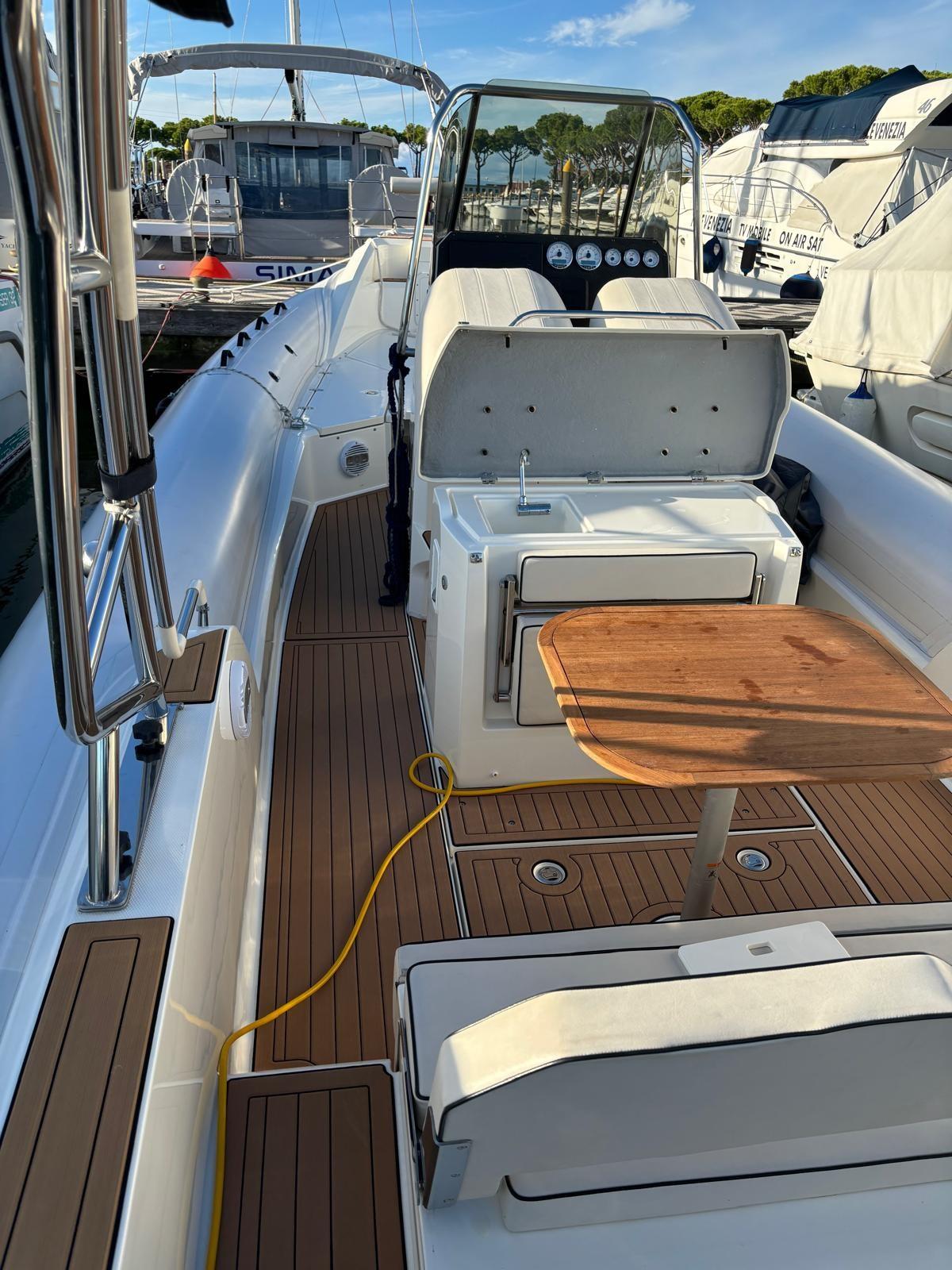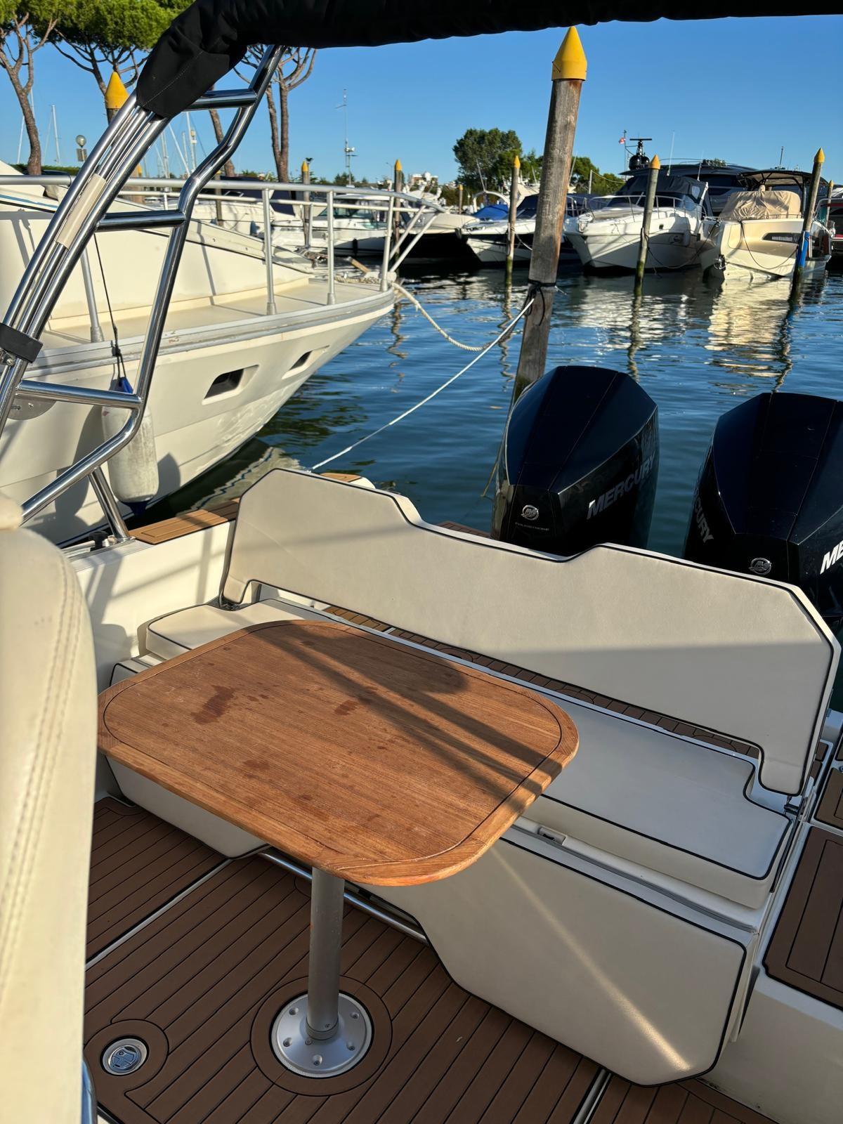 Alarme moteur, Passavant en teck, Douche de cockpit, Extincteur(s) fixe(s), Éclairage de courtoisie, Plateforme arrière, Cockpit en teck, Prise de quai, Connexion eau sous pression à quai, Table, Corne.