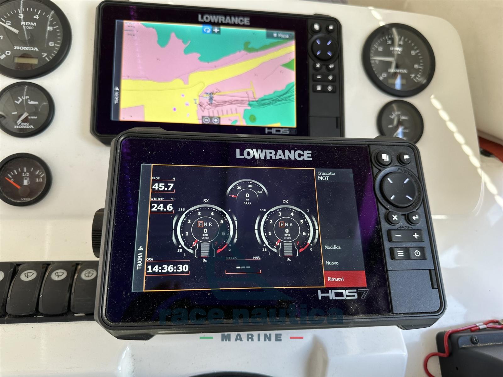 Antenne radar, DSC VHF, 2 Sondeur pêche (lAWRENCE 2 visori e 2 trasduttori TM150 A3IN UNO), 2 GPS, Ordinateur de bord (NMEA), 2 Lecteur de cartes (1 VISORE DA 7 " ED UN VISORE DA 9), Siège copilote, Système de positionnement dynamique (Motorguide 36 volt).