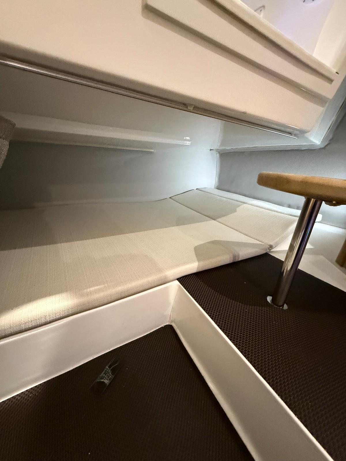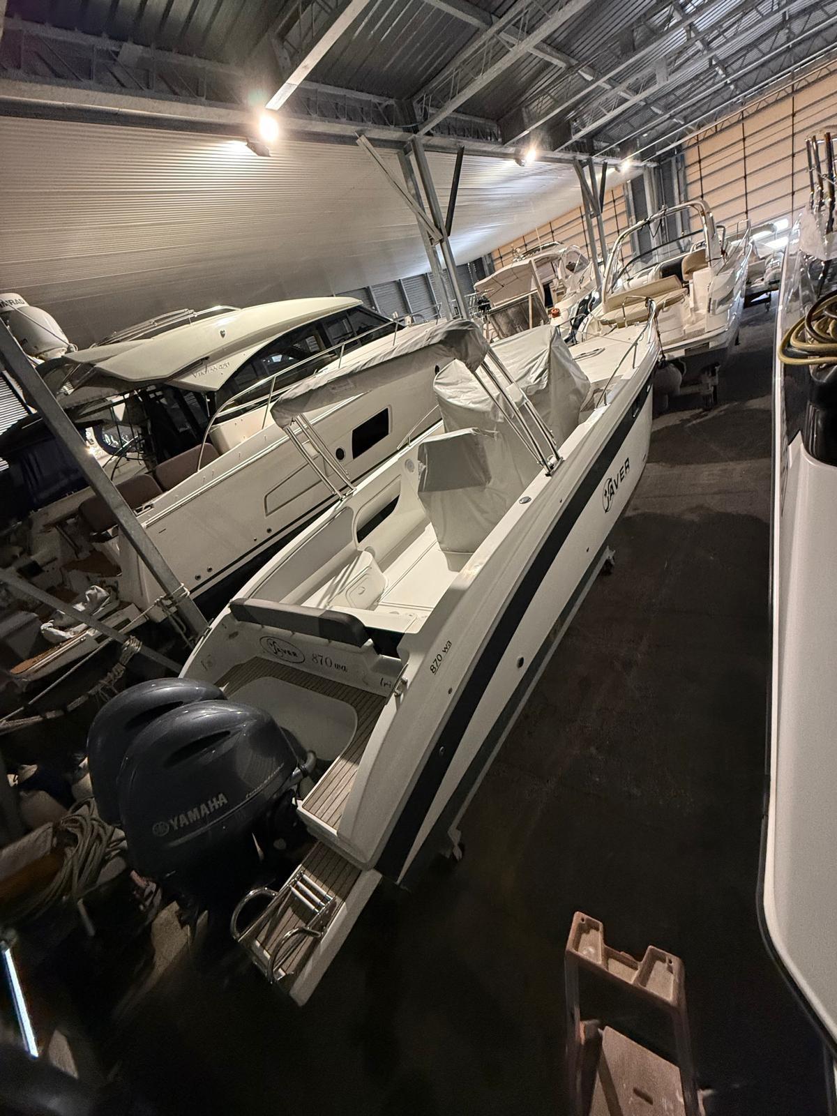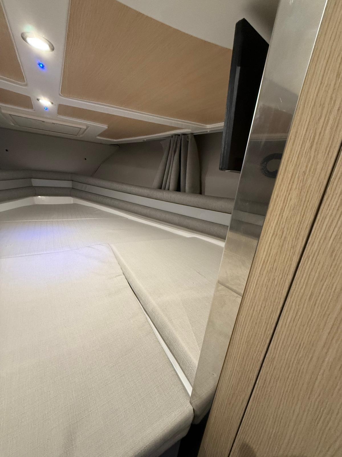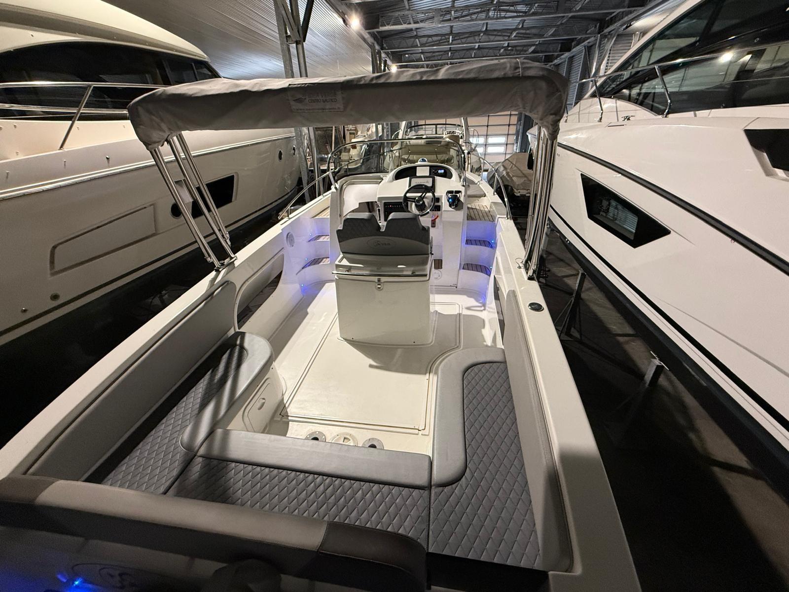 Le 870WA est un « bateau » qui s’inspire presque entièrement du modèle 750 WA. La dînette, en plus du canapé en forme de « U », comprend également une kitchenette juste derrière le bloc de sièges, avec un évier en standard et la possibilité d’adopter un feu à gaz, ainsi qu’un réfrigérateur intégré. La console est grande pour installer toute l’instrumentation nécessaire à bord et partage la surface avec une porte coulissante en acrylate qui offre un accès à la zone de couchage. Le grand pare-brise enveloppant protège le pilote du vent. Si pendant la journée le 870 WA est un compagnon amusant à apprécier en famille ou entre amis, la nuit, il se transforme en un camping-car dans lequel 3/4 personnes peuvent prendre place dans des zones séparées. En effet, un lit double disposé à l’avant correspond à un second lit simple à l’arrière, sous le poste de pilotage complet avec rideau coulissant. Le 870 WA dispose d’une salle de bains séparée avec toilettes électriques et d’un lavabo avec robinet/douche. À l’arrière, il y a deux plates-formes, une de chaque côté, dont l’une est équipée d’une échelle de remontée. Enfin, le moteur, exclusivement hors-bord, qui peut être adopté en solution mono ou bimoteur. La puissance maximale qui peut être installée est de 400 chevaux avec lesquels des pointes de plus de 49 nœuds peuvent être atteintes, mais déjà avec un seul moteur de 300 chevaux, il est possible d’obtenir des performances de plus de 35 nœuds.