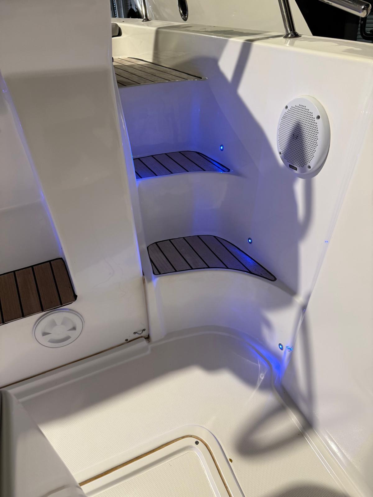Eau sous pression, Passavant en teck, Couleur spéciale, Douche de cockpit, Lavabo dans le cockpit, Prise de quai, Rollbar, Guindeau électrique, Echelle de bain, table de cockpit, Corne.