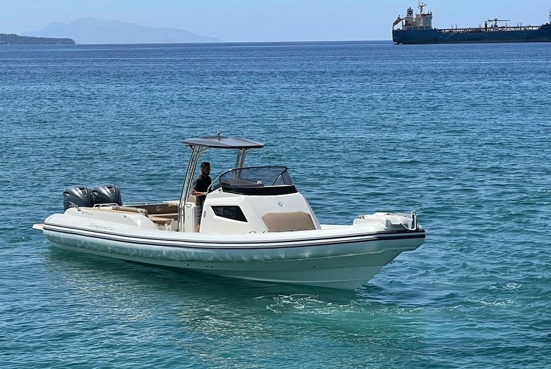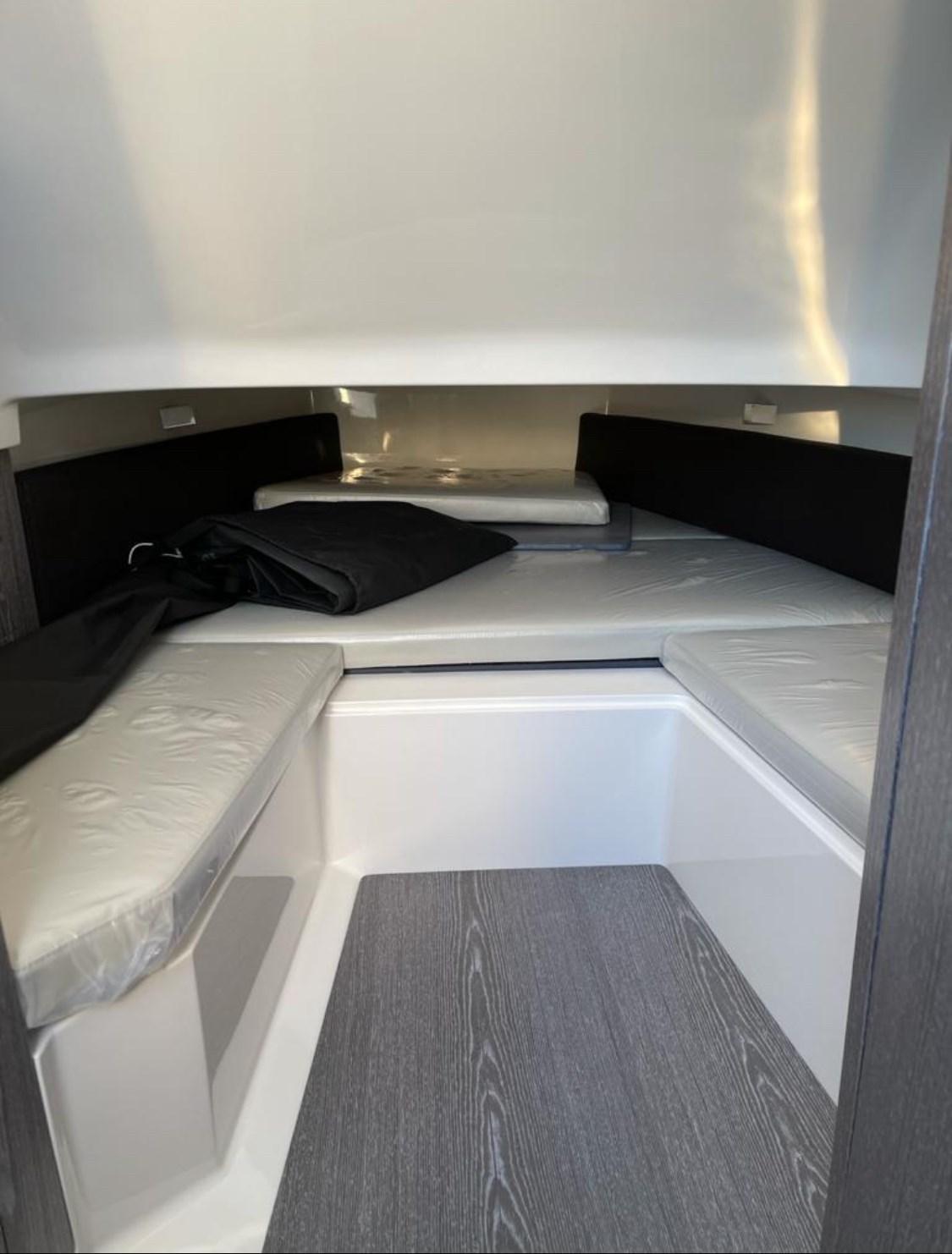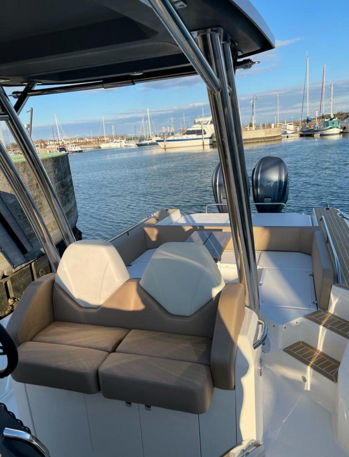 Alarme moteur, Ouverture du compartiment moteur électrique, Douche de cockpit, Éclairage de courtoisie, Spots sous-marins, Plateforme arrière, Cockpit en teck, Guindeau électrique, Echelle de bain, Table.