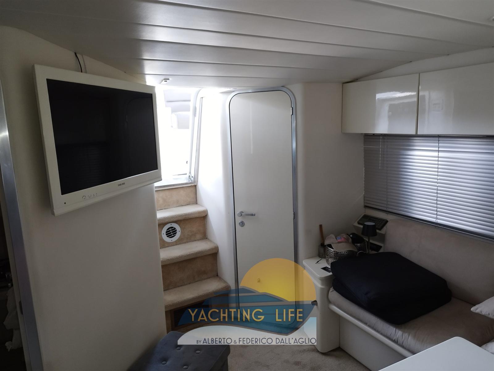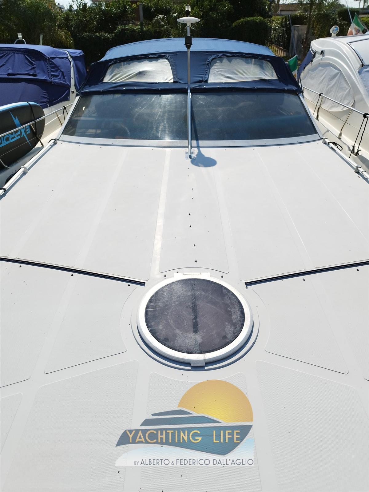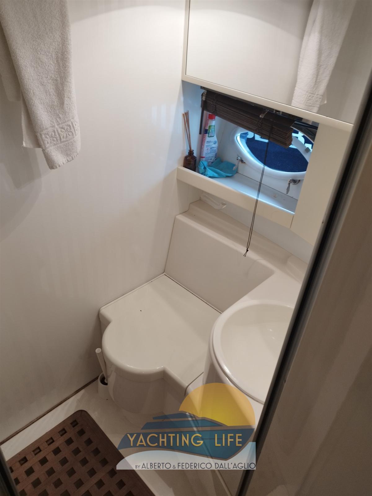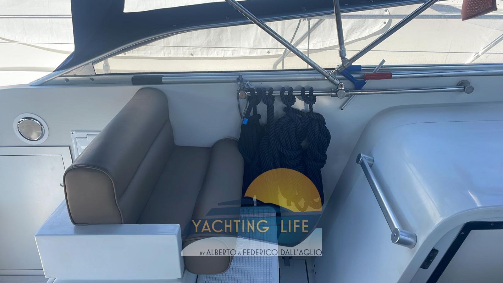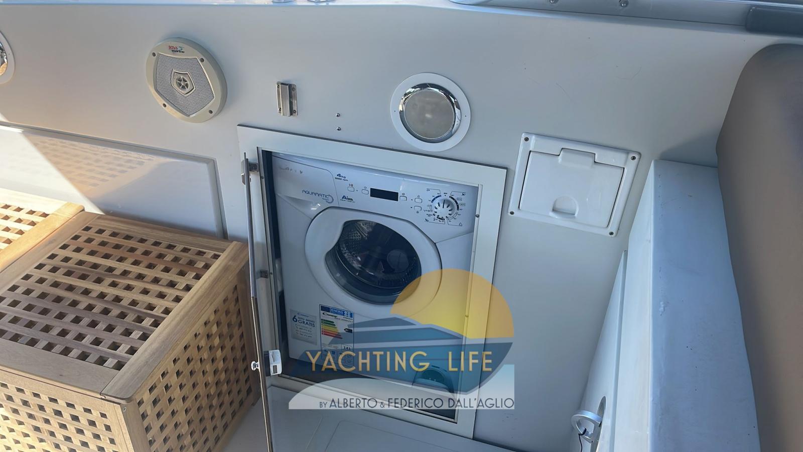 Alarme moteur, Eau sous pression, Couleur spéciale (Scafo bianco e blu), Douche de cockpit, Flaps électriques, Éclairage de courtoisie, Spots sous-marins, Passerelle (Idraulica), Plateforme arrière (Allungata), Pompe de cale automatique, Porte latérale, Prise de quai, Guindeau électrique (Motore 2022), Echelle de bain, Selles pour Annexe, Corne.