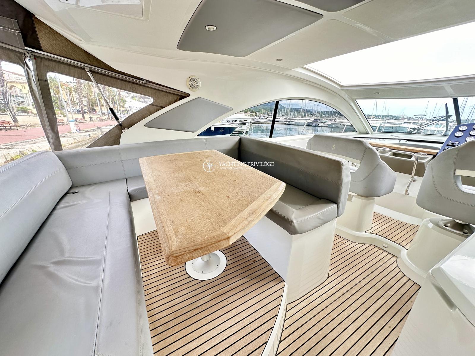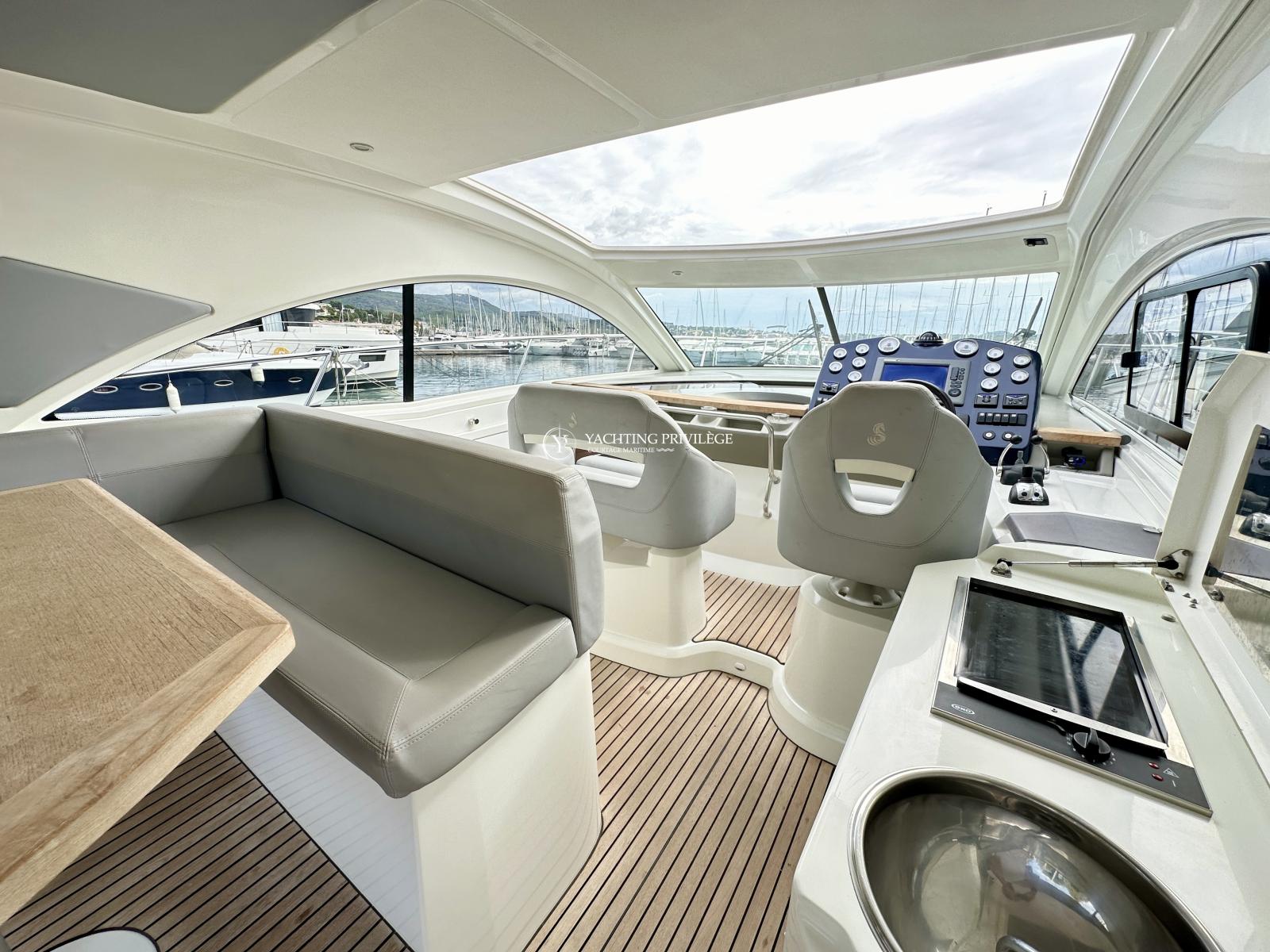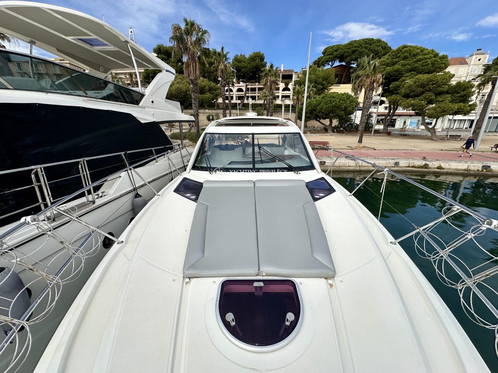 Bateau bien équipé, groupe électrogène, climatisation réversible, hard-top électrique, propulseur d’étrave, garage à annexe, guindeau électrique, plancha, taud de camping, sellerie complète, taud de protection des selleries, VHF, GPS, sondeur, radar, pilote-automatique…