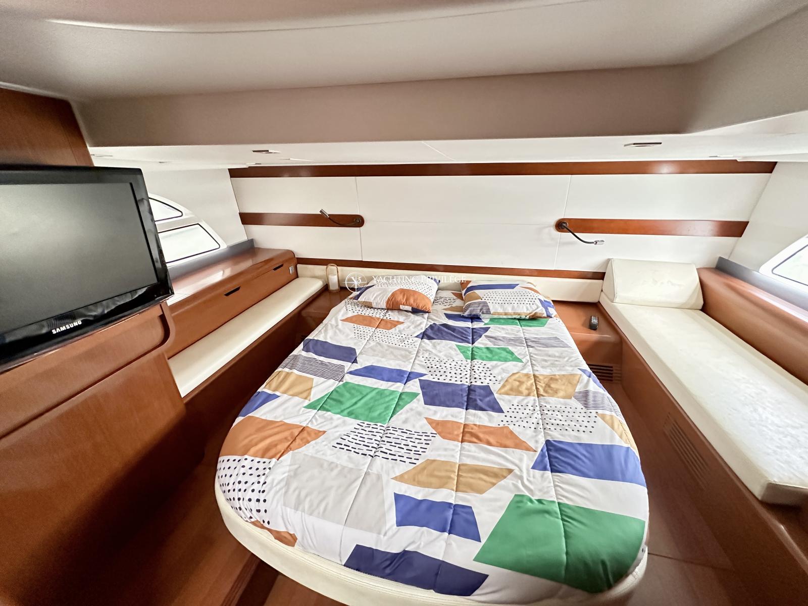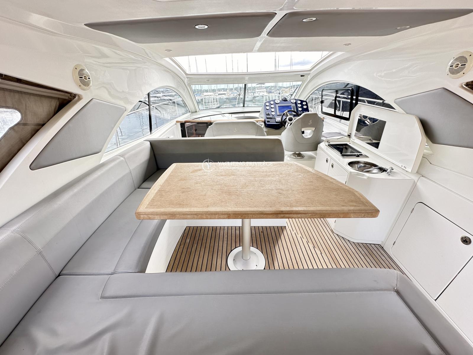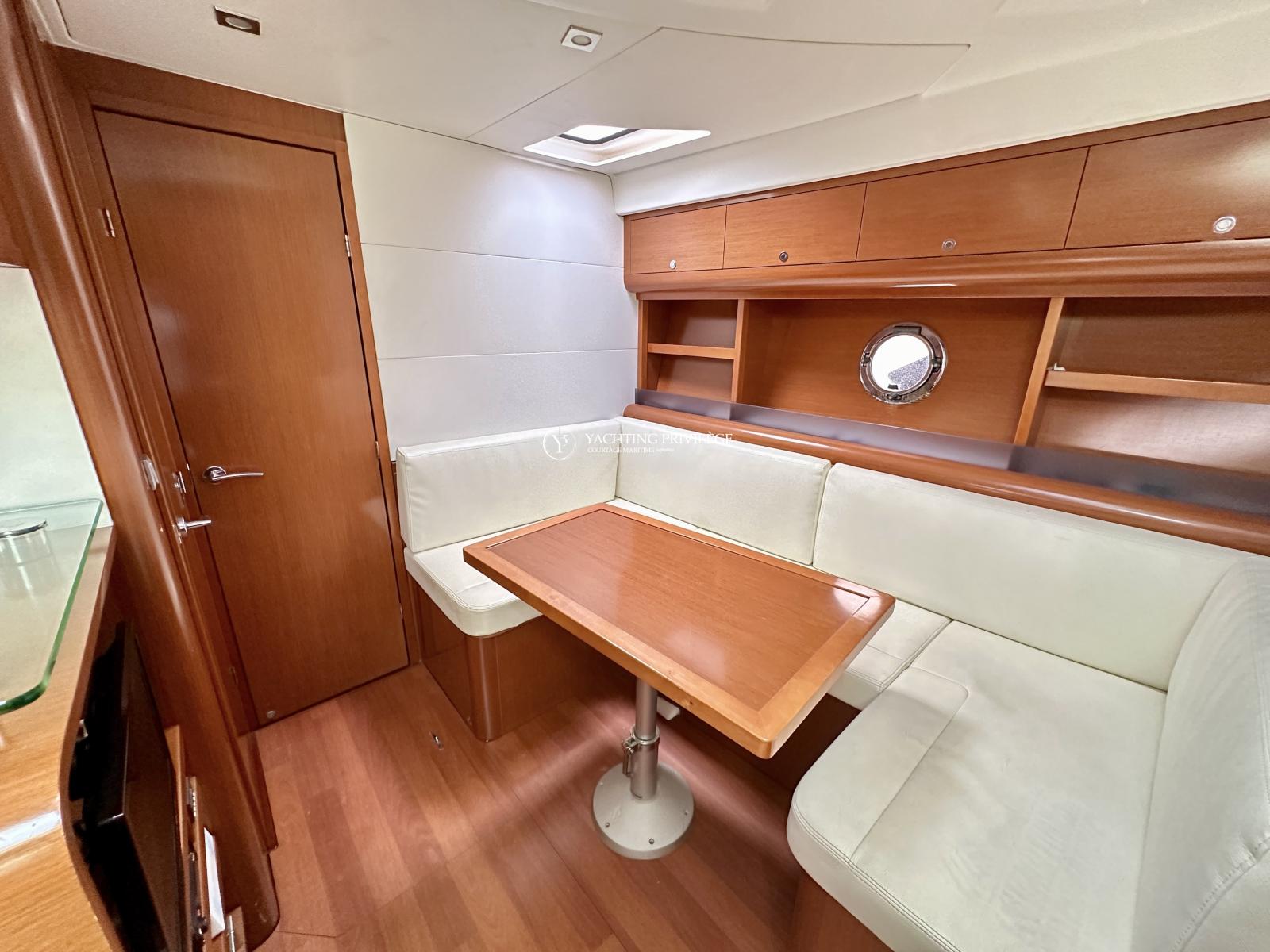 Bateau bien équipé, groupe électrogène, climatisation réversible, hard-top électrique, propulseur d’étrave, garage à annexe, guindeau électrique, plancha, taud de camping, sellerie complète, taud de protection des selleries, VHF, GPS, sondeur, radar, pilote-automatique…