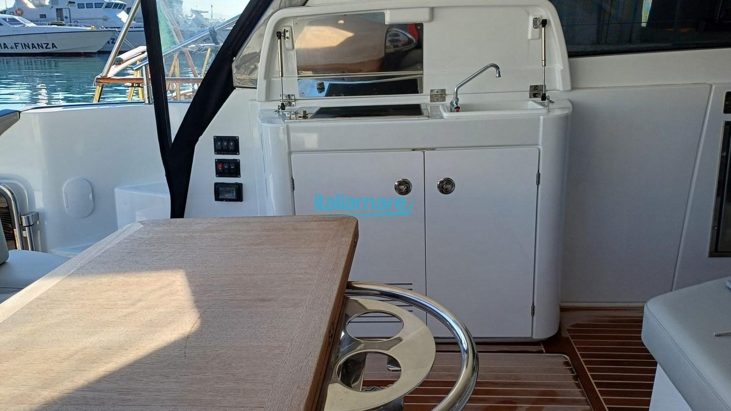 Alarme moteur, Alarme de pompe de cale, Eau sous pression, Trim hydraulique, 6 Batteries, Douche de cockpit, Flaps électriques, Hard top, Extincteur(s) fixe(s), Indicateurs de flaps, Éclairage de courtoisie, Spots sous-marins, Plateforme arrière, Pompe de cale automatique, Pompe de cale manuelle, Cockpit en teck, Prise de quai, Guindeau électrique, Echelle de bain, table de cockpit.
