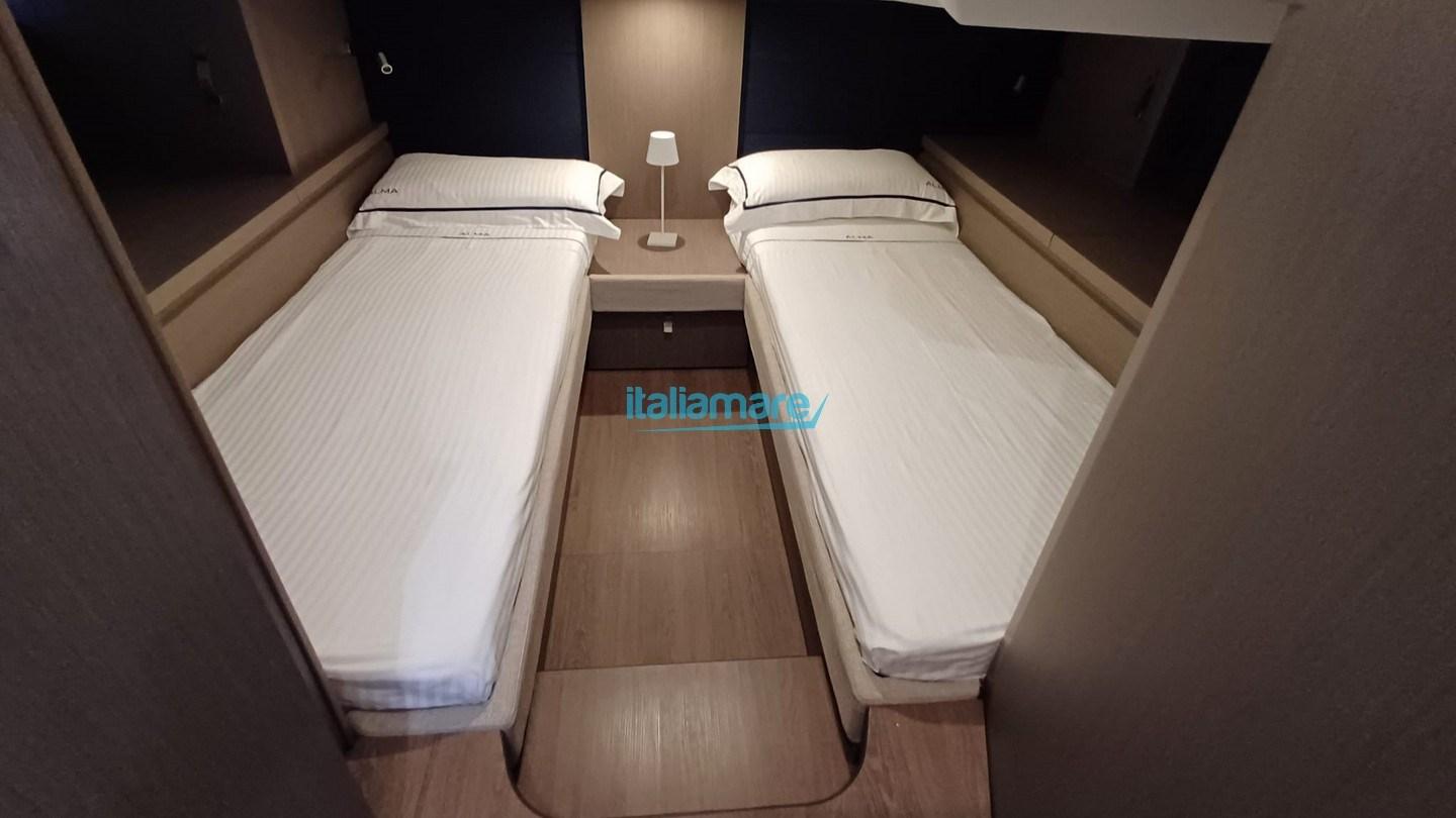 Sous le pont, le yacht offre une atmosphère sereine et raffinée : deux cabines privées pleine largeur avec lits longitudinaux, une cuisine entièrement équipée avec un réfrigérateur de 80 litres, une cuisinière et un espace de vie convertible, ainsi qu’une salle de bain séparée avec douche.