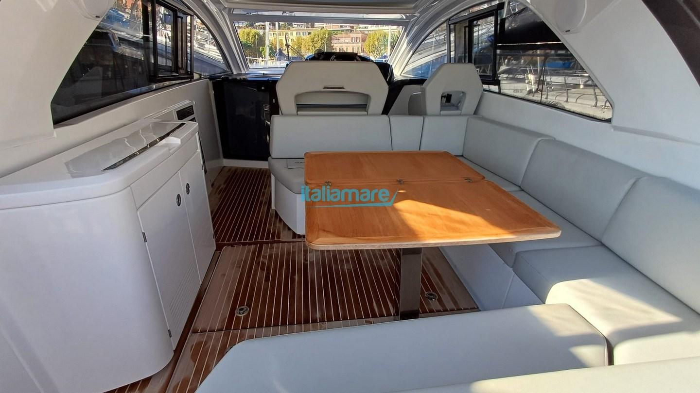 Gran Turismo 41 combine un design élégant et dynamique avec des intérieurs accueillants et fonctionnels, conçus pour ceux qui recherchent des performances vivantes sans sacrifier le confort. Le cockpit est conçu comme un véritable salon : un espace de vie en U pour 6 à 8 personnes, un bar extérieur avec évier, un réfrigérateur de 49 litres, un grill électrique, un bain de soleil arrière au niveau du canapé pour un accès facile, et une atmosphère en plein air grâce au hard top électrique.