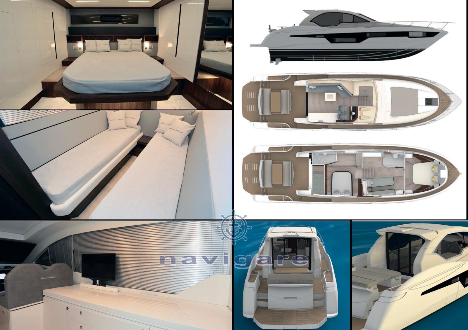 SUN TOP 55 CLASSIQUE. Timonerie avec siège double. Plate-forme arrière et cockpit en teck Flexy, table pliante en teck Flexy, coussins d’assise transformables en bain de soleil arrière. Treuil électrique et 50 mt. chaîne D8. Meuble bar avec évier, rangement et mini-box. Direction électrique, Interceptor, ligne de flottaison noire std.