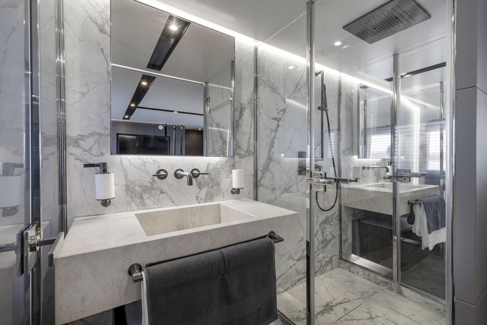 Le pont inférieur est dédié à l’hébergement : jusqu’à quatre cabines « guest » et une vaste suite propriétaire, toutes pourvues de leur salle de bain privative, dressings et rangements intégrés.