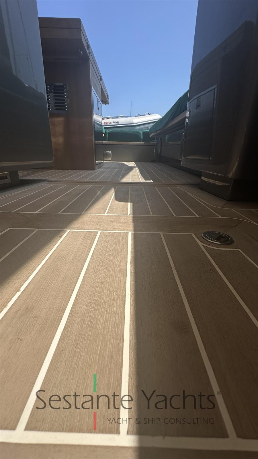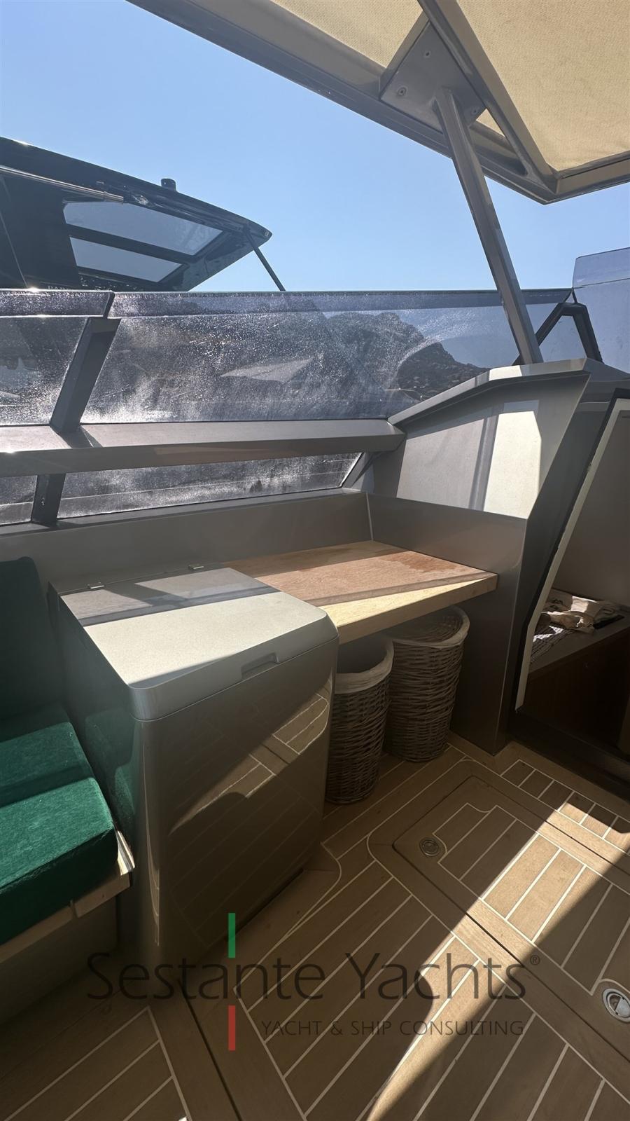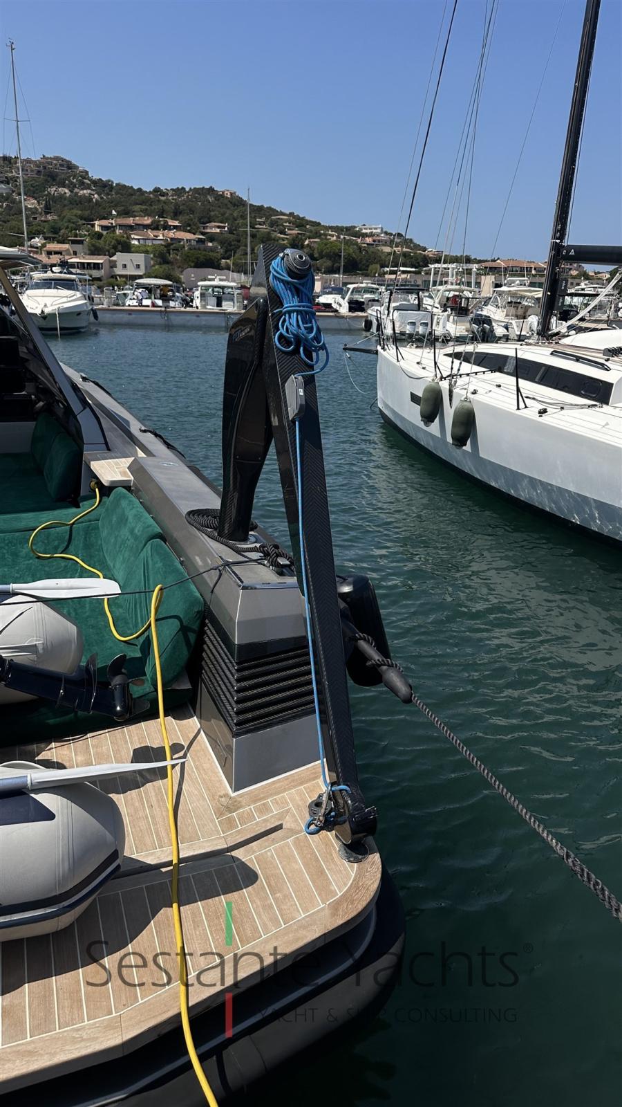 Alarme moteur, Alarme de pompe de cale, Ouverture du compartiment moteur électrique, Auto Dynamic Trim Interceptor, Eau sous pression, Passavant en teck, Couleur spéciale (Gray), Douche de cockpit, Flaps hydrauliques, Bossoirs (In carbonio ammovibile), Extincteur(s) fixe(s), Éclairage de courtoisie, Plateforme arrière, Pompe de cale automatique, Pompe de cale manuelle, Cockpit en teck, Prise de quai, Guindeau électrique, Echelle de bain, table de cockpit, Annexe, Corne, T-Top, Pont en teck.