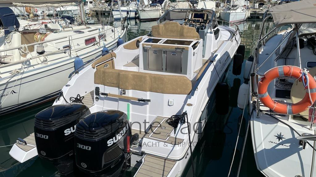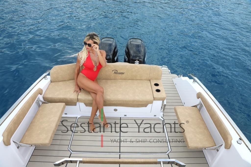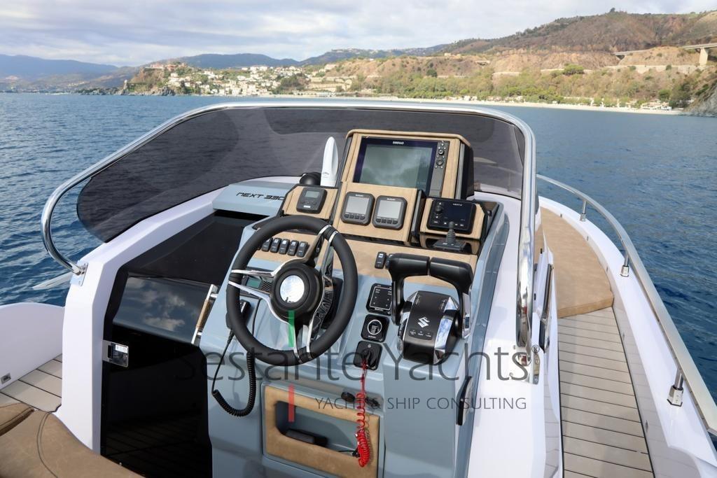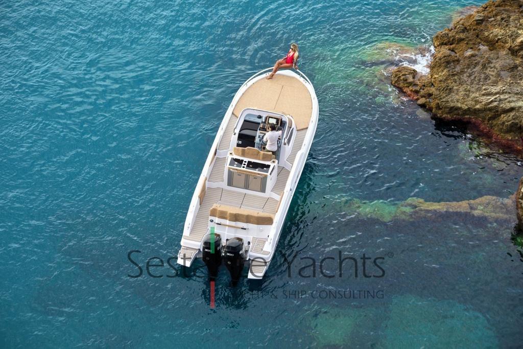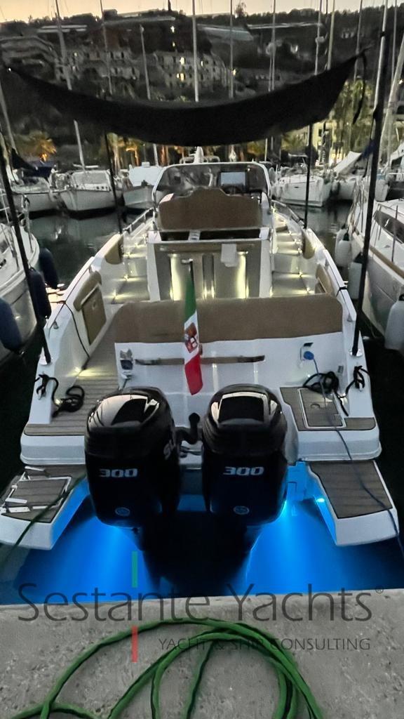 Alarme moteur, Eau sous pression, 3 Batteries, Couleur spéciale (Fiancate grige), Douche de cockpit, Flaps électriques, Lavabo dans le cockpit, Éclairage de courtoisie, Spots sous-marins, Pompe de cale automatique, Cockpit en teck (Seadek), Prise de quai, Guindeau électrique, Echelle de bain, table de cockpit (Elettrico trasformabile in prendisole), Corne, Pont en teck (Seadek).