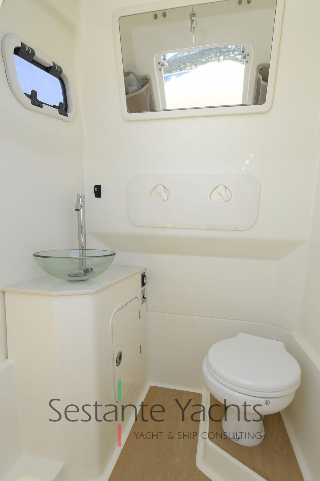 La principale nouveauté de Tempest 900 OPEN est la présence d’une porte orientée vers la proue qui permet d’accéder à une zone sous le pont. La zone peut être utilisée comme casier de rangement pleine hauteur ou, alternativement, elle peut être aménagée avec une toilette marine (avec réservoir d’eau noire dédié), un miroir interne en A-look, un revêtement supérieur d’évier en Corian, un évier en verre avec robinet, un revêtement de sol flexiteek et des poches de rangement. Cette option vous permet d’avoir une cabine complète et fonctionnelle pour les besoins typiques d’un croiseur de jour.