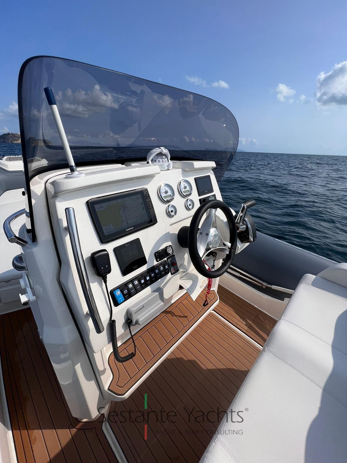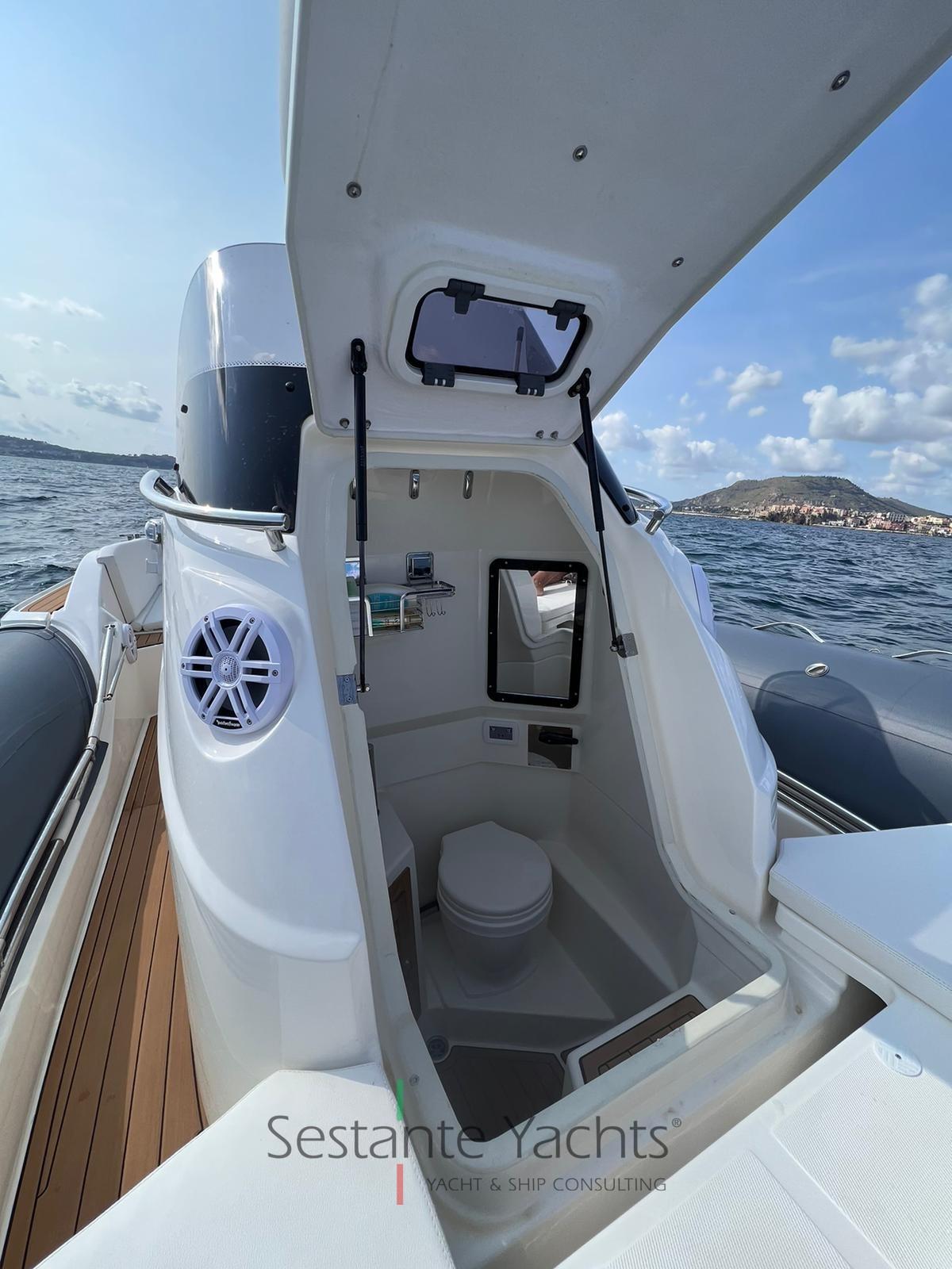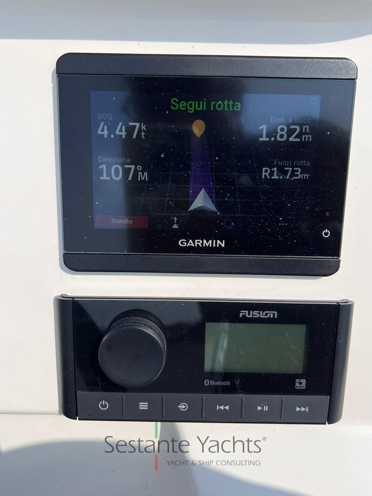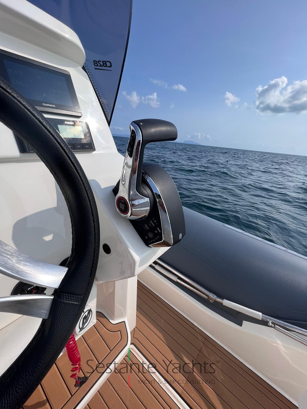 Alarme moteur, Auto Dynamic Trim Interceptor, Eau sous pression, Douche de cockpit, Éclairage de courtoisie, Spots sous-marins, Pompe de cale automatique, Pompe de cale manuelle, Cockpit en teck (Flexitek), Prise de quai, Guindeau électrique, Echelle de bain, Table.