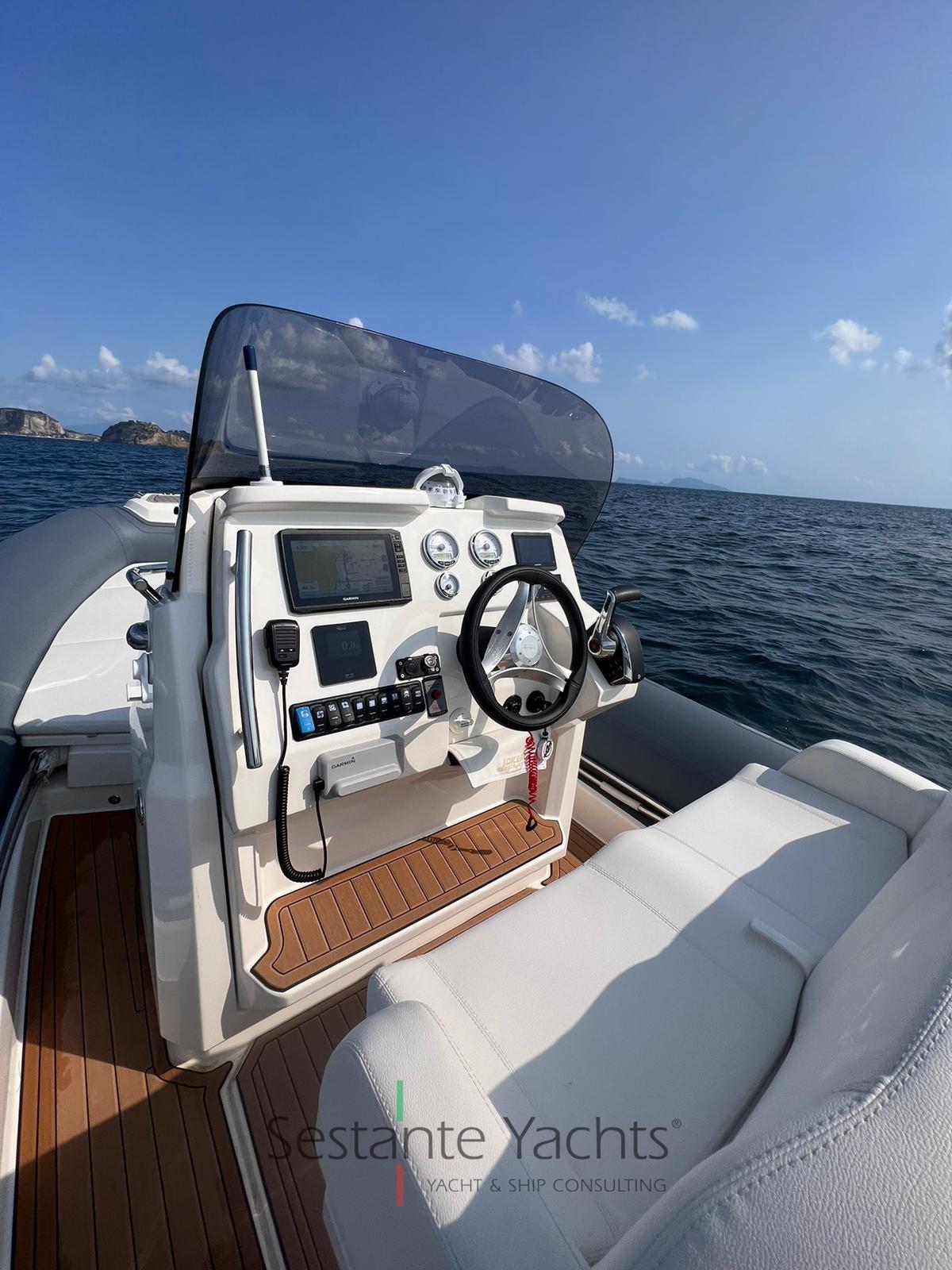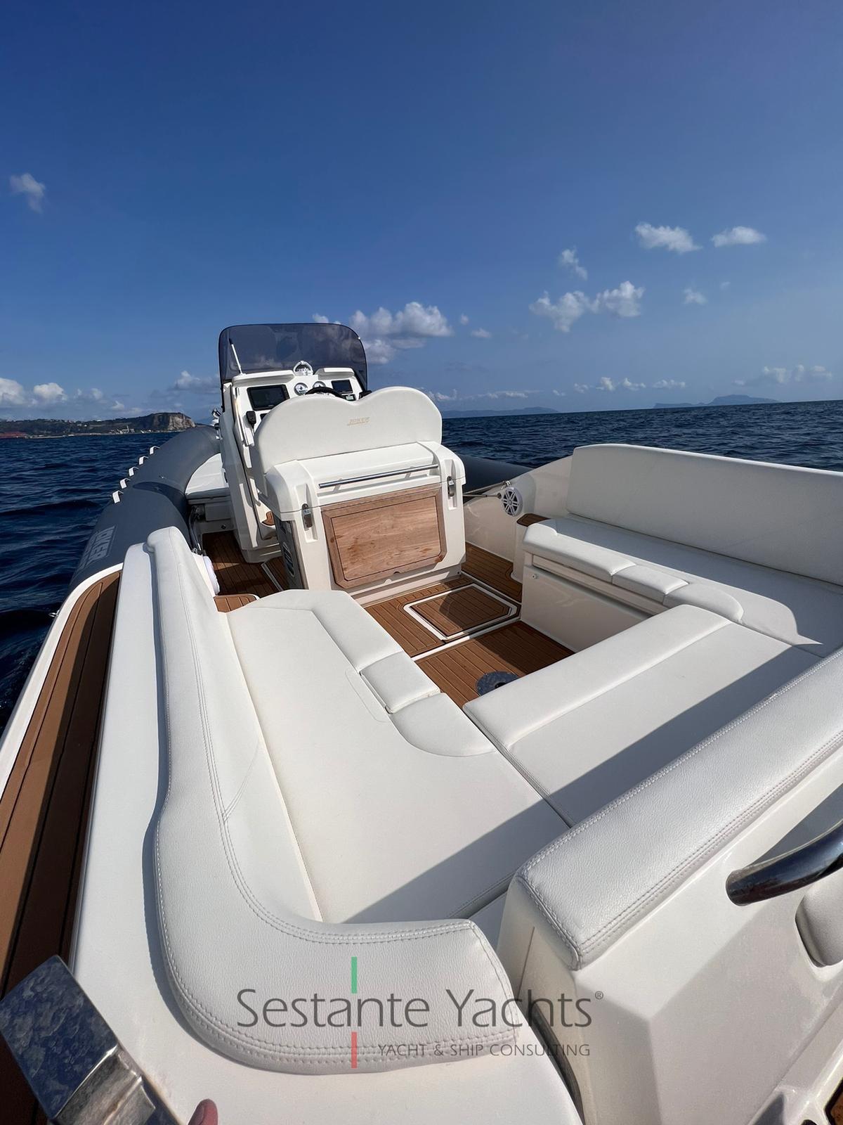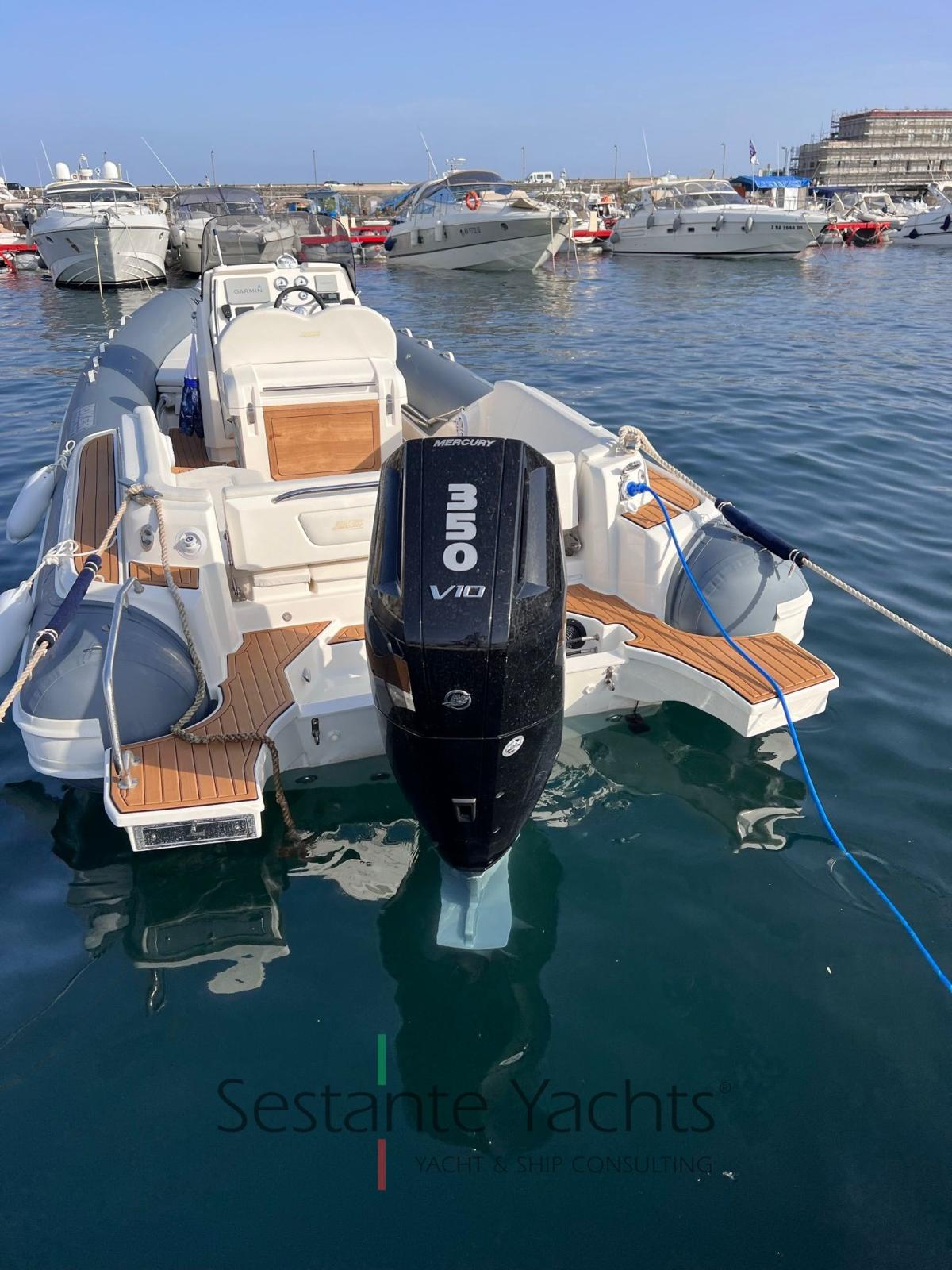 Alarme moteur, Auto Dynamic Trim Interceptor, Eau sous pression, Douche de cockpit, Éclairage de courtoisie, Spots sous-marins, Pompe de cale automatique, Pompe de cale manuelle, Cockpit en teck (Flexitek), Prise de quai, Guindeau électrique, Echelle de bain, Table.