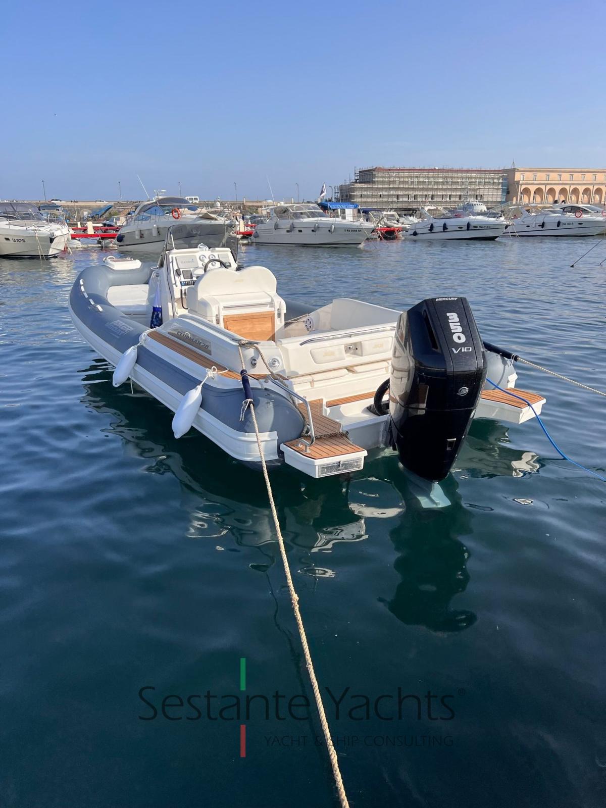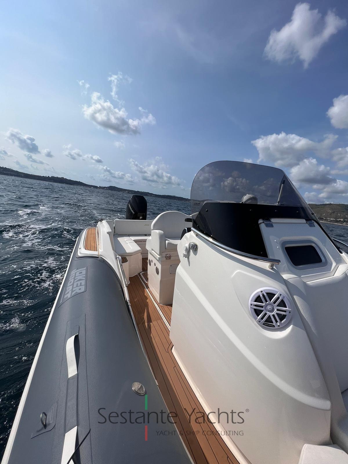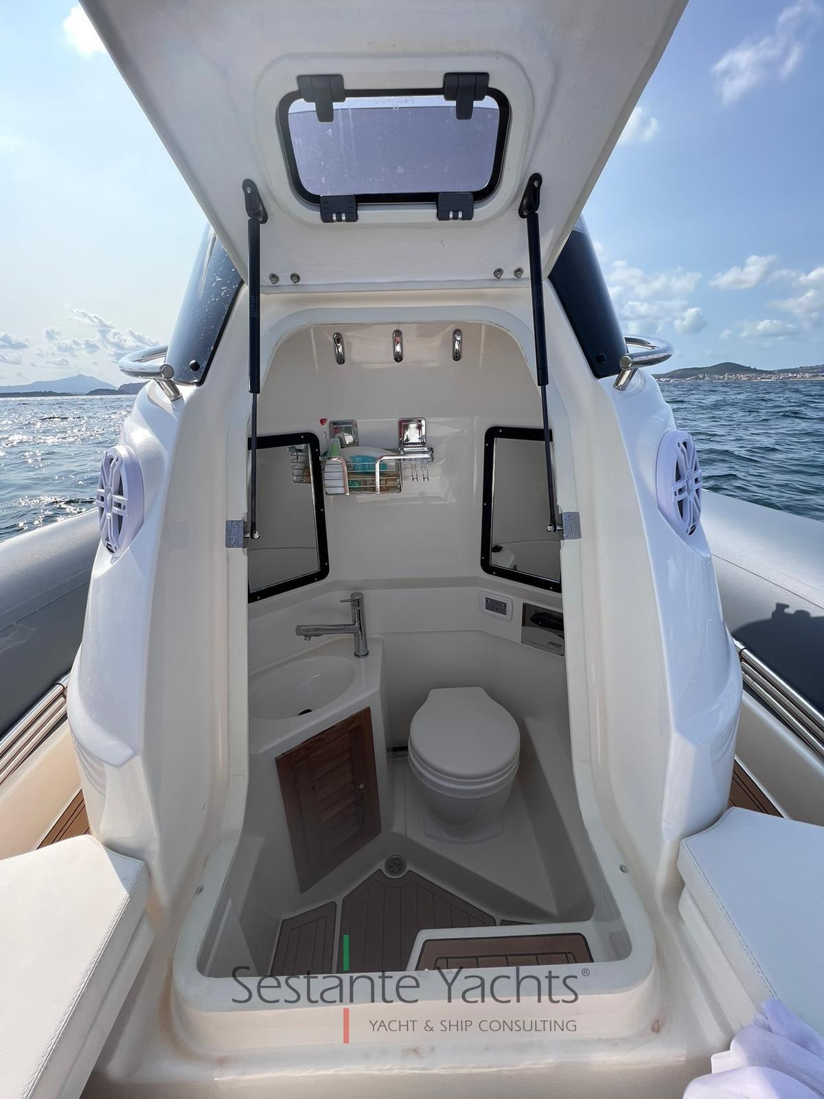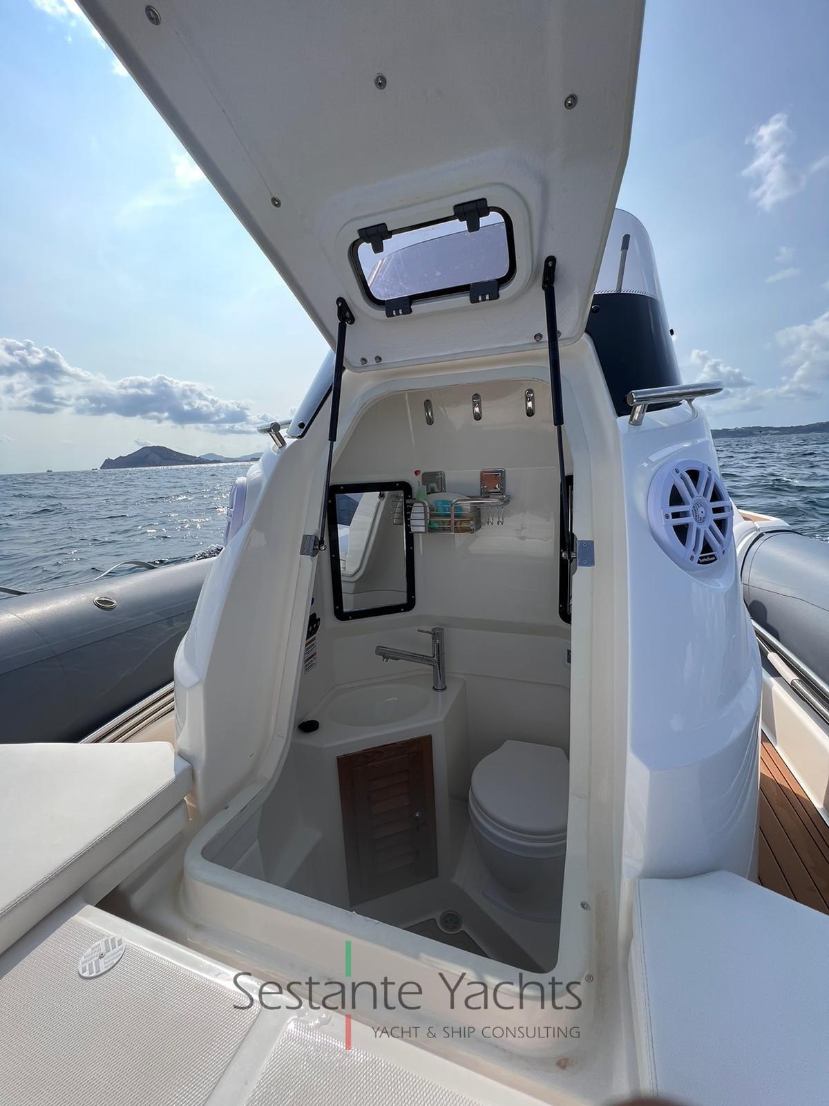 Alarme moteur, Auto Dynamic Trim Interceptor, Eau sous pression, Douche de cockpit, Éclairage de courtoisie, Spots sous-marins, Pompe de cale automatique, Pompe de cale manuelle, Cockpit en teck (Flexitek), Prise de quai, Guindeau électrique, Echelle de bain, Table.
