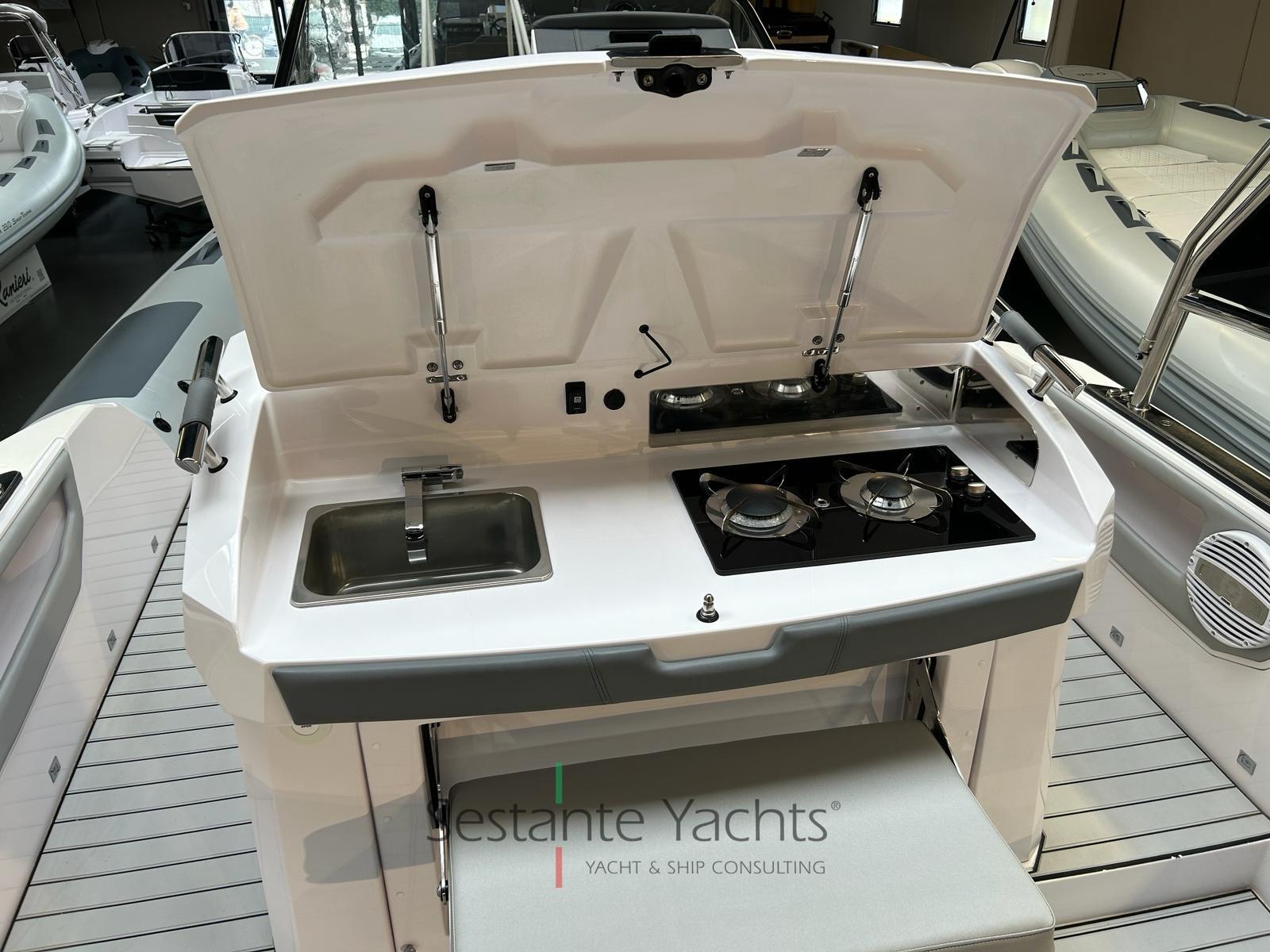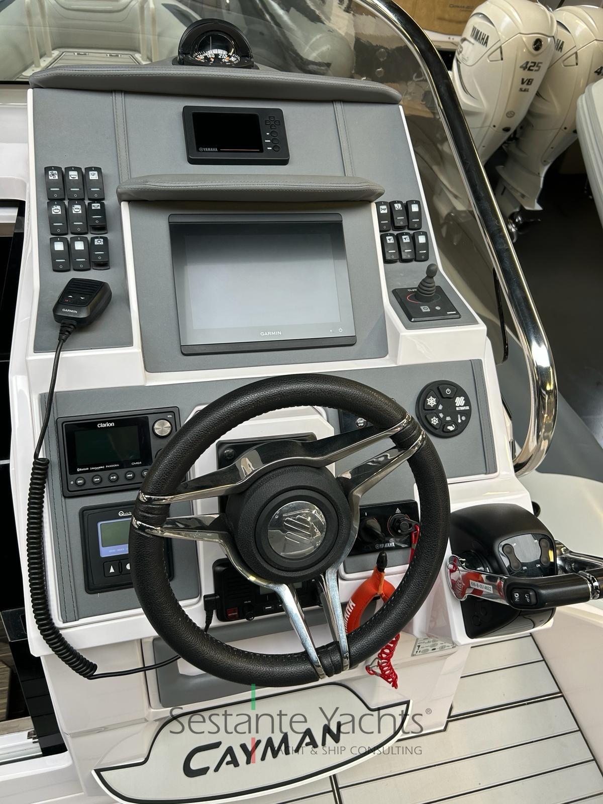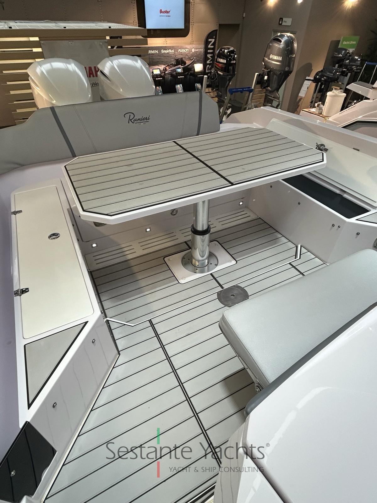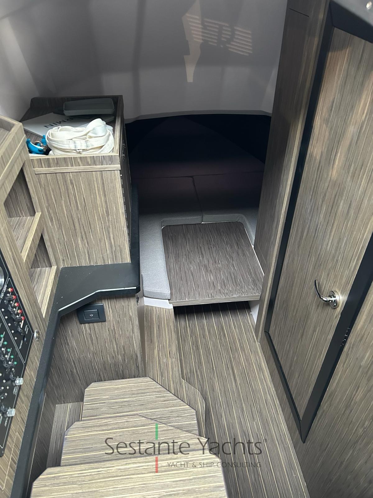 Alarme moteur, Alarme de pompe de cale, Eau sous pression, 4 Batteries, Douche de cockpit, Éclairage de courtoisie, Pompe de cale automatique, Cockpit en teck (Seadeck), Prise de quai, Rollbar (con doppio tendalino), Guindeau électrique, 2 Echelle de bain, Table (elettrico trasformabile in prendisole), Corne.