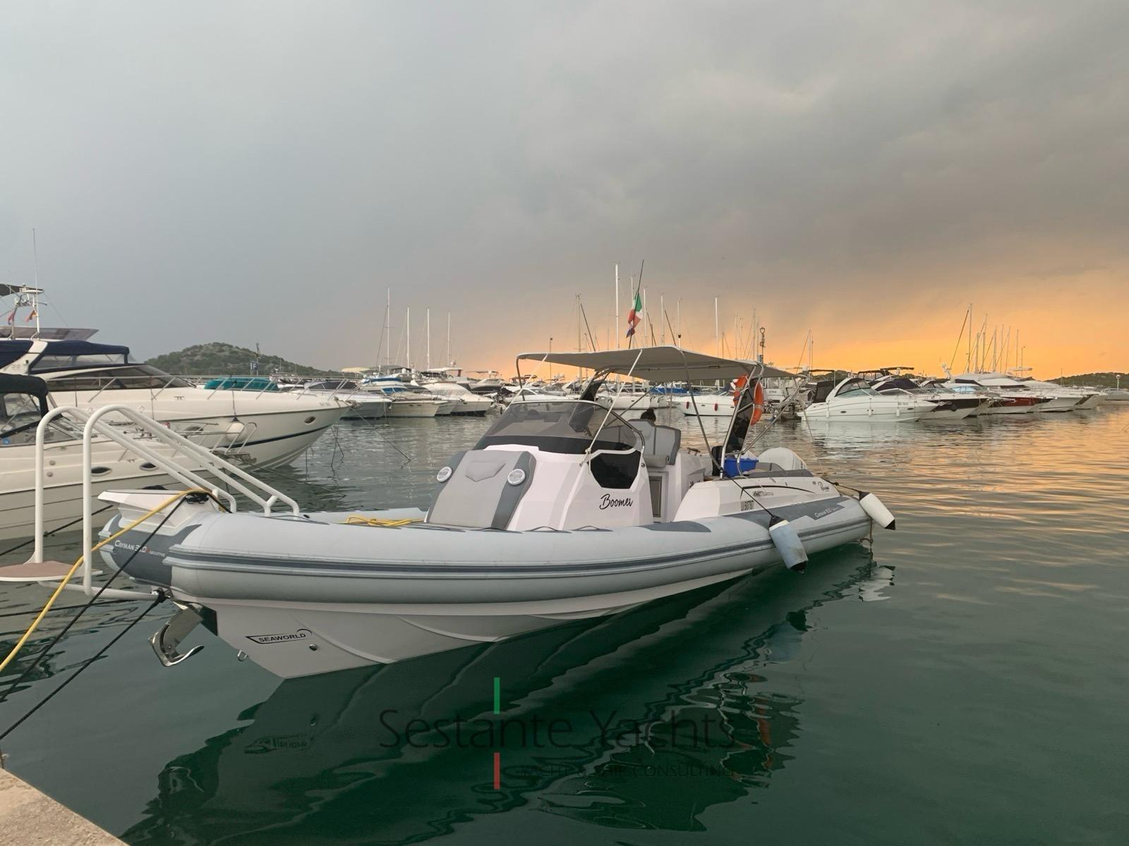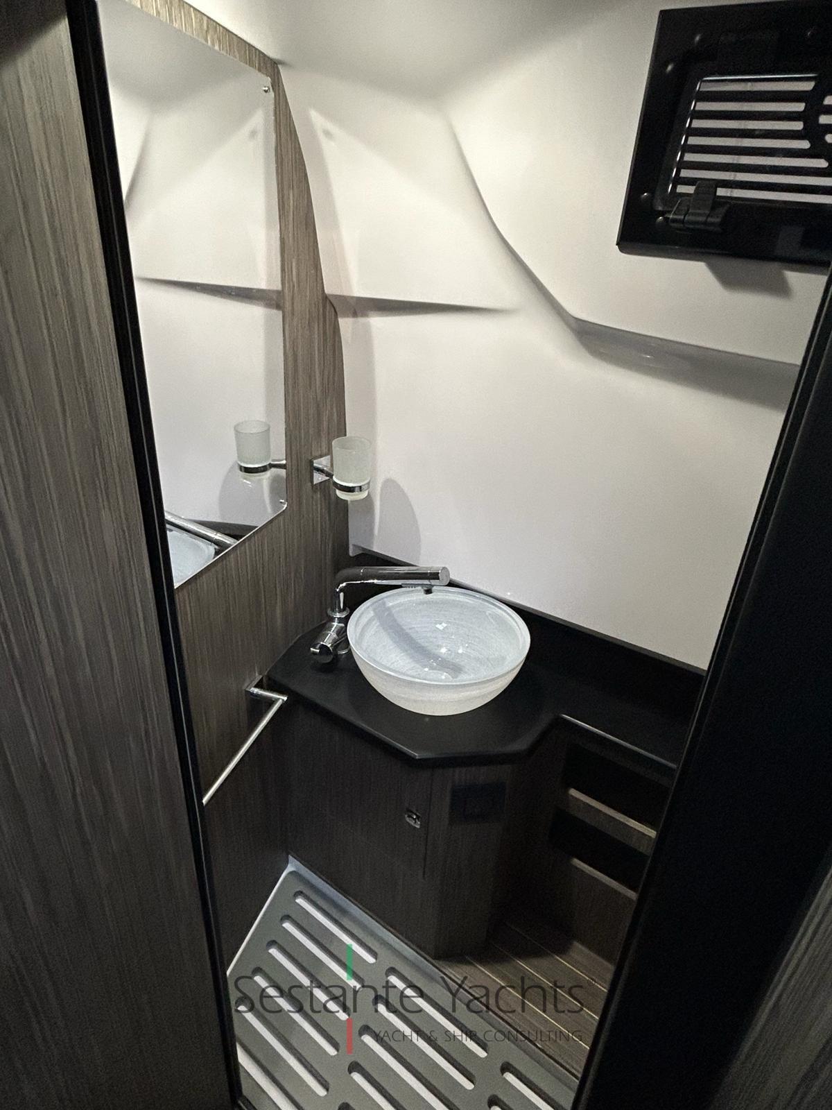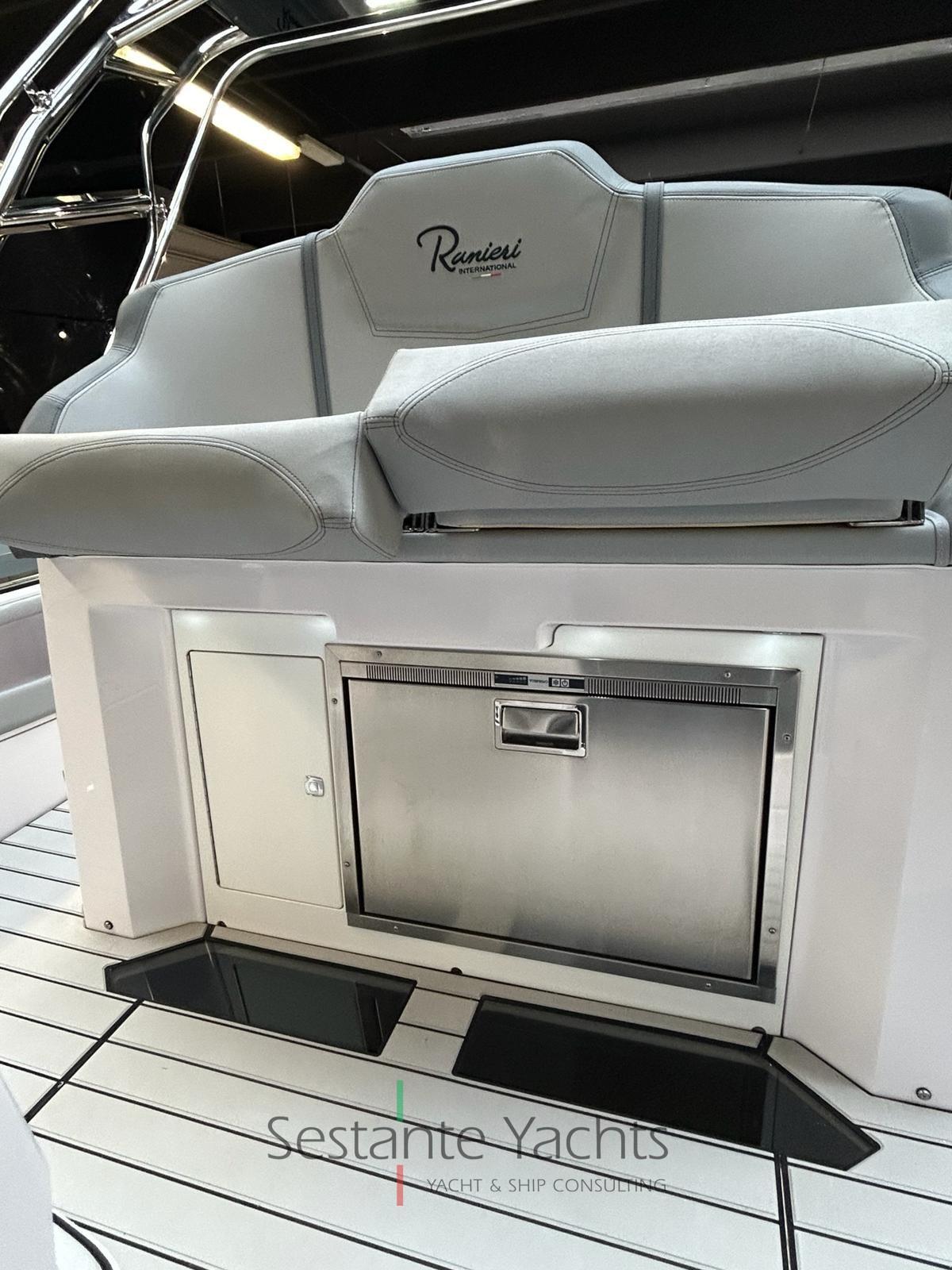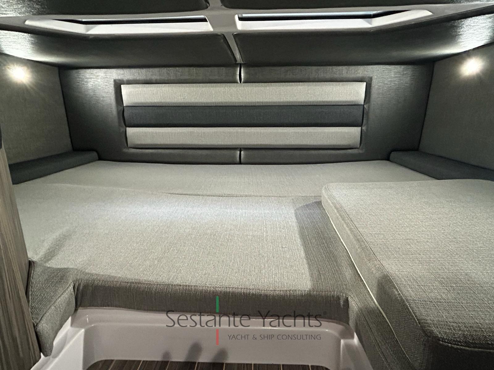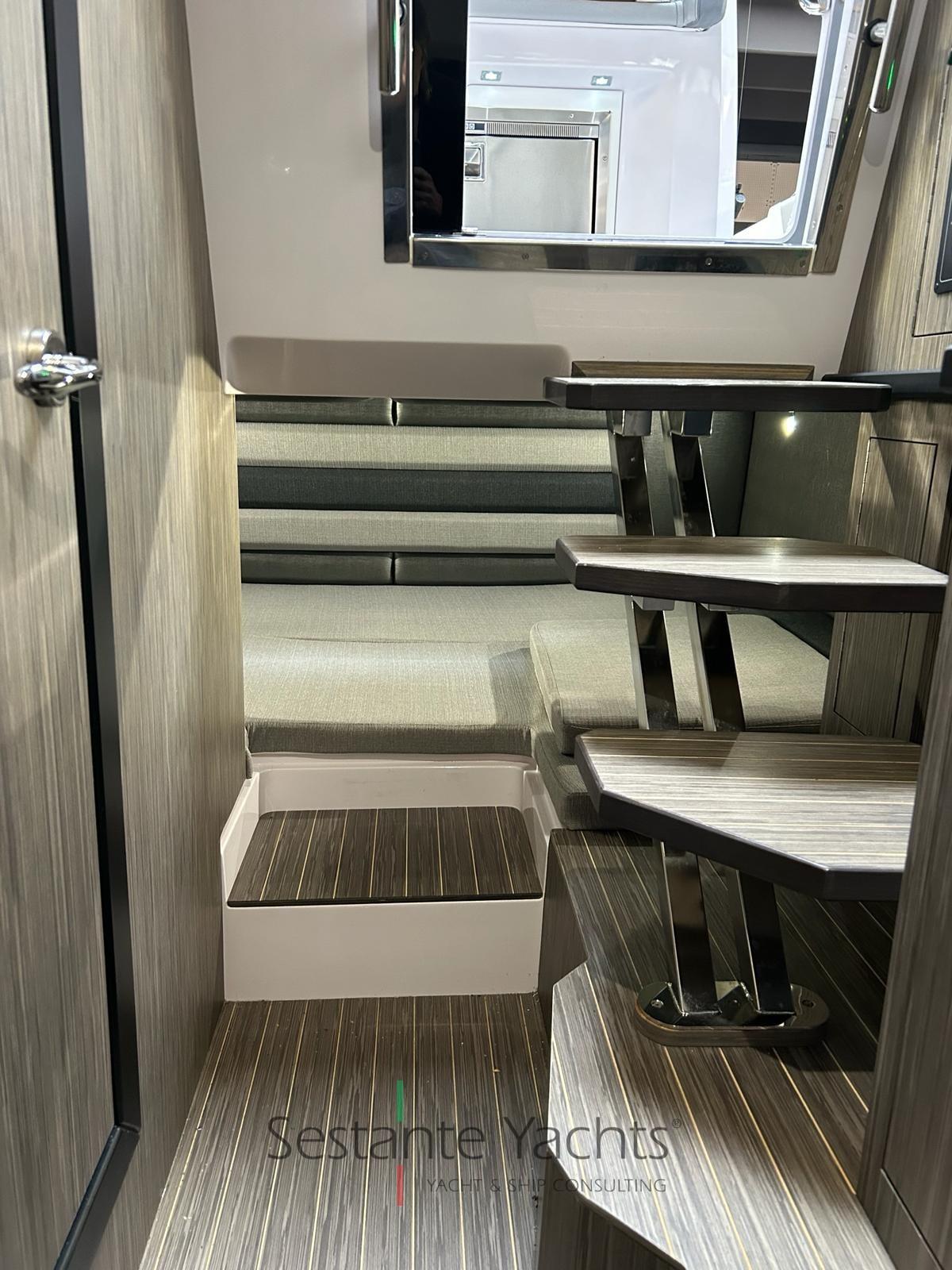 Alarme moteur, Alarme de pompe de cale, Eau sous pression, 4 Batteries, Douche de cockpit, Éclairage de courtoisie, Pompe de cale automatique, Cockpit en teck (Seadeck), Prise de quai, Rollbar (con doppio tendalino), Guindeau électrique, 2 Echelle de bain, Table (elettrico trasformabile in prendisole), Corne.
