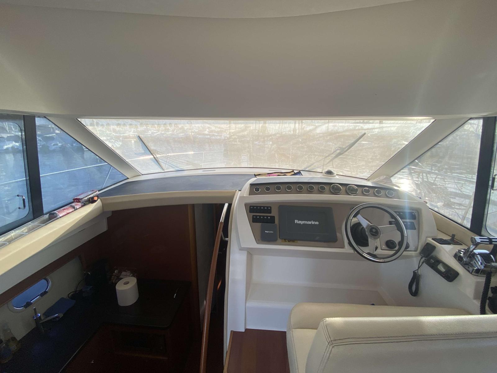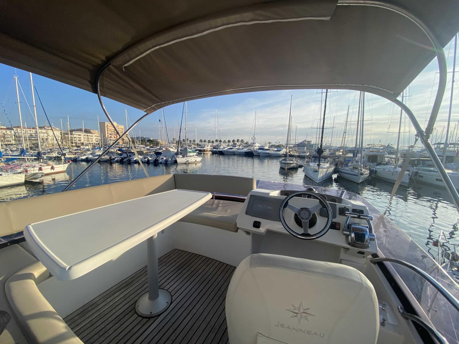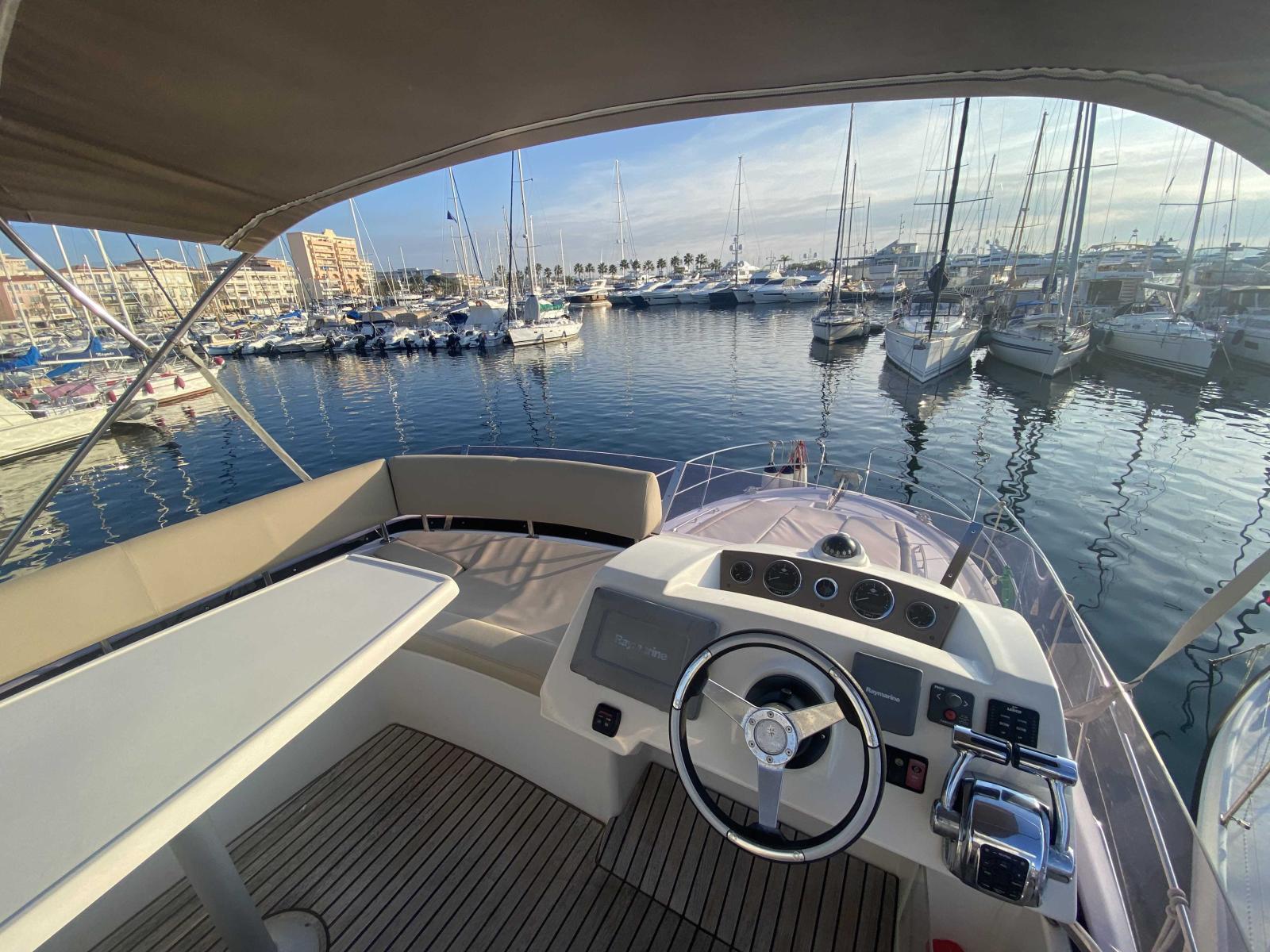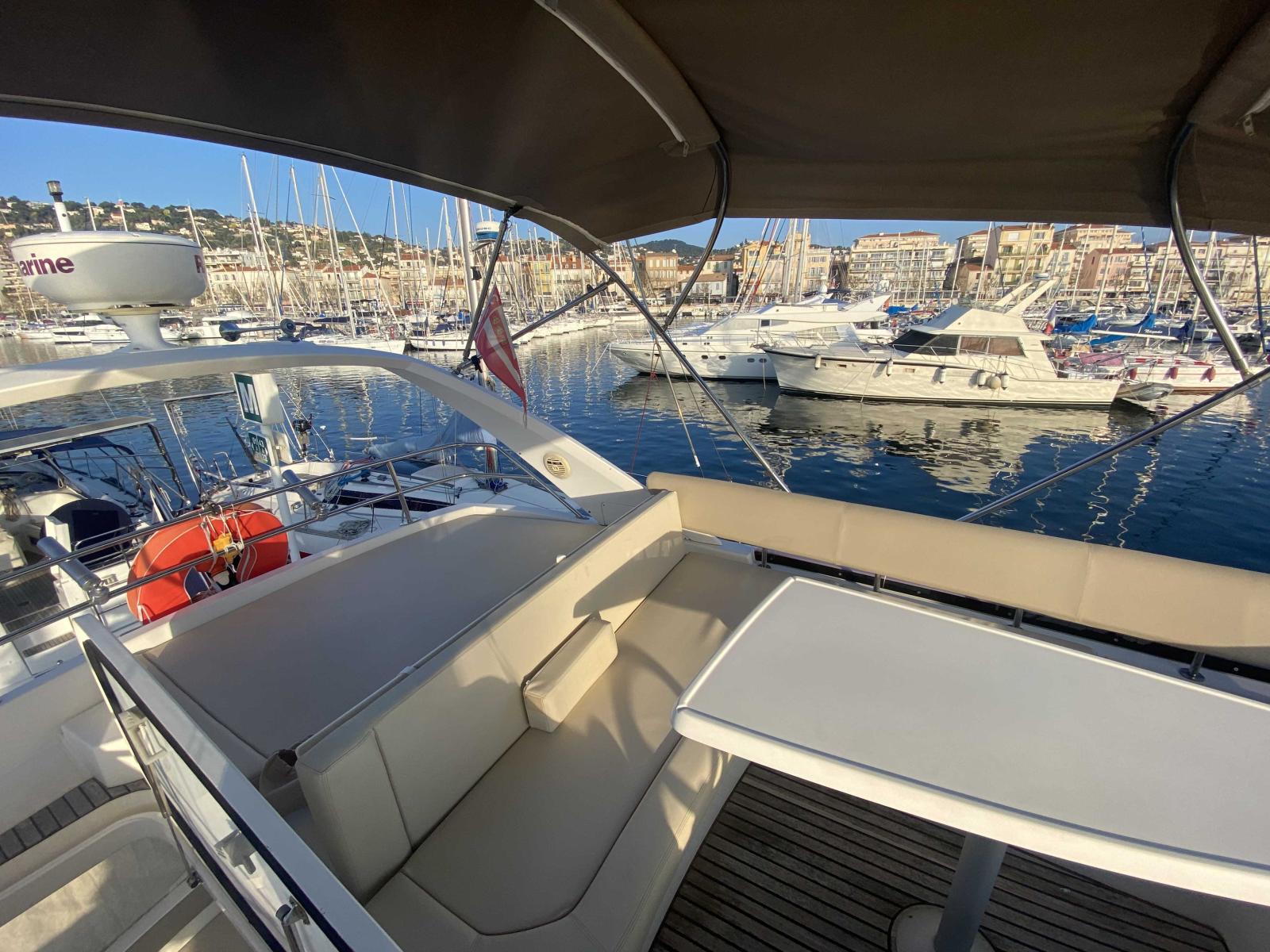 Le Fly-bridge offre un espace de détente et de pilotage supplémentaire, idéal pour profiter de la vue et bien protégé du soleil via un Bimini pouvant être utilisé en navigation,