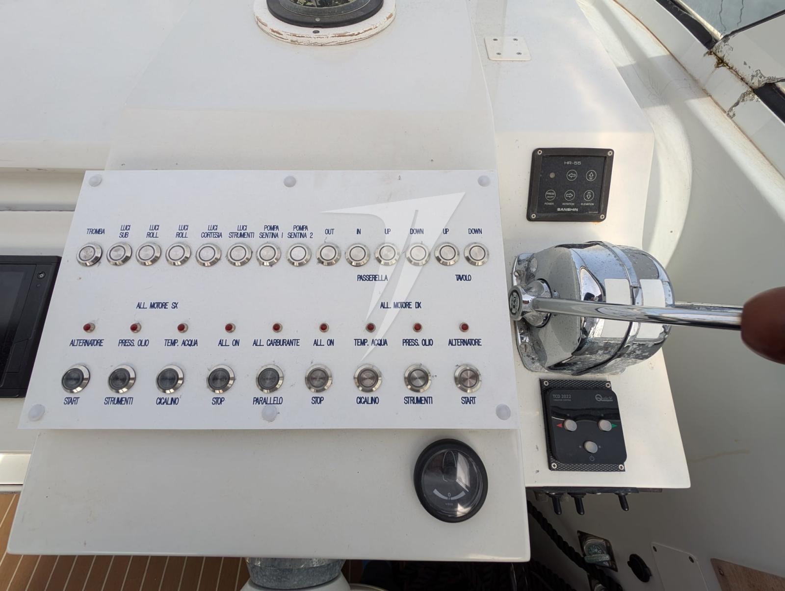 6 Batteries (2024), Propulseur de poupe (Quick 2024), Flaps électriques, Spots sous-marins, Passerelle (idraulica), Cockpit en teck (sintetico), Guindeau électrique (con telecomando e rimando in pozzetto), table de cockpit, Table pliante de salon (trasformabile in letto).