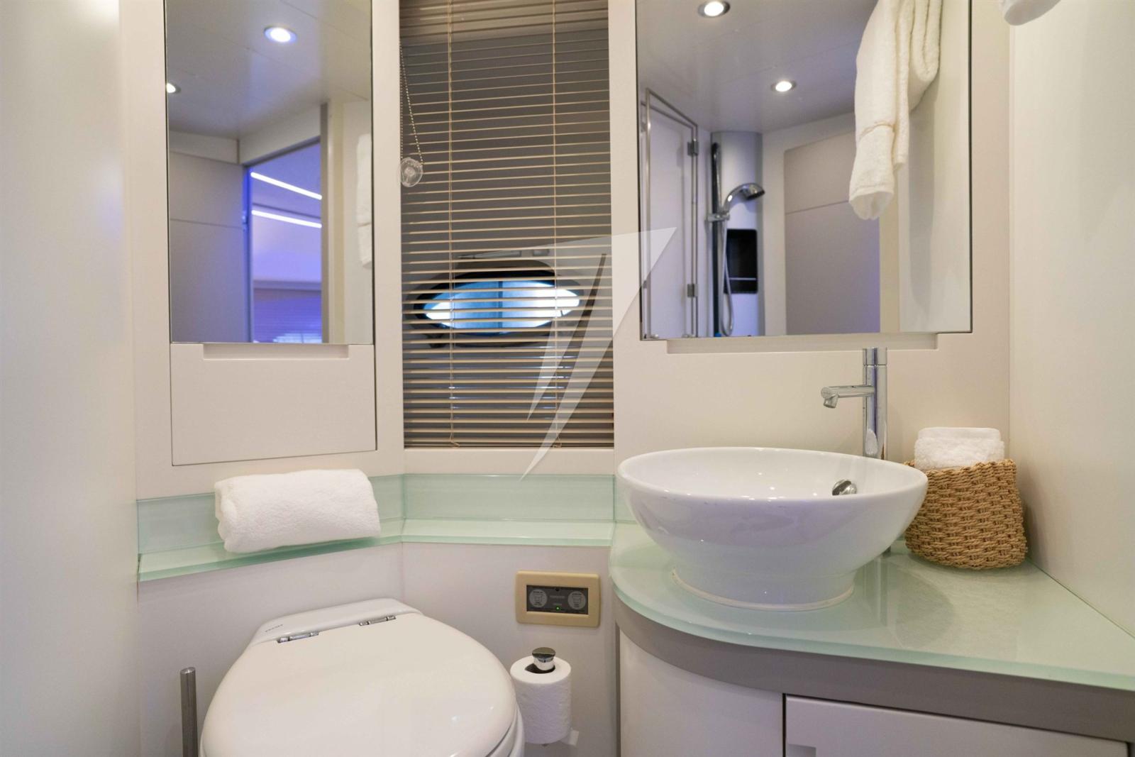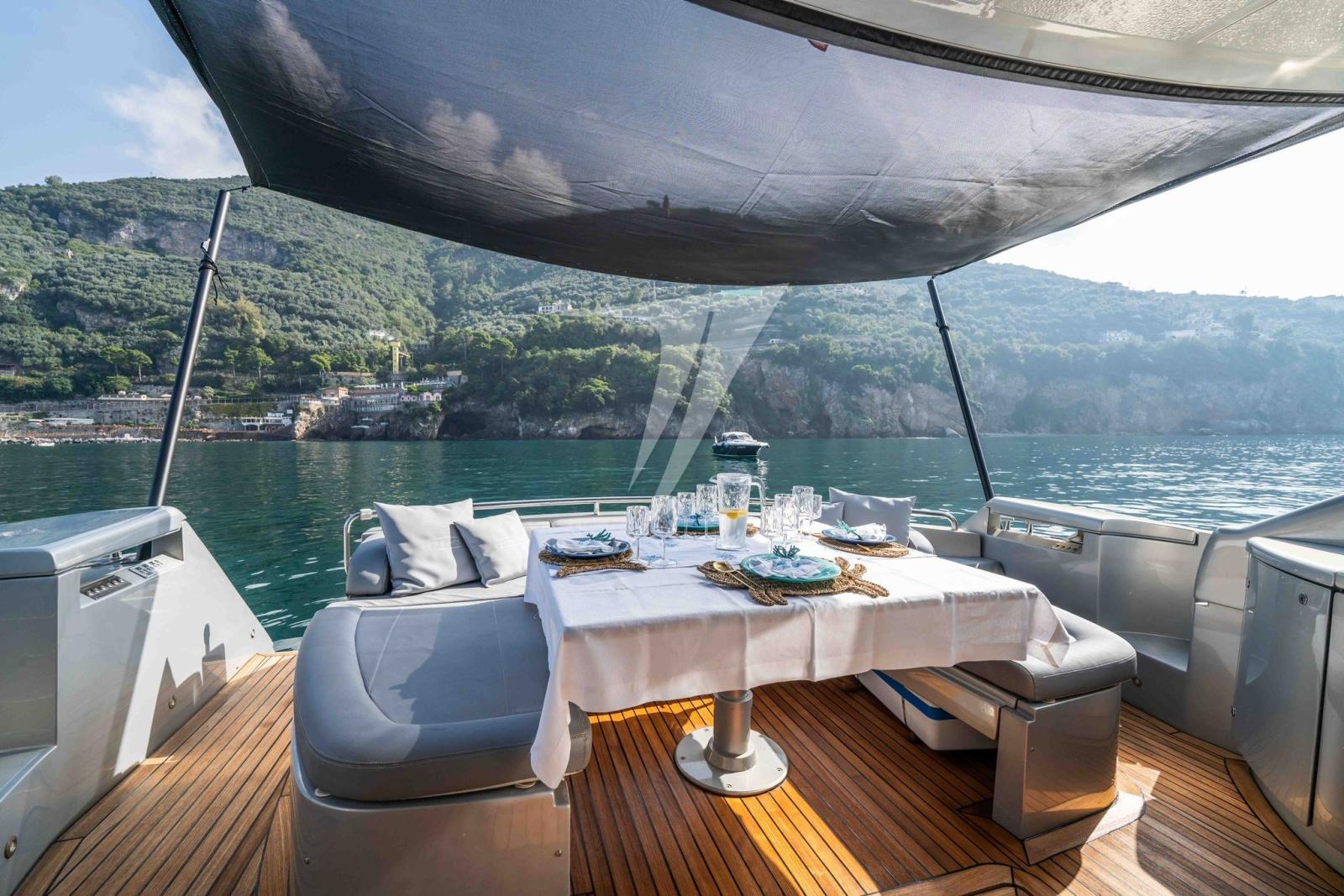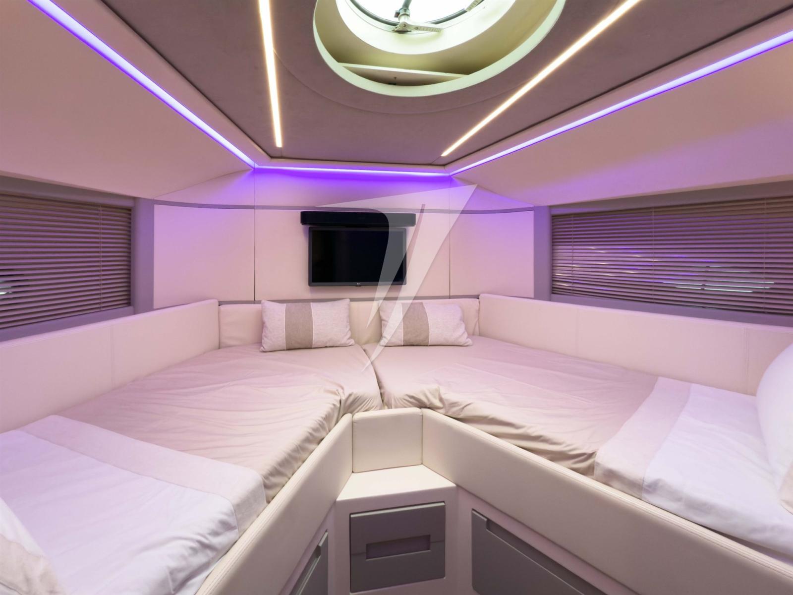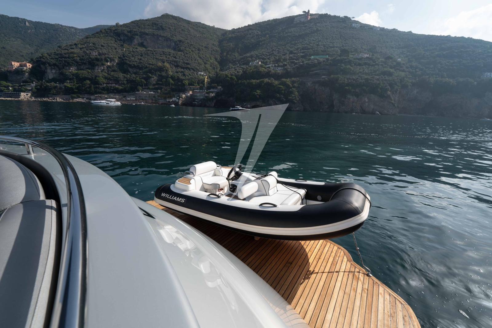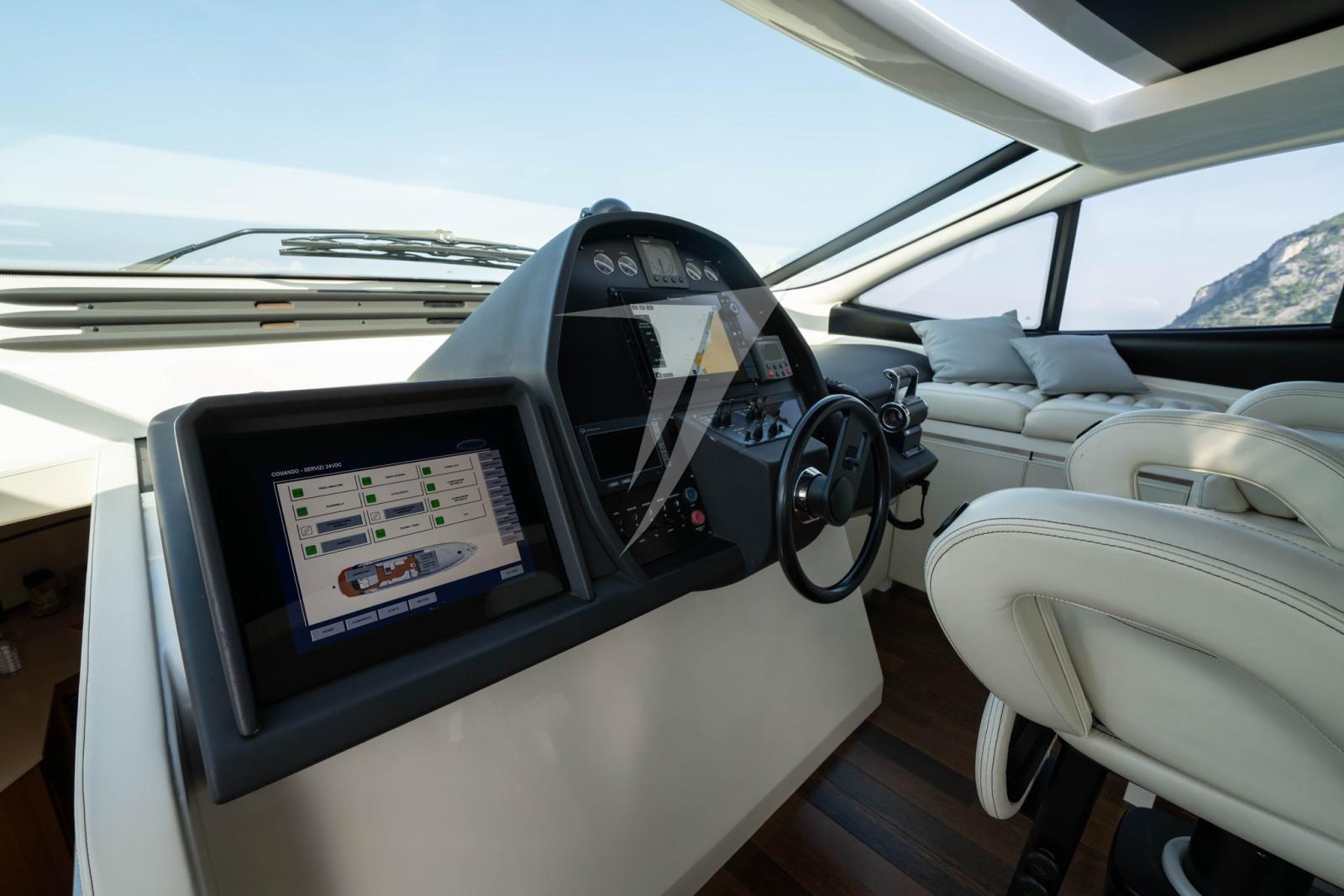 Alarme gaz, Alarme moteur, Alarme de pompe de cale, Eau sous pression, Douche de cockpit, Flaps hydrauliques, Garage à annexe, Hard top, Extincteur(s) fixe(s), Compresseur de plongée, Indicateurs de flaps, Lavabo dans le cockpit, Éclairage de courtoisie, Spots sous-marins, Passerelle, Pompe de cale automatique, Pompe de cale manuelle, Porte latérale, Cockpit en teck, Prise de quai, Connexion eau sous pression à quai, Guindeau électrique, Echelle de bain, table de cockpit, Table pliante de salon, Corne.