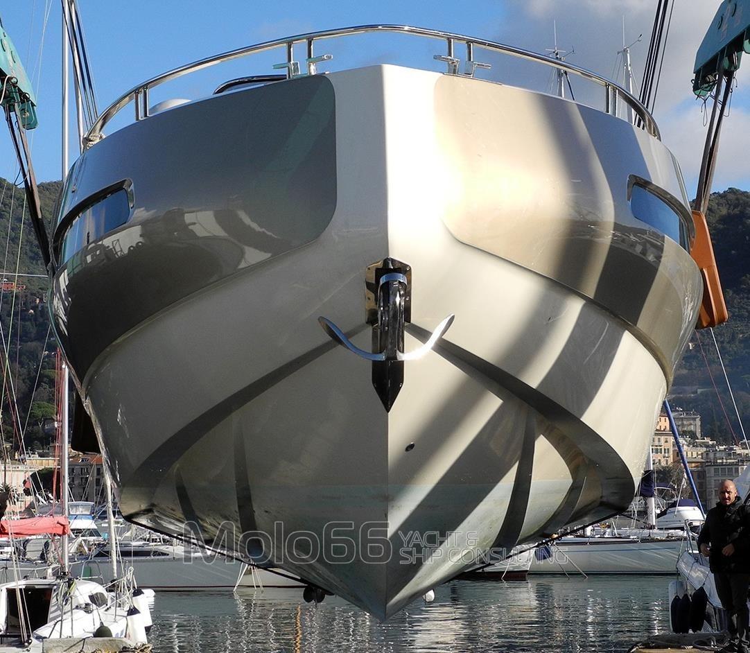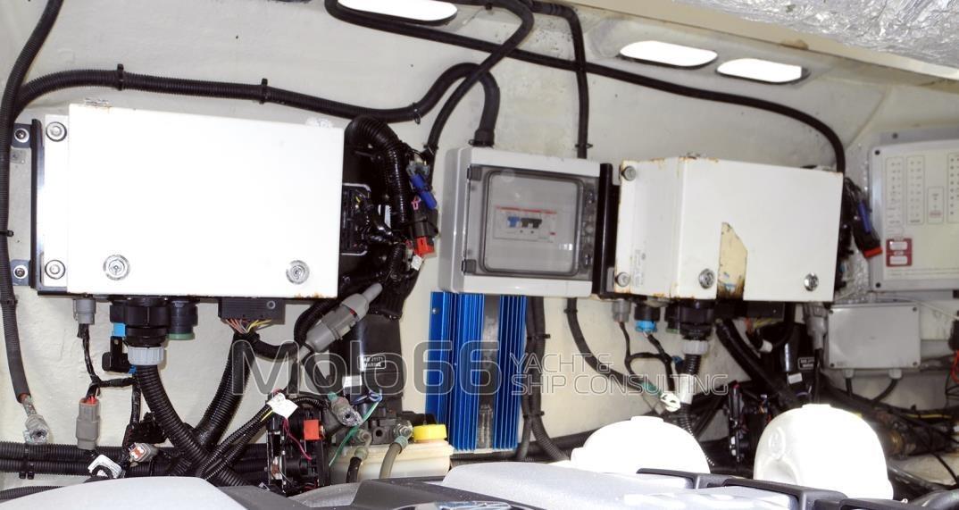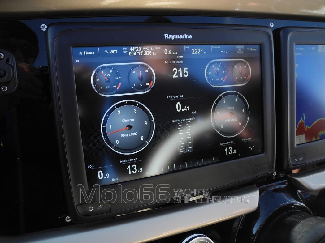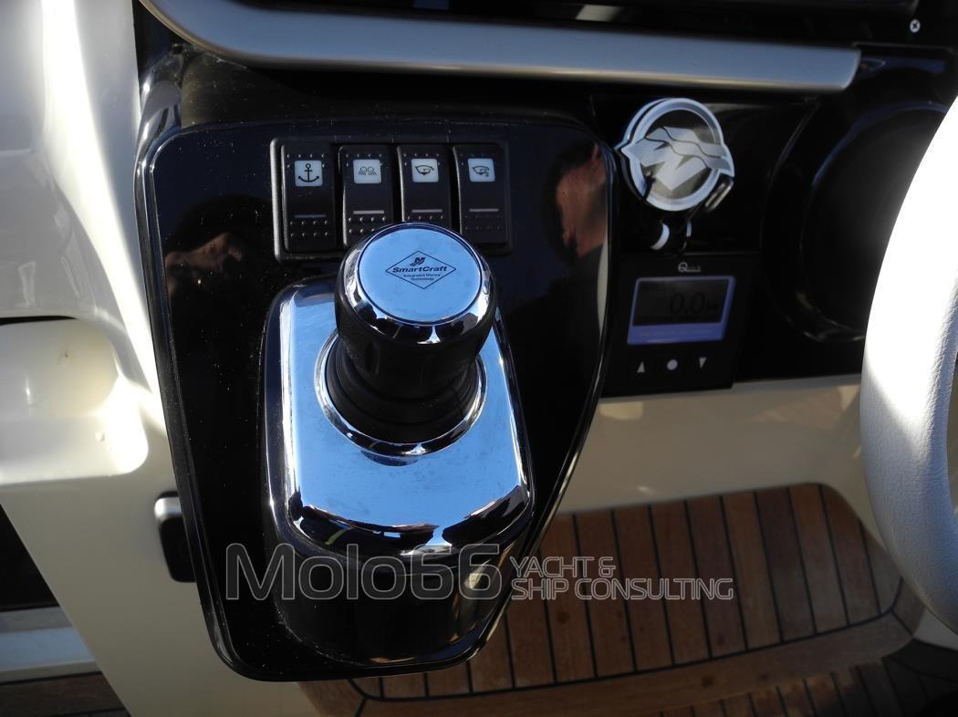 Alarme moteur, Alarme de pompe de cale, Ouverture du compartiment moteur électrique, Eau sous pression, Passavant en teck, Couleur spéciale, Douche de cockpit, Phare de poursuite, Flaps hydrauliques, Hard top, Extincteur(s) fixe(s), Indicateurs de flaps, Lavage de chaine, Lavabo dans le cockpit, Spots sous-marins, Passerelle, Plateforme arrière, Cockpit en teck, Prise de quai, Onduleur, Echelle de bain, table de cockpit, Annexe, Corne, T-Top, Pont en teck.