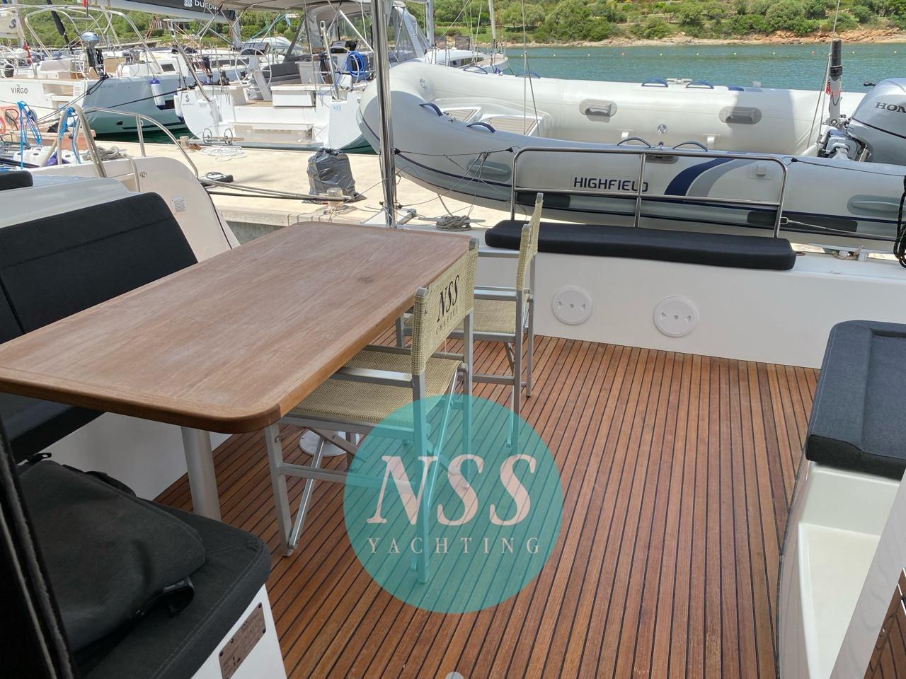Douche de cockpit, Bossoirs pour annexe, Éclairage de courtoisie, Moteur d'annexe, Porte latérale, Cockpit en teck, Prise de quai, Connexion eau sous pression à quai, Guindeau électrique, Echelle de bain, Chaise support HB, table de cockpit, Annexe (HIGHFIELD CLASSIC), 3 Winch, Windex.