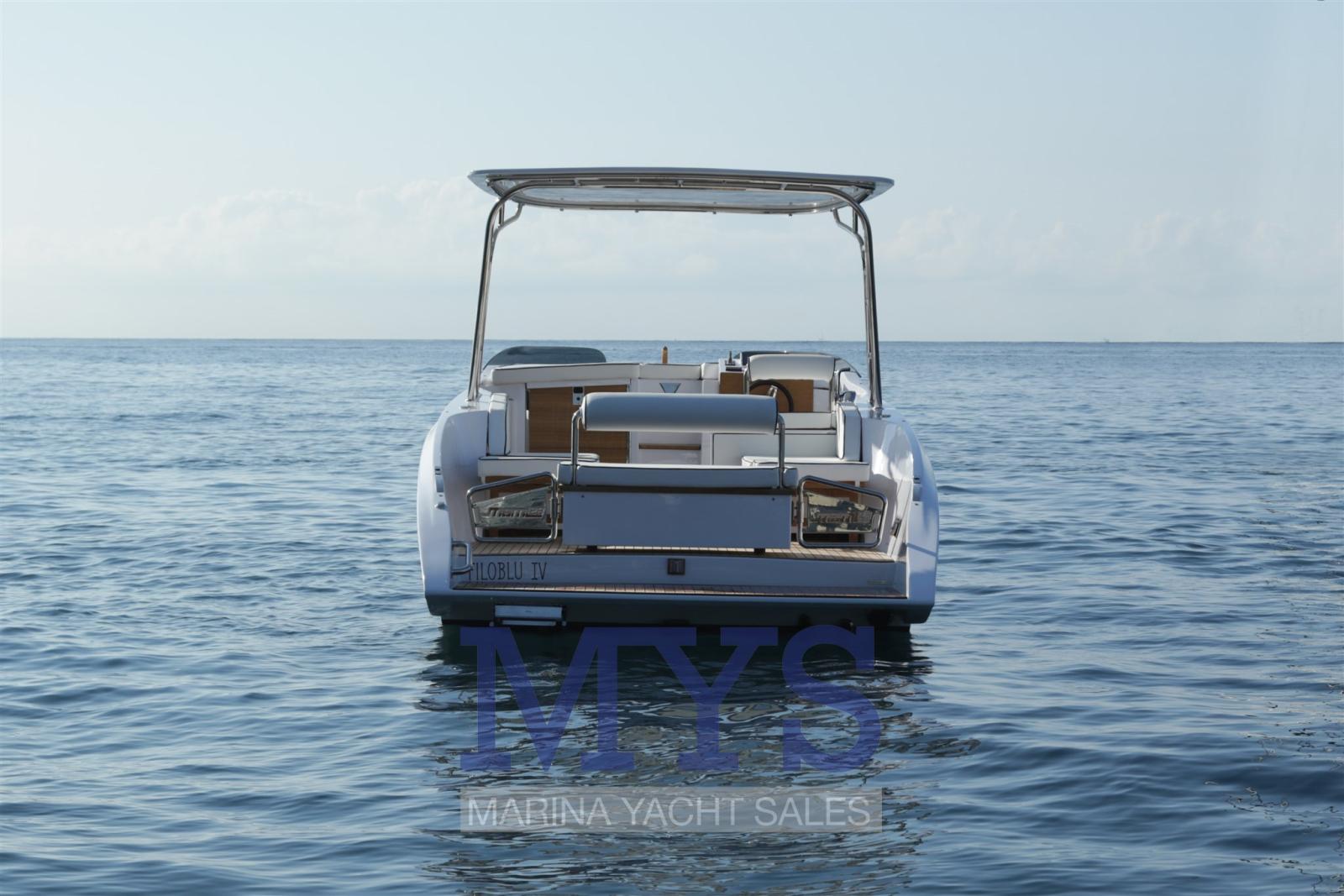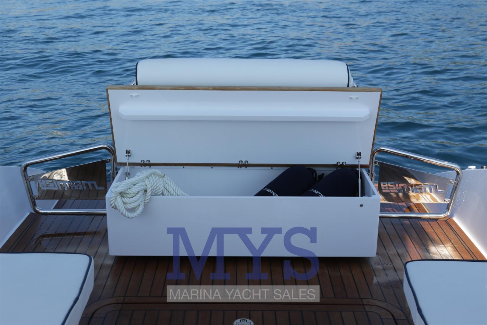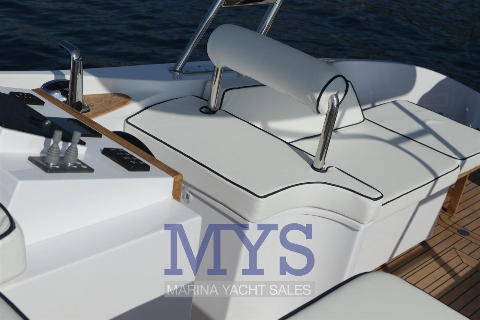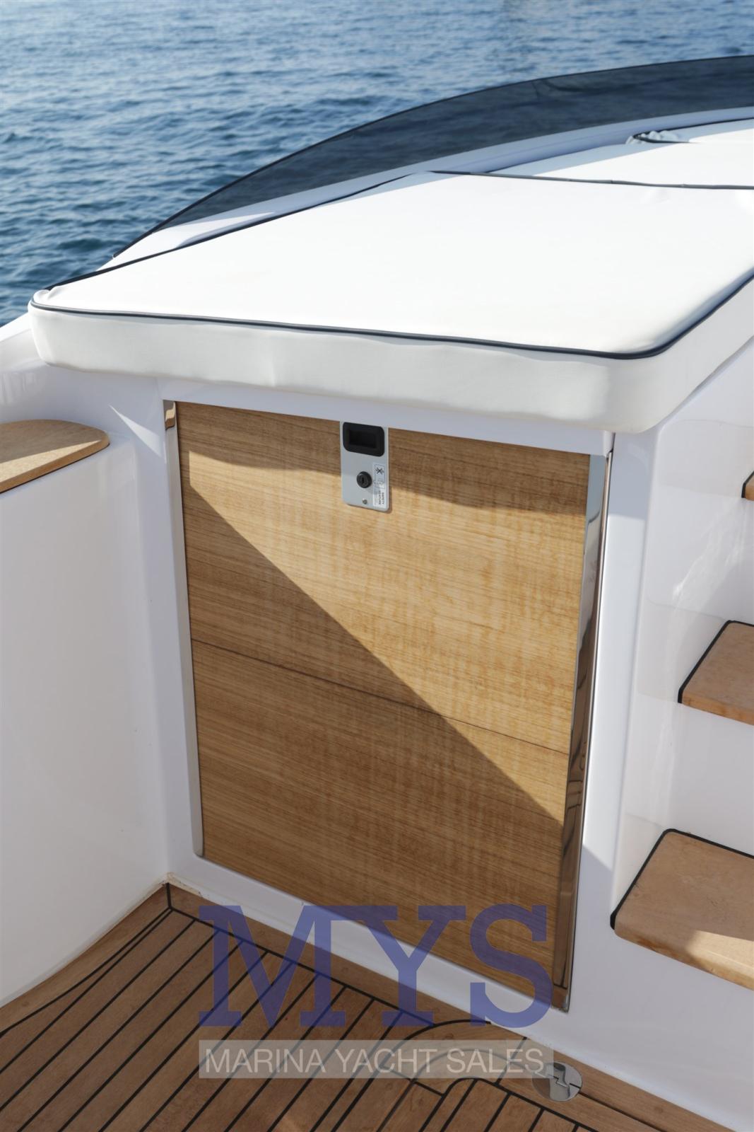 Alarme gaz, Alarme moteur, Alarme de pompe de cale, Eau sous pression, 3 Batteries, Taquets pliants, Douche de cockpit, Propulseur de poupe (Solo con monomotore), Flaps électriques, Extincteur(s) fixe(s), Indicateurs de flaps, Éclairage de courtoisie, Plateforme arrière (Teak), Pompe de cale automatique, Pompe de cale manuelle, Cockpit en teck, Prise de quai, Connexion eau sous pression à quai, Guindeau électrique, Echelle de bain, table de cockpit (idraulico), Corne, Pont en teck.