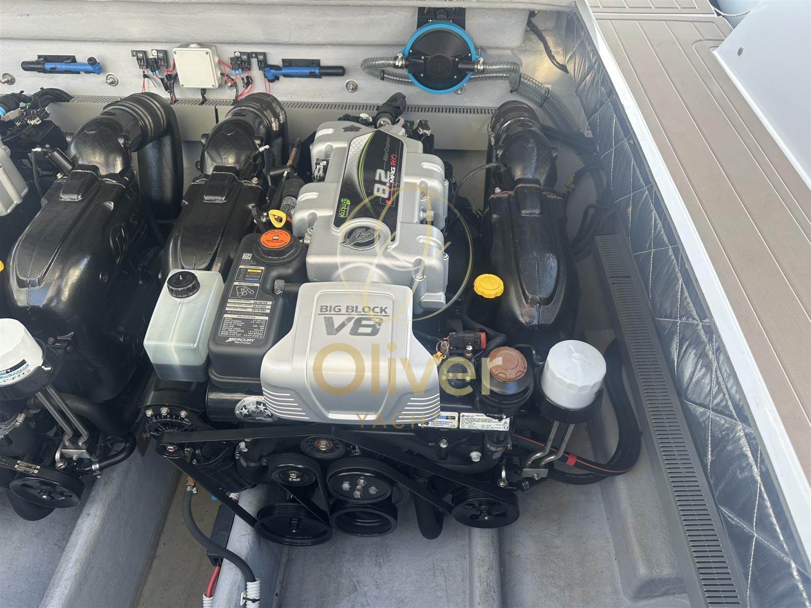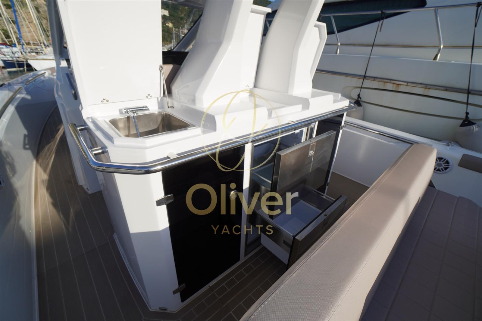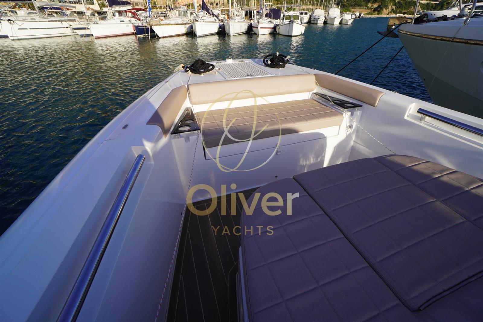 Alarme gaz, Alarme moteur, Alarme de pompe de cale, Auto Dynamic Trim Interceptor, Eau sous pression, Taquets pliants, Passavant en teck, Douche de cockpit, Extincteur(s) fixe(s), Plateforme arrière, Pompe de cale automatique, Pompe de cale manuelle, Cockpit en teck, Prise de quai, Connexion eau sous pression à quai, Guindeau électrique, Echelle de bain, Table, table de cockpit, Corne, T-Top.