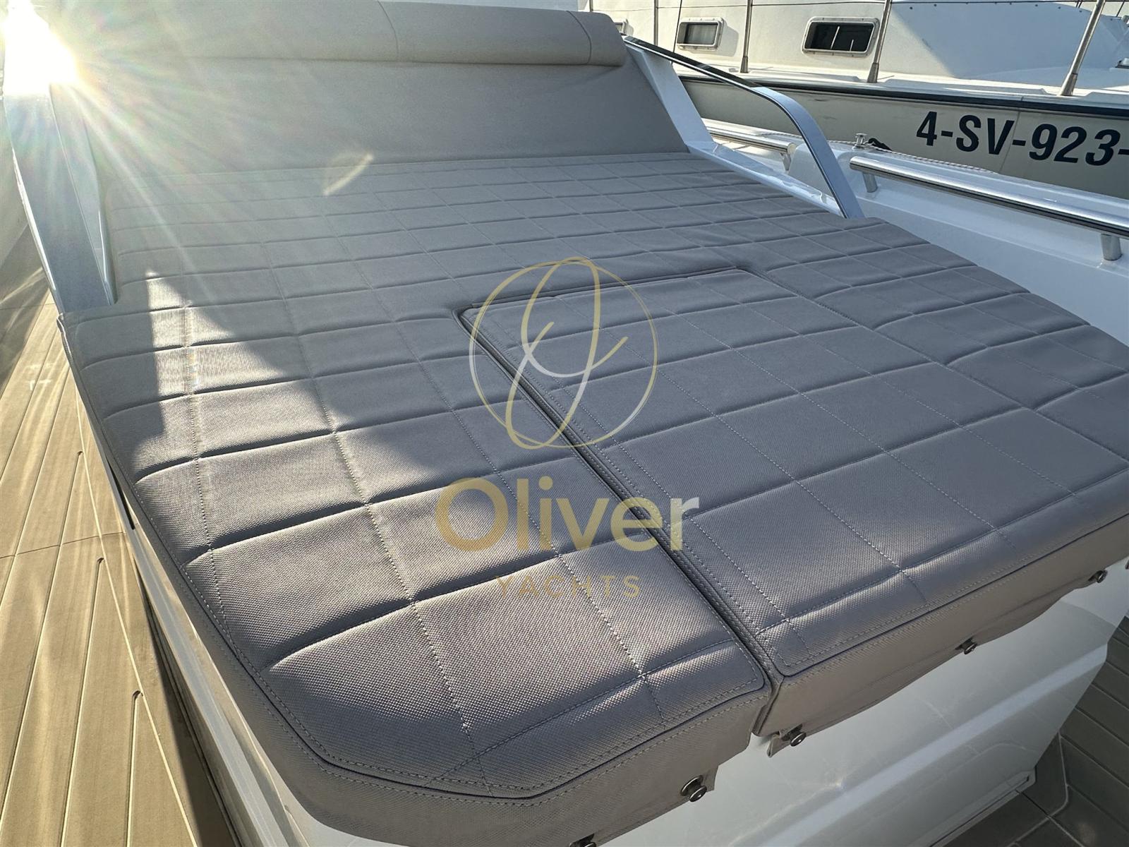 Coussins - Table d’extérieur - Cabine open space - Interrupteur à batterie - Prise de quai avec chargeur et câble - Onduleur - Treuil électrique avec ancre et chaîne galvanisées - Réfrigérateur externe - Évier extérieur - Douche extérieure avec système d’eau douce - Échelle d’escalade