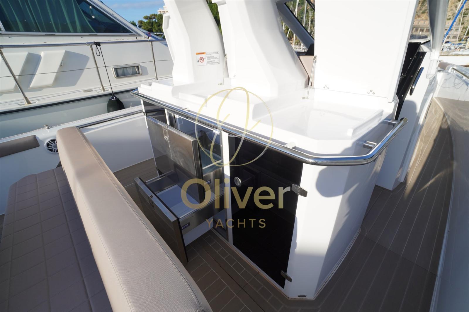 À bord, les espaces ont été optimisés pour un maximum de confort. Le pont principal se caractérise par deux grands bains de soleil, un à l’avant et un à l’arrière convertible en sièges pour la dînette, des zones conviviales équipées de sièges ergonomiques, d’un évier externe, d’un double réfrigérateur, idéal pour recevoir des invités et profiter du soleil et de la mer.