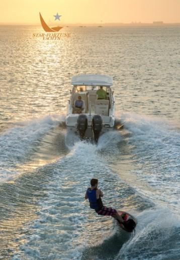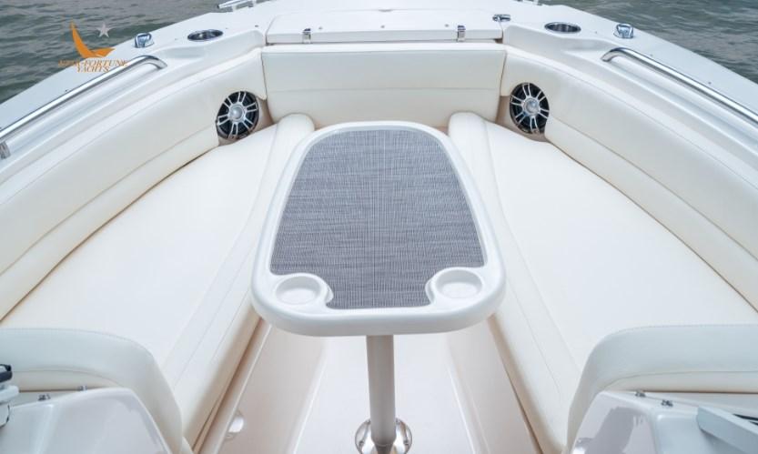 Ce bateau insubmersible à double console de 25 pieds est un bateau de pêche en eau salée familial avec des sièges de luxe et beaucoup d’espace pour ranger facilement l’équipement de pêche sportive, les jouets nautiques et