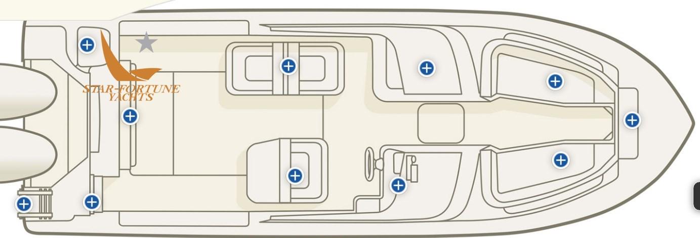 Alarme gaz, Alarme moteur, Alarme de pompe de cale, Auto Dynamic Trim Interceptor, Eau sous pression, Trim hydraulique, Taquets pliants, Chargeur de batterie (opzionale), Couleur spéciale (opzionale), Douche de cockpit, Propulseur de poupe (opzionale e post vendita), Propulseur d'étrave (opzionale), Phares fixes arrière, Flaps hydrauliques, Crochet de remorquage pour ski nautique (opzionale), Hard top, Extincteur(s) fixe(s), Lavabo dans le cockpit (con piano in marmo naturale), Éclairage de courtoisie, Spots sous-marins (opzionale), Passerelle (opzionale), Pompe de cale automatique, Pompe de cale manuelle, Porte latérale (con scaletta da bagno), Prise de quai (opzionale), Connexion eau sous pression à quai, Onduleur (opzionale), Rollbar (Verniciato a polvere e trattato con metodo elettrolitico), Guindeau électrique, Echelle de bain, Système de filtration des eaux usées, Stabilisateurs (Opzionale Seakeeper), Chaise support HB, table de cockpit, Table pliante de salon (A prua e abbassandosi diventa un prendisole), Filières avec sortie latèrale, Corne, Winch électrique arrière, Winch électrique avant.