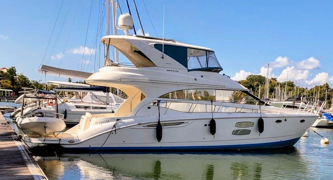 MERIDIAN 441 FLYBRIDGE de 2008, motorisé par 2 moteurs neufs de 480cv Cummins QSB 6.7 sous garantie. De nouvelles commandes électroniques ont été installées.