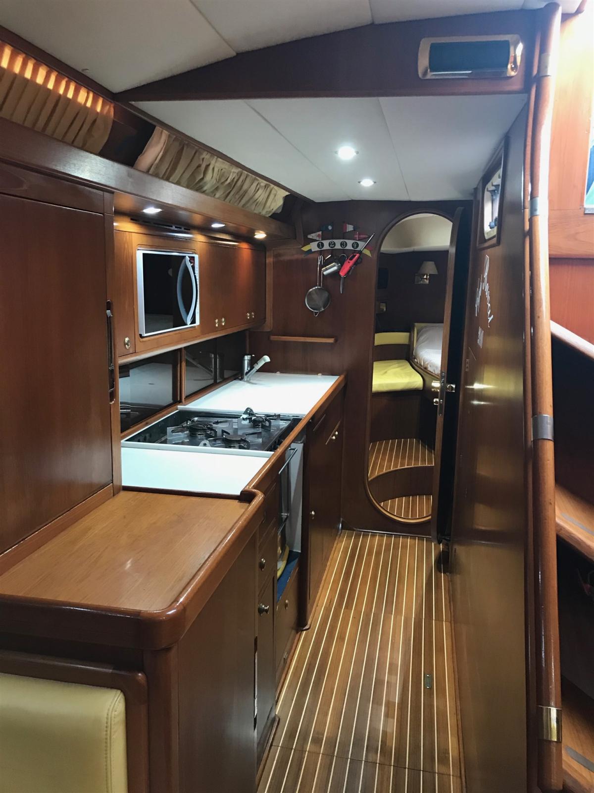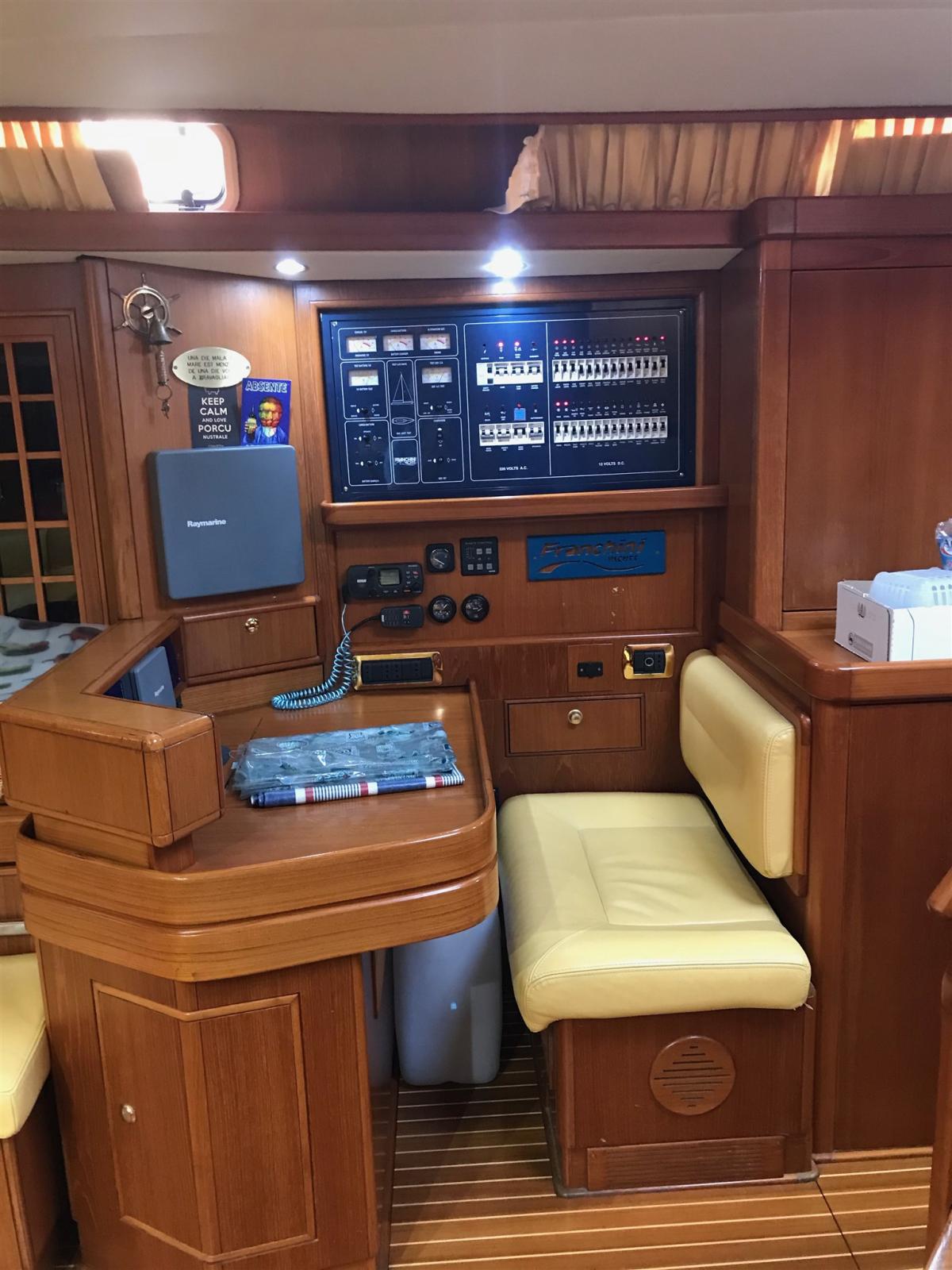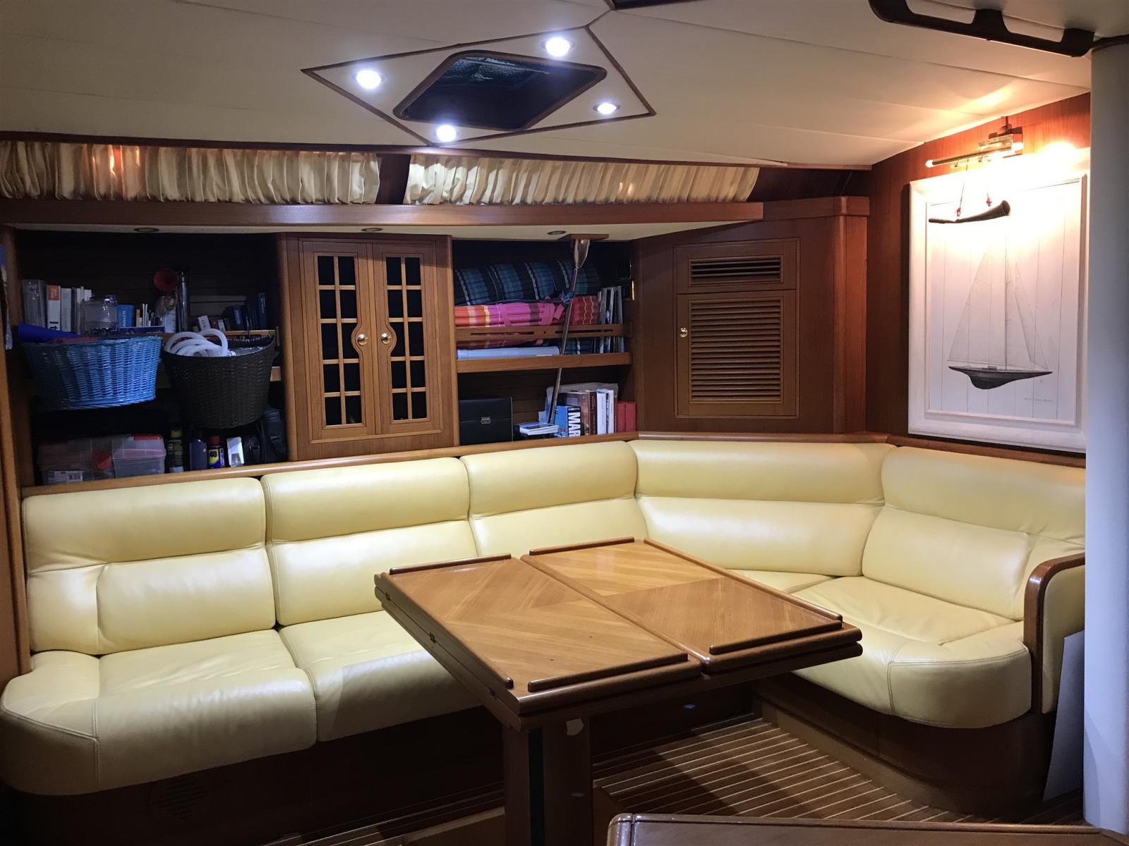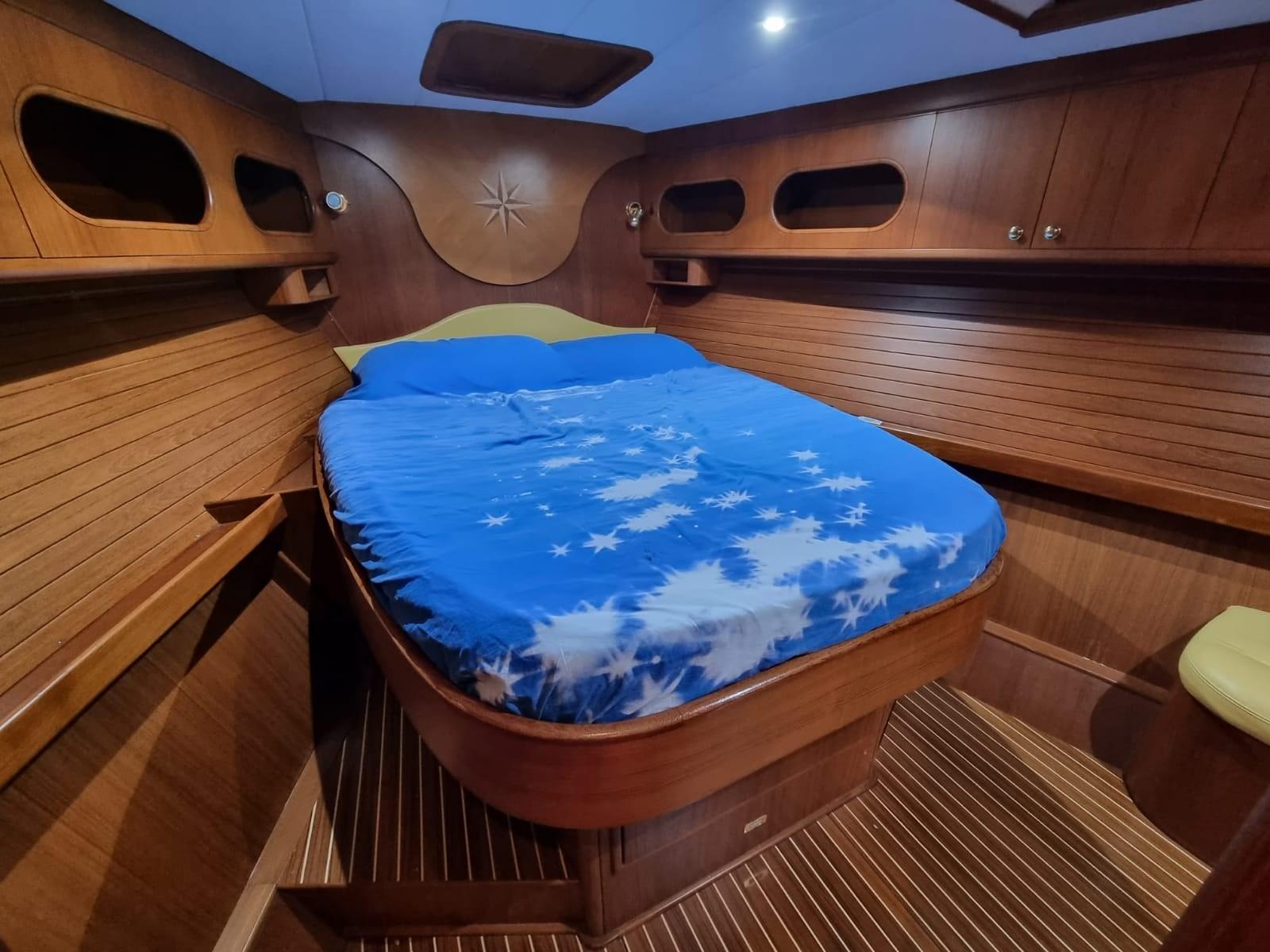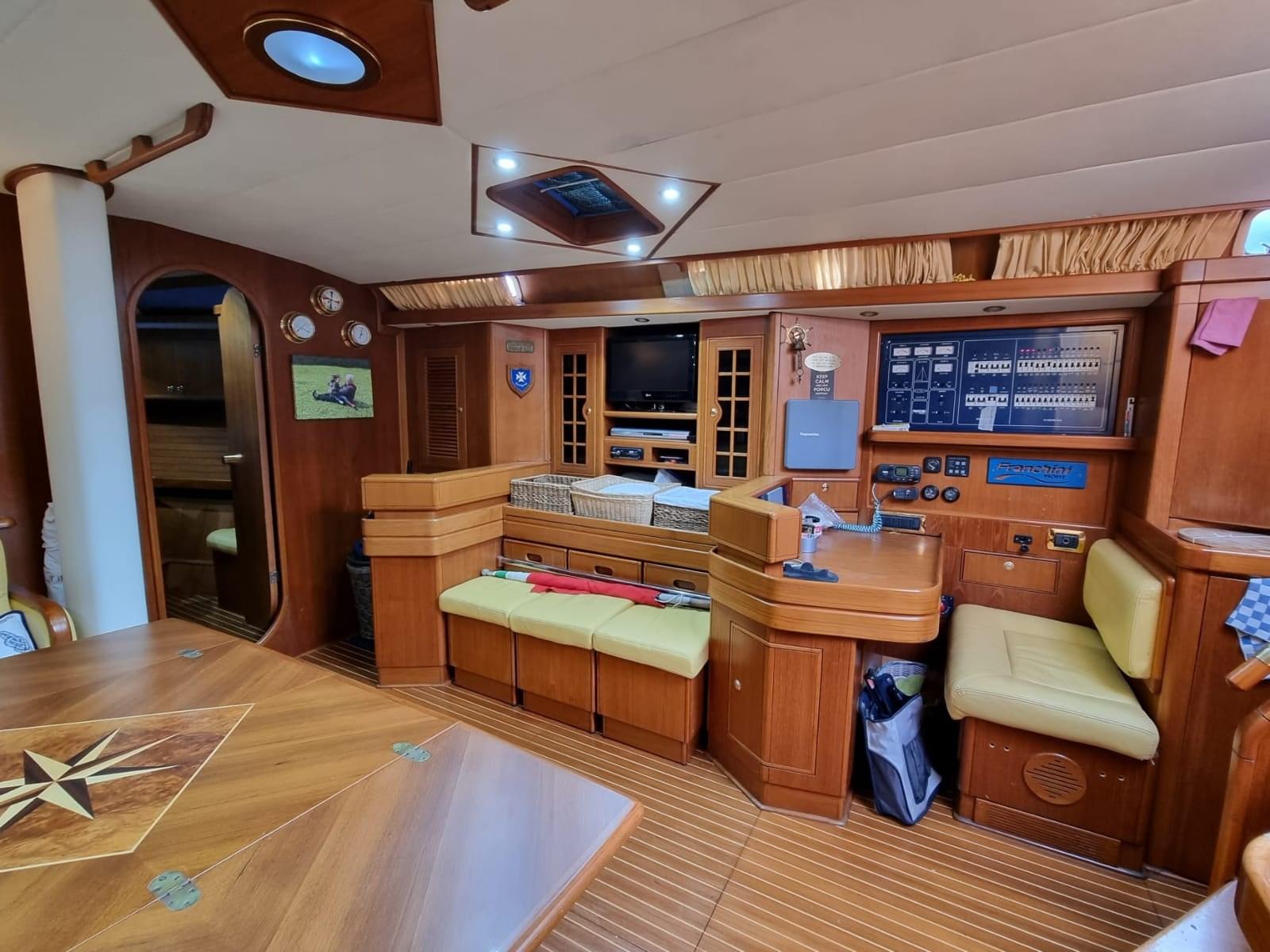 Franchini 53S 1996 avec Volvo Penta Dinette 145hp Table extensible carrée avec canapé en L en cuir ocre côté SN, table à cartes Dans la dinette côté droit avec instrumentation, Cuisine Côté droit vers la poupe, avec 3 brûleurs à gaz et four, Cabine d’invités avant Lit double, salle de bain dédiée avec WC, lavabo-étagère en marbre, cabine de douche séparée, Cabine invité Side sn avec 2 lits superposés et accès à la douche et à la salle de bain principale Cabine principale Avec lit double central, chaises, armoires et salle de bain dédiée avec lavabo en marbre, WC et cabine de douche séparée.