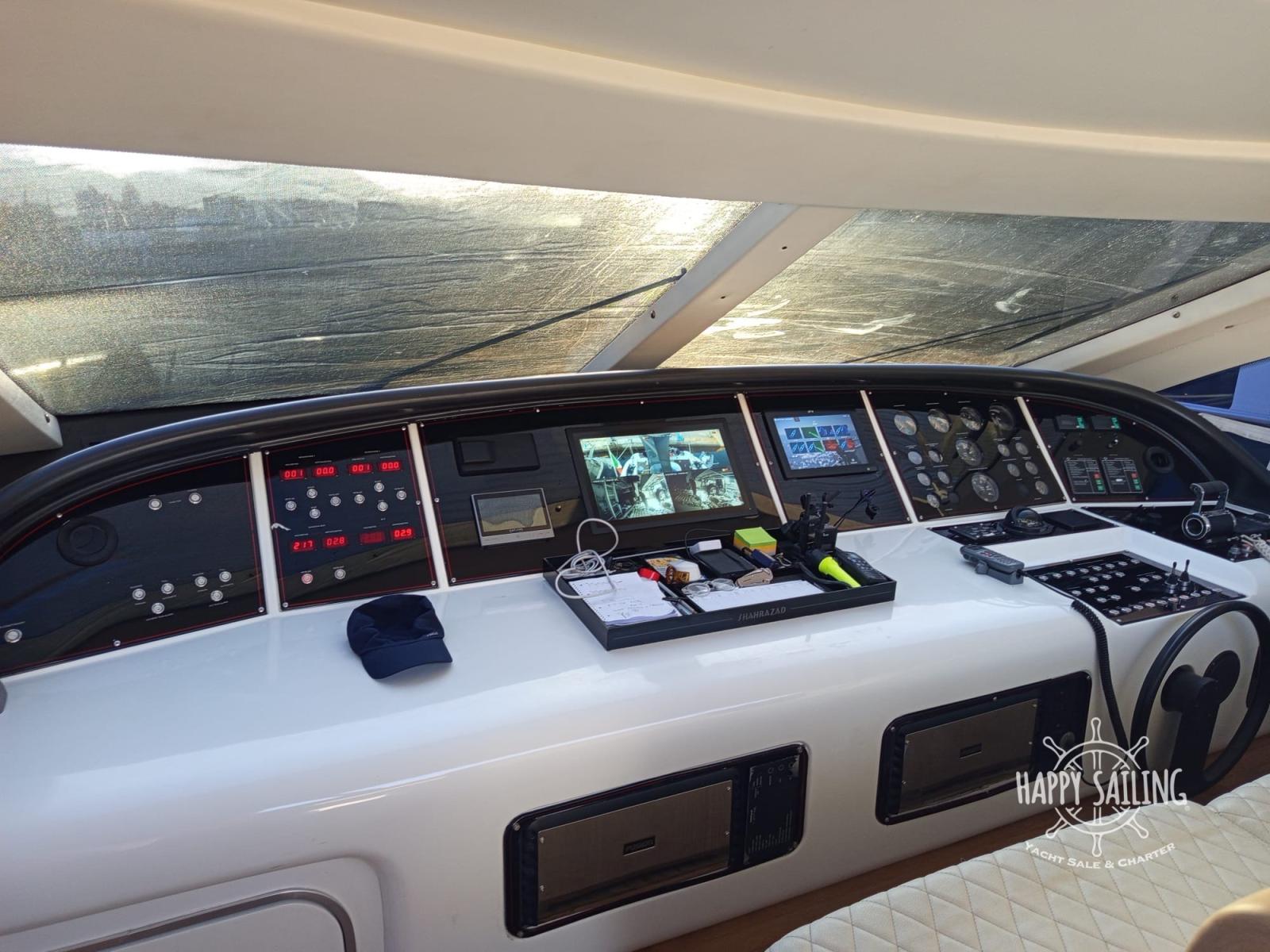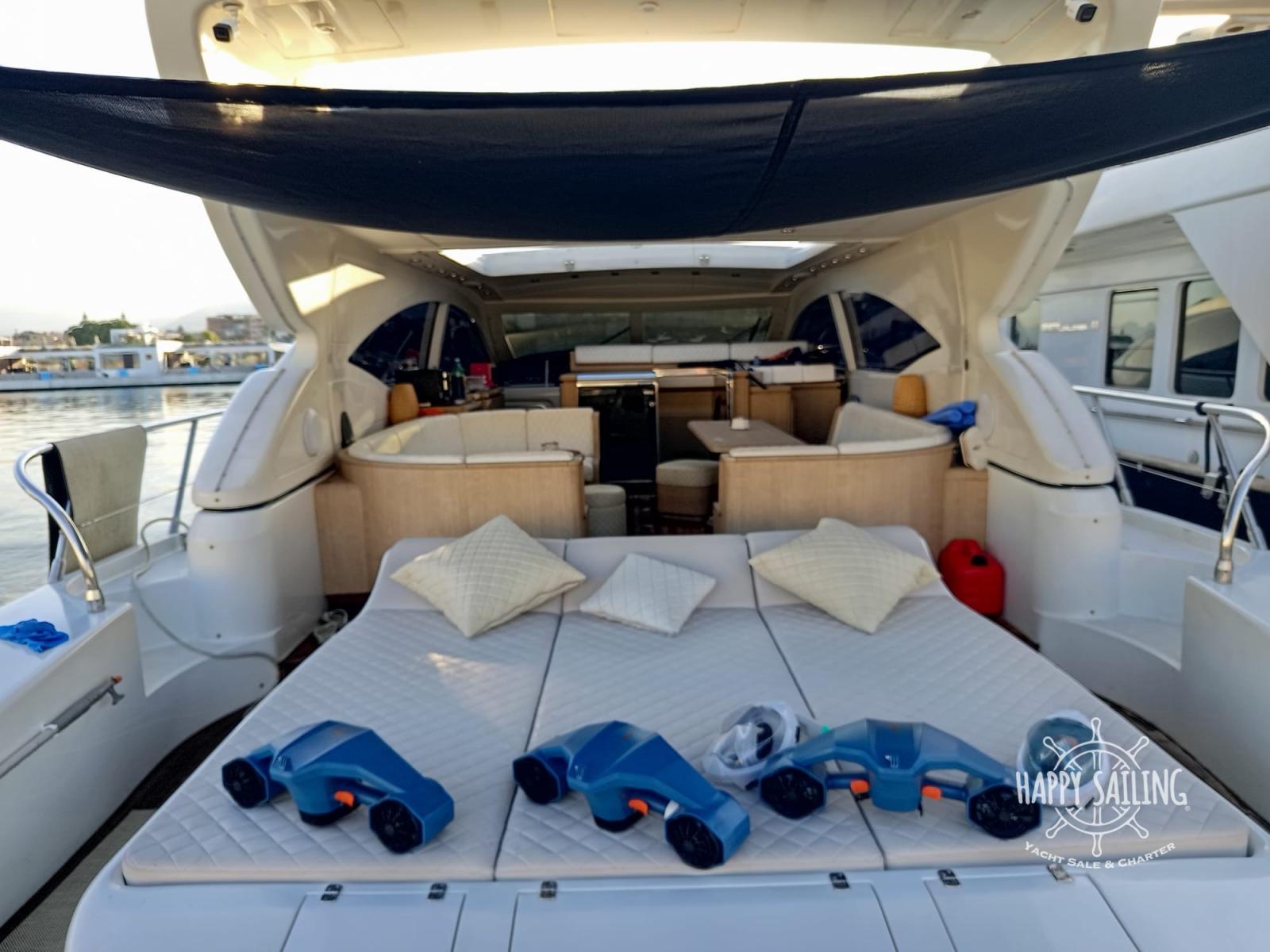 Alarme gaz, Alarme moteur, Alarme de pompe de cale, Eau sous pression, Douche de cockpit, Flaps hydrauliques, Garage à annexe, Hard top, Extincteur(s) fixe(s), Lavage de chaine, Lavabo dans le cockpit, Éclairage de courtoisie, Spots sous-marins, Passerelle, Plateforme arrière, Pompe de cale automatique, Porte latérale, Cockpit en teck, Guindeau électrique, table de cockpit, Annexe, Winch électrique arrière.