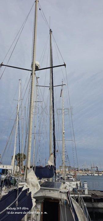 La housse d'origine est en parfait état, rigide et sans bosse. Les haubans et autres éléments de gréement sont également en parfait état, sans changement des points d'ancrage d'origine. J'ai ajouté du matériel supplémentaire et changé les cordages cette année, avec 100 mètres de cordage neuf de 8mm.
