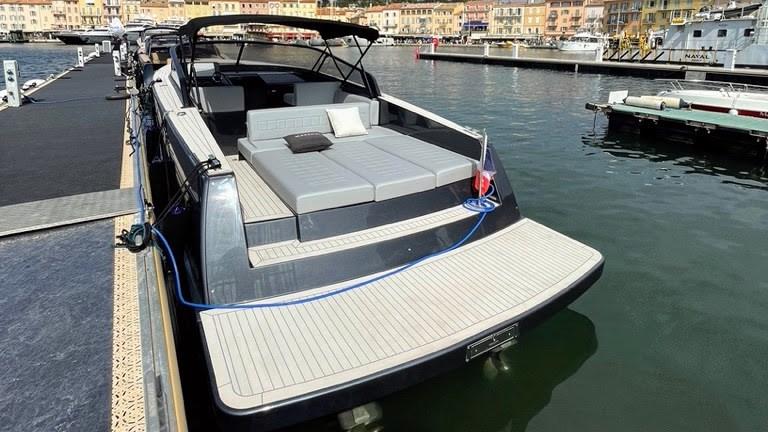 Alarme moteur, Alarme de pompe de cale, Ancre (Hydraulique rétractable), Ouverture du compartiment moteur électrique, Eau sous pression, 3 Batteries, Taquets pliants, Passavant en teck, Couleur spéciale (Dark Grey), Douche de cockpit, 2 Flaps électriques, Extincteur(s) fixe(s), Indicateurs de flaps, Lavabo dans le cockpit, Éclairage de courtoisie, Plateforme arrière (Flexiteek), Pompe de cale automatique, Cockpit en teck (Flexiteek), Prise de quai, Guindeau électrique, Echelle de bain, Pont en teck (Flexiteek).