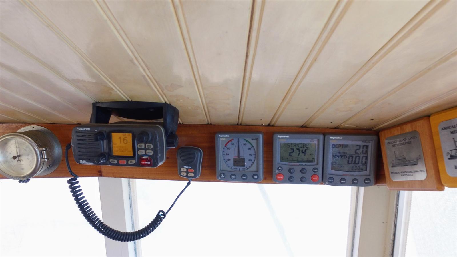 Compteur de chaîne (sur télécommande), Montre de bord, DSC VHF (NAVICOM RT 650), Pilote automatique (Raymarine ST6002 + avec repetiteur fly), Plotter GPS, Radio VHF (NAVICOM portable), Siège copilote, Sondeur (Raymarine ST60).
