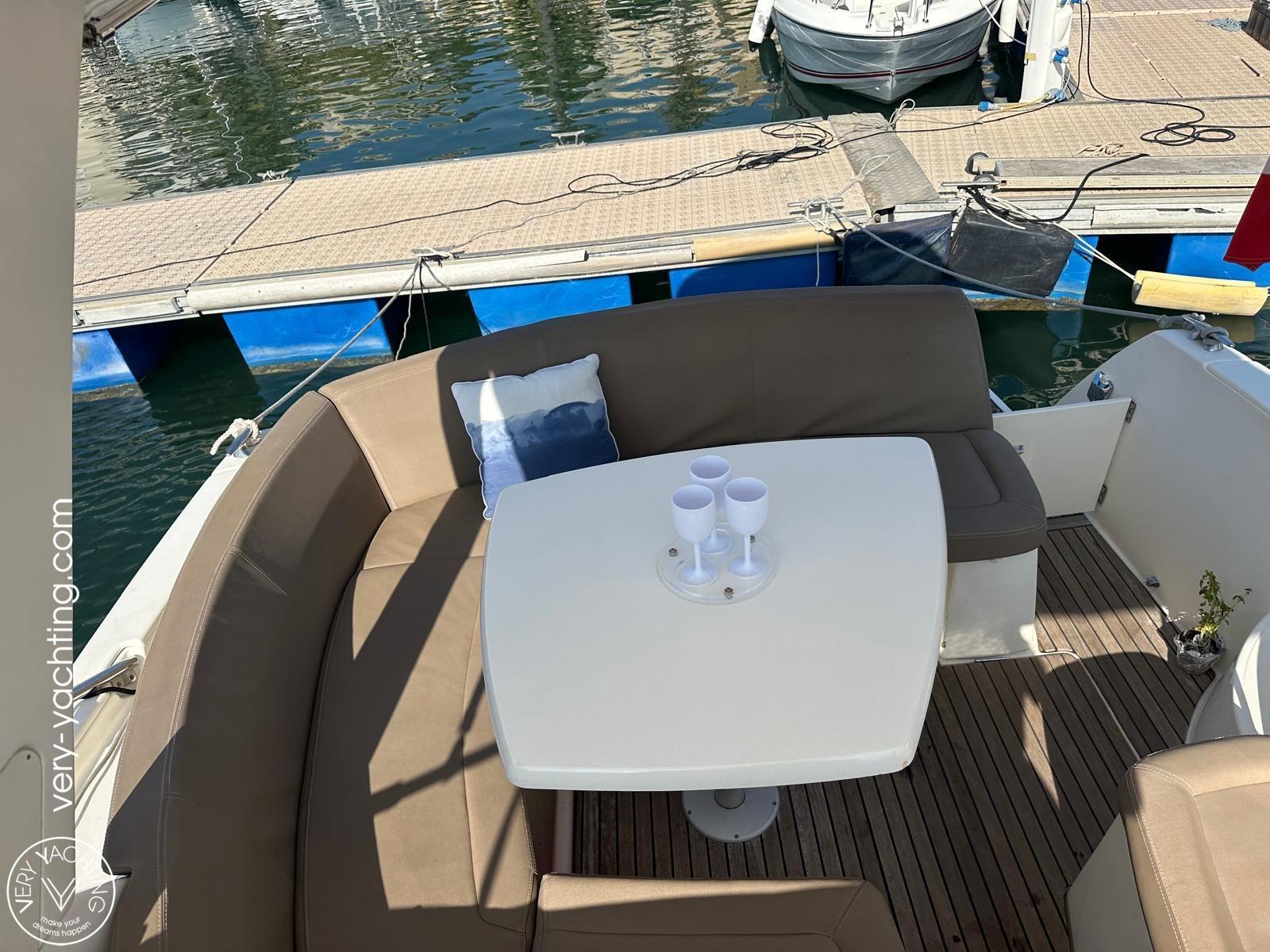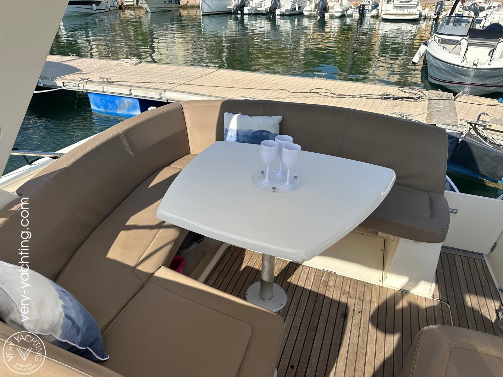 Ancre (Chaine 20m), 3 Batteries (1 service, 1 moteur, 1 prop (2023)), Douche de cockpit, Extincteur(s) fixe(s), Plateforme arrière (teck), Cockpit en teck, Prise de quai, Guindeau électrique, Echelle de bain, table de cockpit.